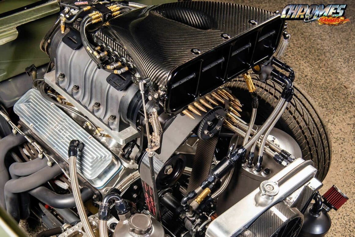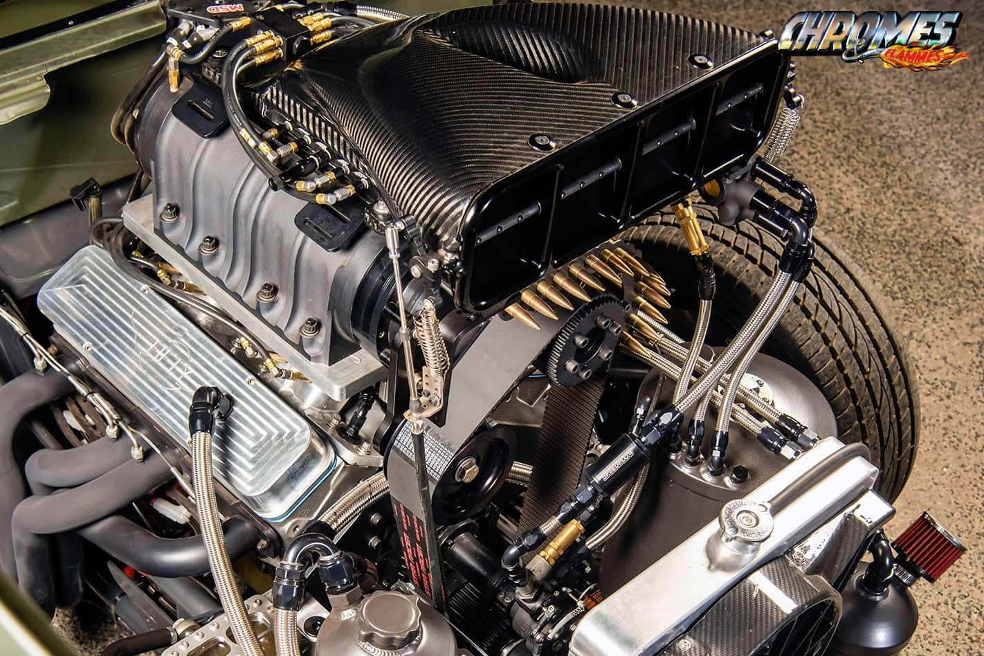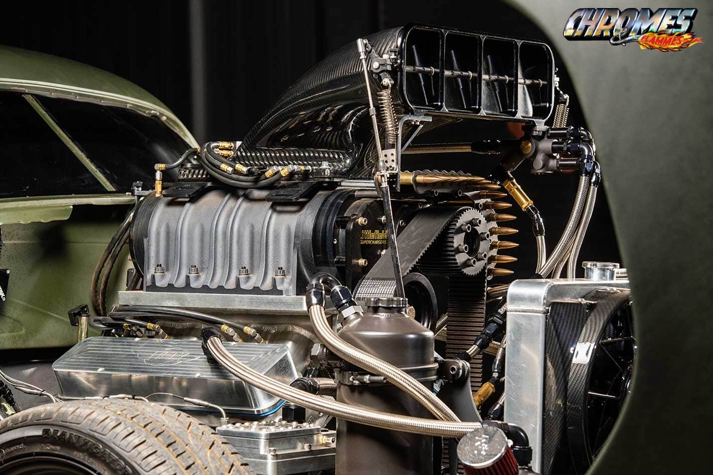 L’intérieur dispose également d’une cage robuste et de nombreuses broches destinées au renfort de la carrosserie. Le Chevy 400ci est coiffé d’un compresseur Littlefield : “Derek Paulik construit des moteurs pour moi depuis des années, donc c’était une évidence de s’en tenir à ce qui fonctionne. L’extrémité inférieure est la même, mais nous avons changé les têtes, le collecteur, le compresseur plus grand et plus gros. La seule pièce non modifiée qui restait sur la voiture était le levier de vitesses Lokar, que je voulais garder parce qu’il avait une tige en acier pour la liaison de changement de vitesse”, m’a expliqué Geoff Black…