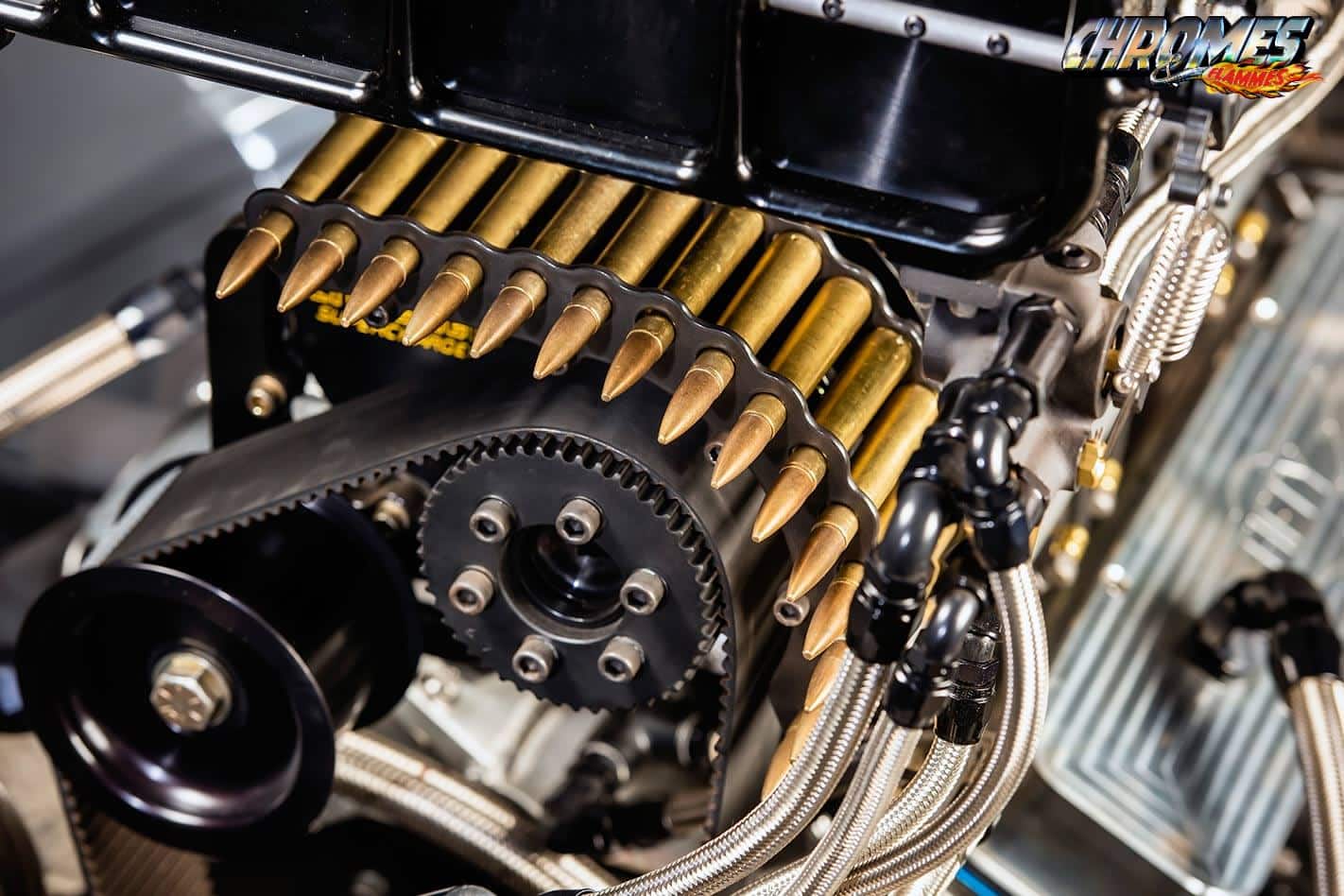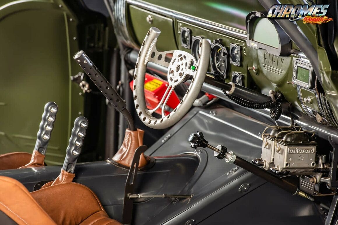 “La plupart des voitures d’épuisement ont une barre à quatre bras très courte, environ la moitié de la longueur qu’elle aurait normalement”...Bien que la bagnole n’a pas vraiment été conçue pour se connecter sur une piste, les Blacky’s estiment pouvoir la faire fonctionner sur piste moyennant quelques ajustements. Cela vaudrait la peine d’être vu ! Le tableau de bord d’origine comprend un ensemble complet de compteurs de style aviation façon “Racepak”. À droite se trouvent les commandes du système d’airbag, et juste en dessous, les Blacky”s ont collé une pièce de 25cents américaine des années ’60, que Geoff a trouvé lorsqu’il a dépouillé la Chevy. Il s’est dit que c’était avec la voiture depuis si longtemps qu’elle devait y rester.