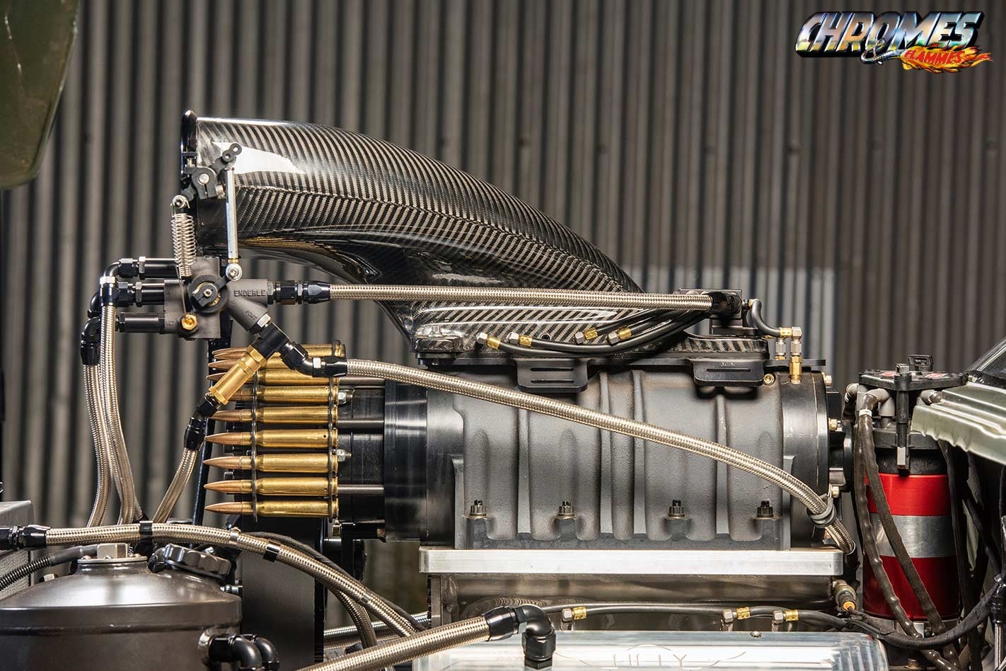 Il a ajouté : “Qu’allions-nous faire de ça ? Après quelques bières supplémentaires, j’ai a trouvé une solution: un canon de mitrailleuse qui correspond aux tuyaux d’échappement”…BNR Engines s’attribue le mérite d’être la seule entreprise en dehors de WA à avoir contribué à réaliser le job : “Derek a construit le moteur, mais Brett de BNR Engines l’a réglé. Je lui ai juste expédié tout le système d’alimentation, je suis passé directement à travers le moteur pour savoir ce qu’il y avait dedans, et il a tout réglé là-dessus. La voiture n’a pas du tout été sur un dyno, mais j’estime qu’elle fait quelque part autour de 1300-1400 chevaux”.