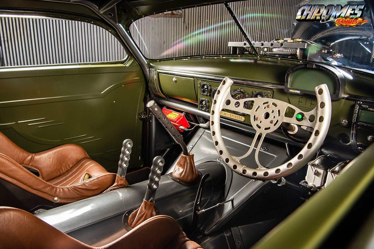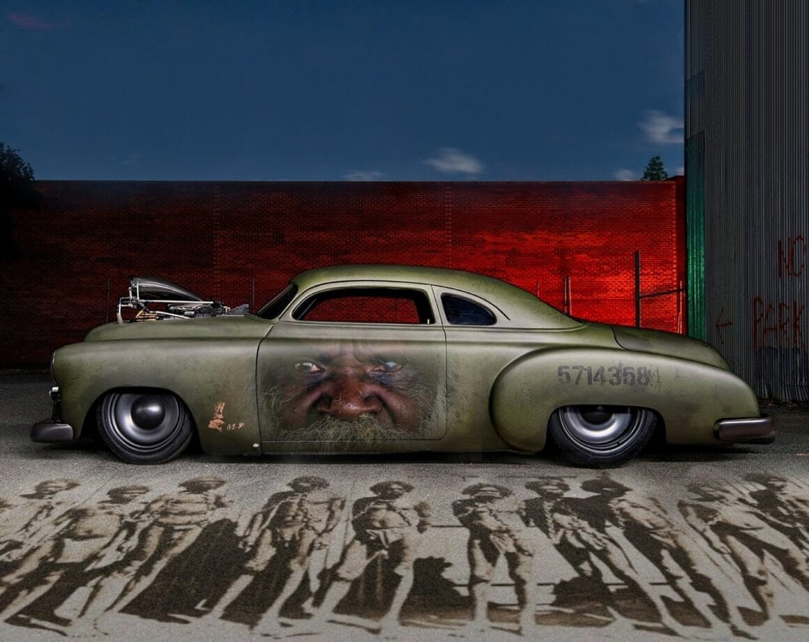 Personnellement, je reste étonné que la voiture n’a pas été transformée selon la coutume traditionnelle des années’50 de Georges Barris… “La côtelette de dessus est absolument parfaite” m’a dit Lauren Black, “C’est ce qui attire mon l’attention quand on la voit pour la première fois. J’adore la forme. Environ 90 heures ont été consacrées à la conception de l’enveloppe, qui est la symbolique du monde entier comme une peinture vert-armée délavée et écaillée. L’équipe de SignBiz WA a effectué quatre tests avant d’appliquer le produit final. La côtelette est à peu près la seule partie de la voiture qui n’a pas été changée, cependant tout le reste a été coupé et BMRC a fabriqué un tout nouveau châssis, la cloison pare-feu et le plancher”.