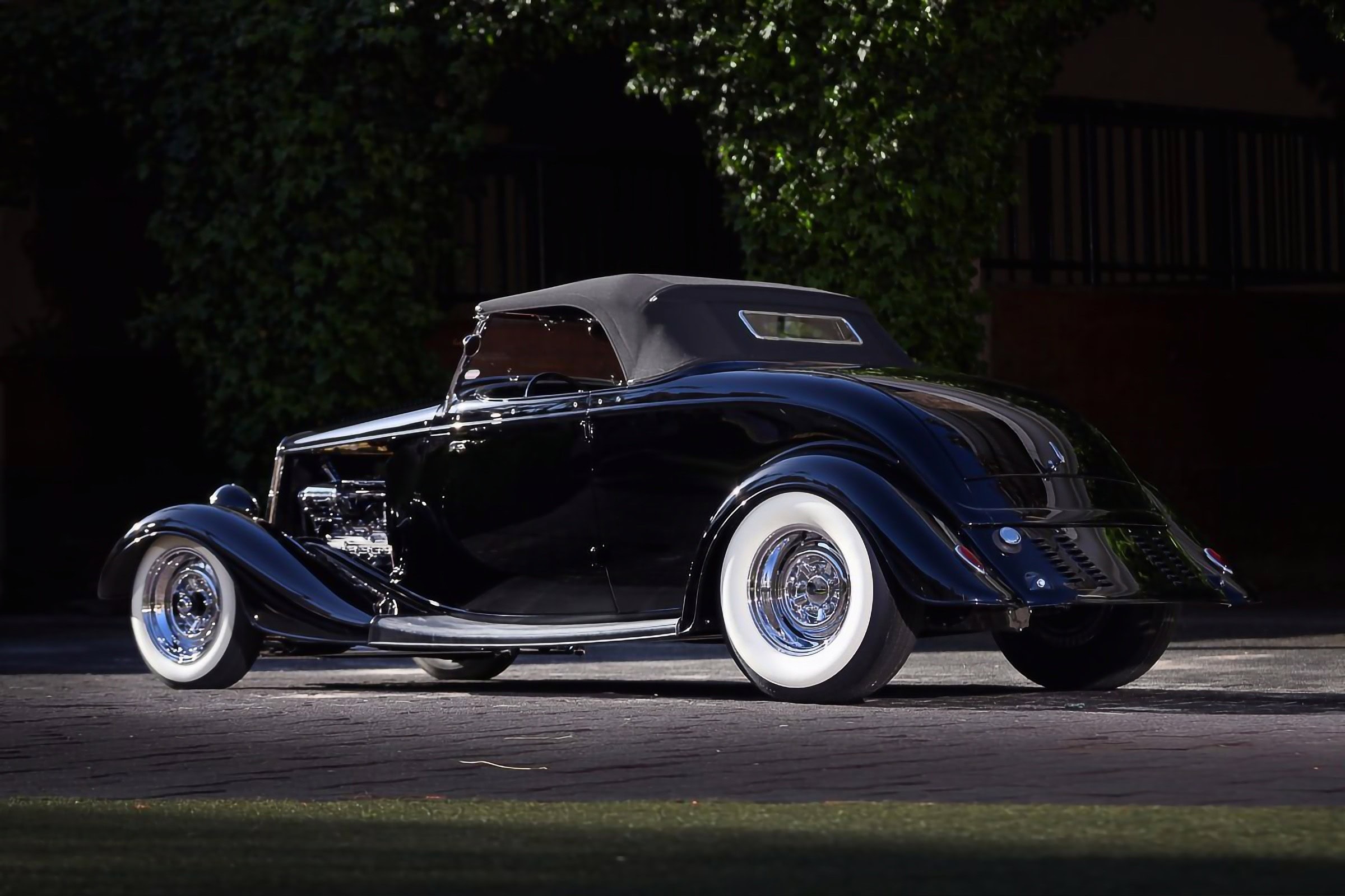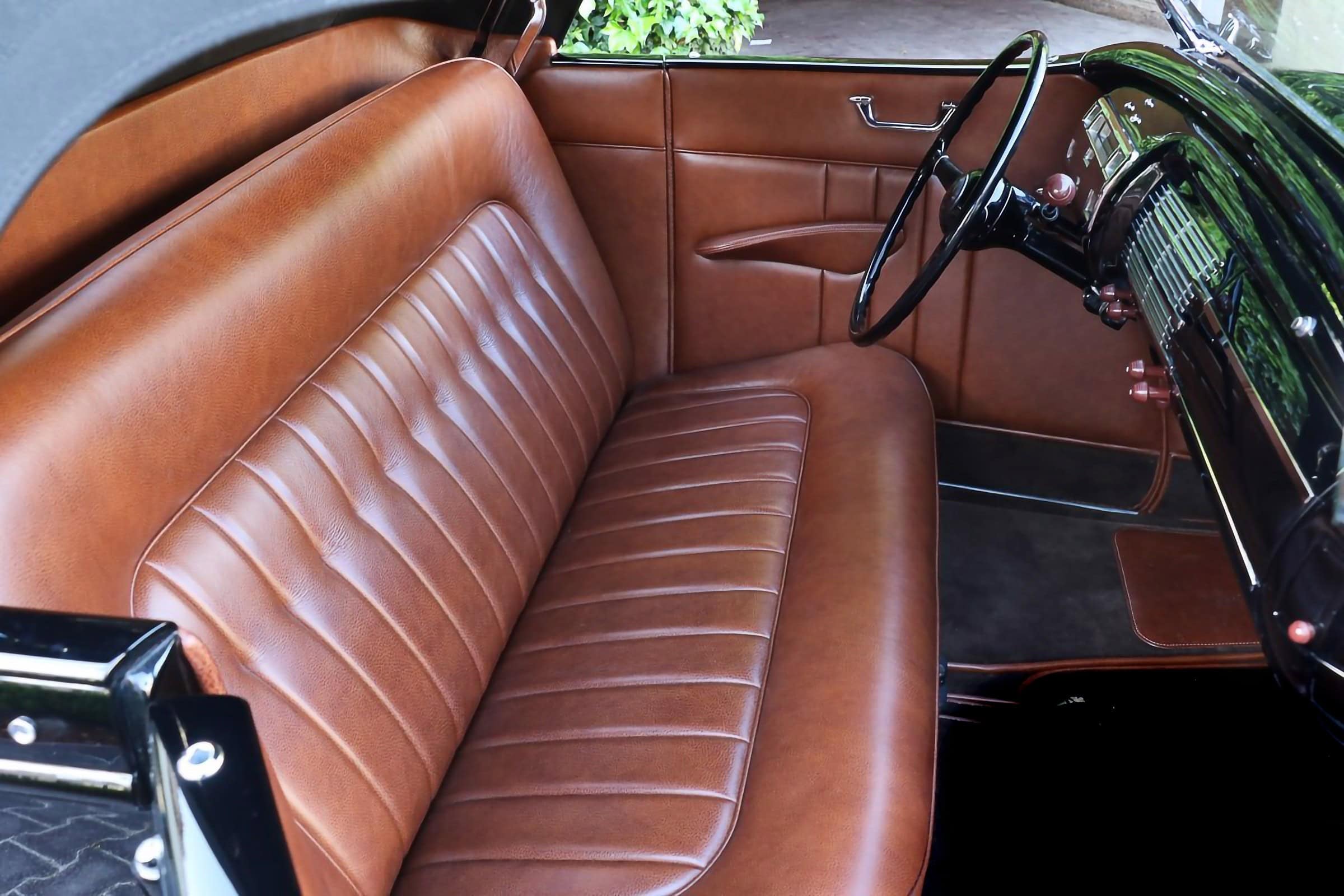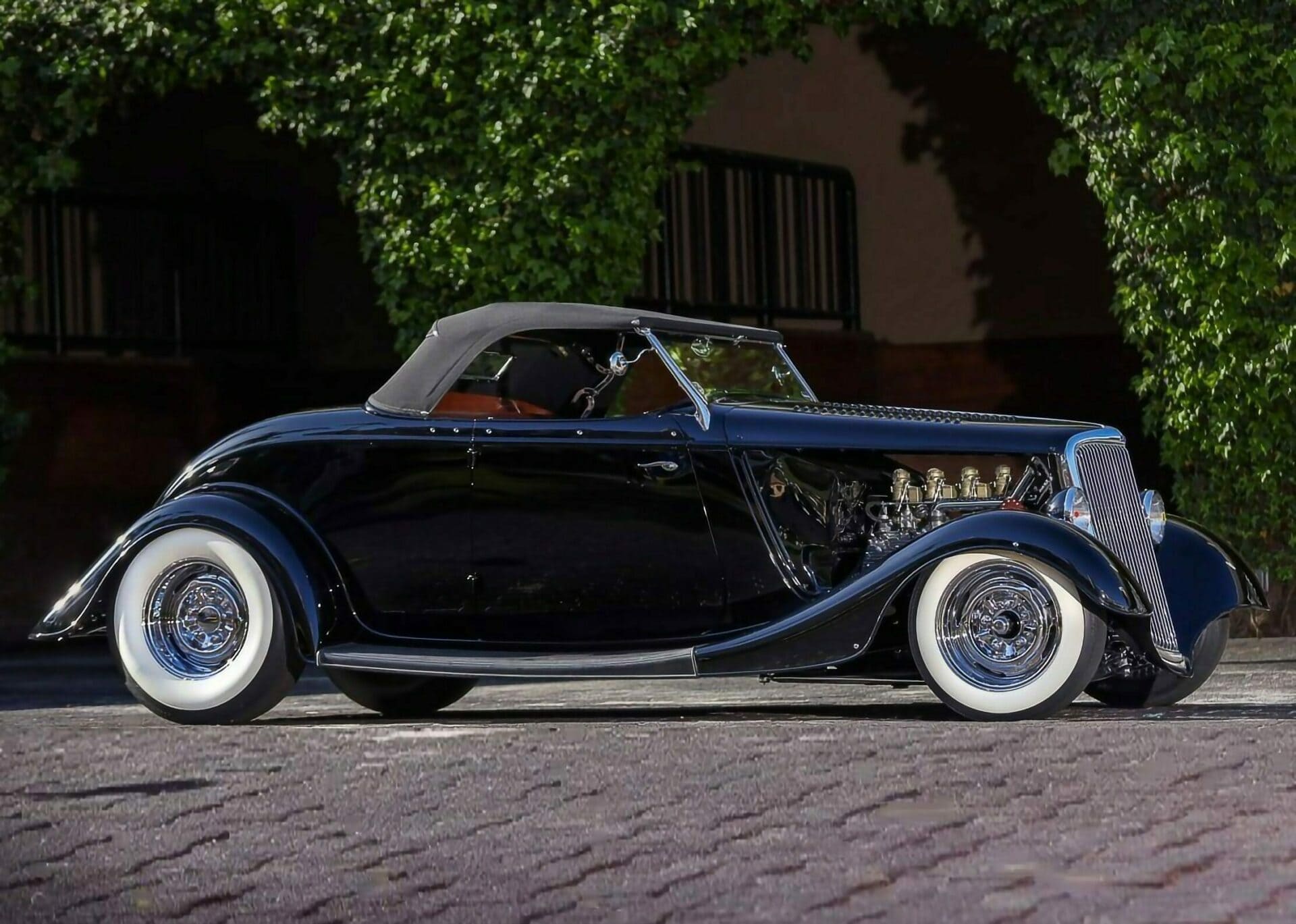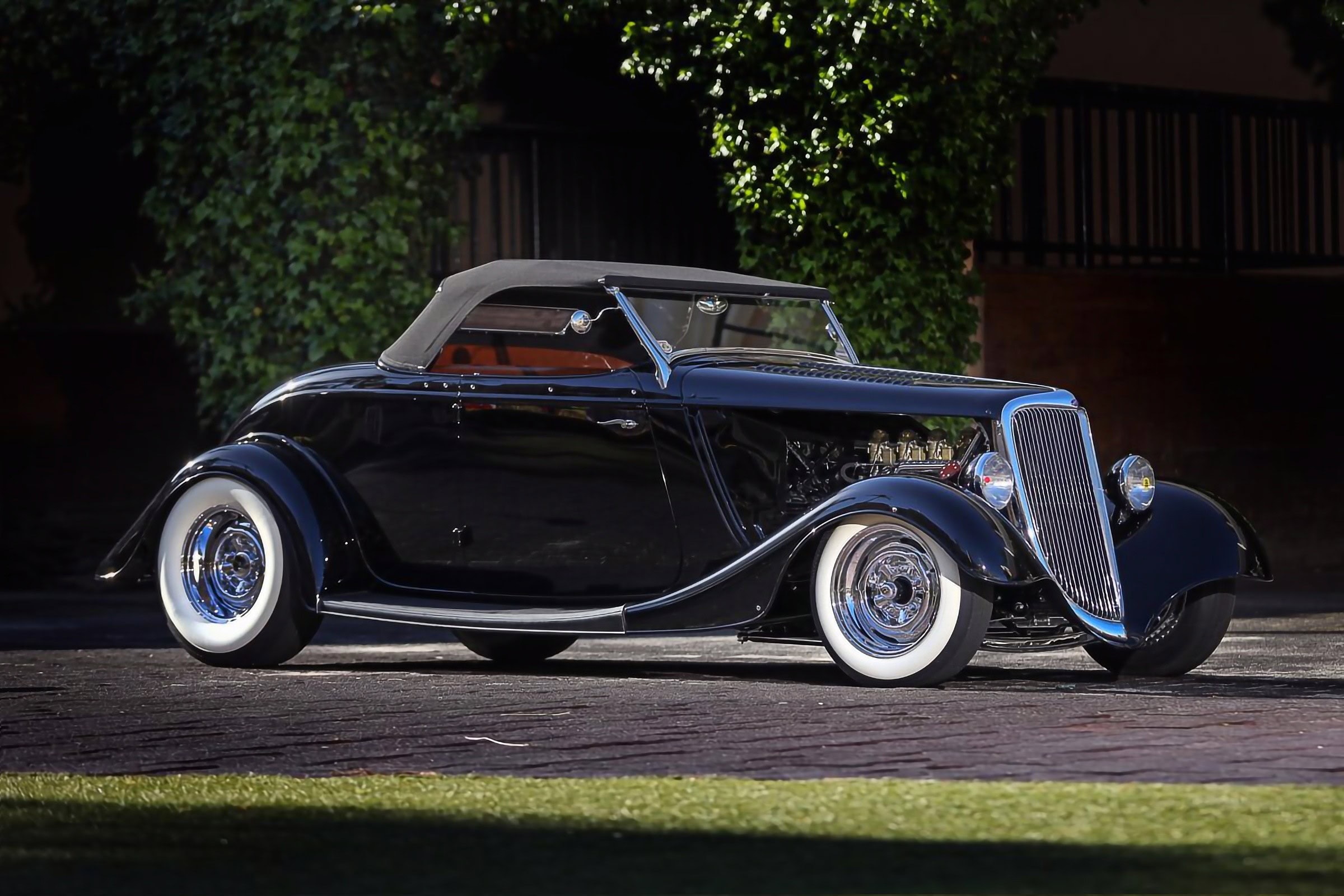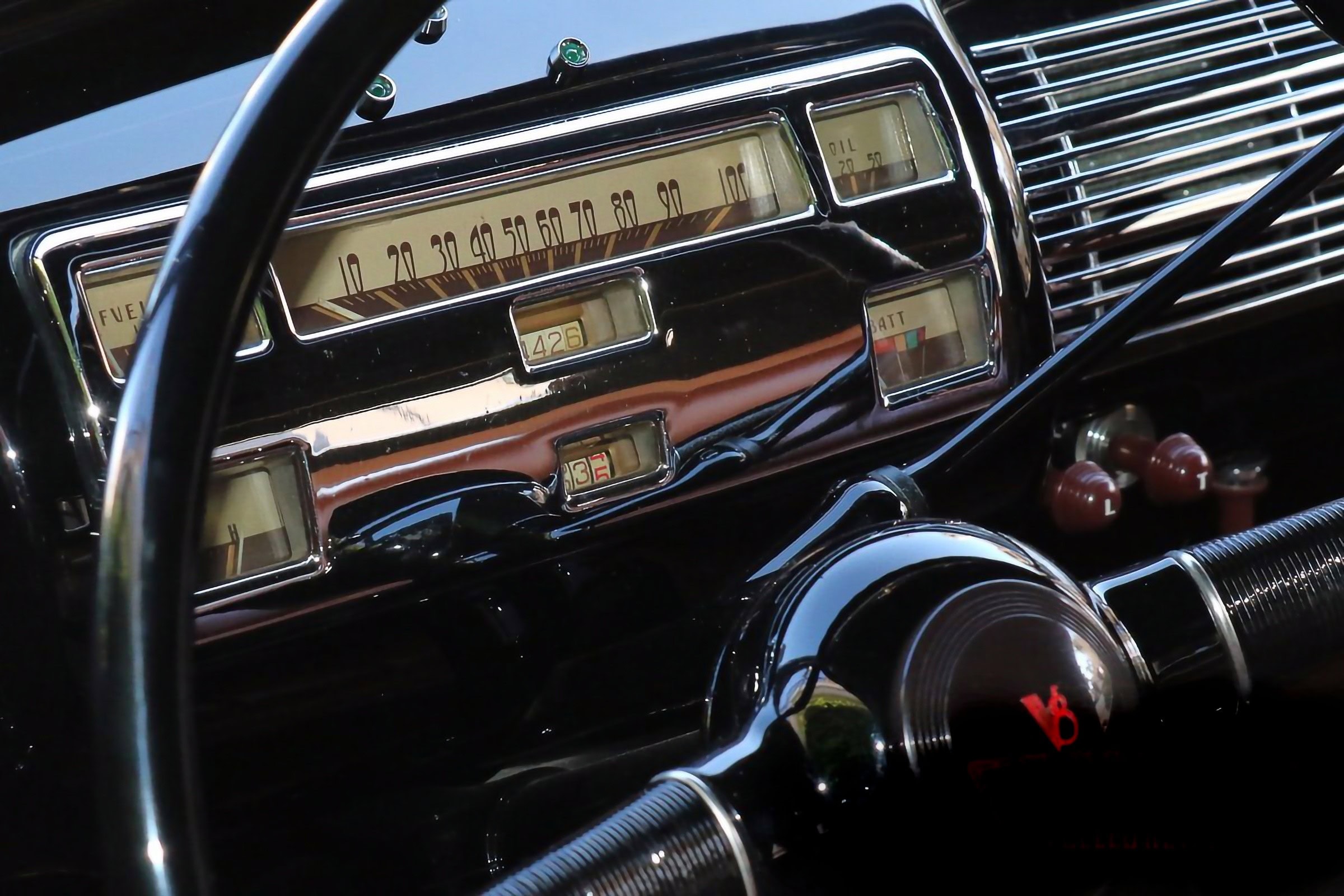 Je n’en ai pas terminé… Qui va se recueillir devant les collecteurs personnalisés qui mènent à un échappement en acier inoxydable ? Personne ! Et qui va sangloter en sachant de par ce que j’en écrit, que la puissance est transférée par une transmission Cadillac à trois vitesses à changement de vitesse en colonne d’une’41 ? Même Henry Ford est de la partie, bien qu’il soit difficile de dire combien de pincements, de plis et de tranches subtiles Dale a recréé pour obtenir le profil de la voiture, ce qui est aidé par un pare-brise penché et un modeste clapot supérieur. Les sommets de capot à persiennes et les flancs de capot supprimés aident le Flathead à respirer. Jim Smith de Ron Jones Garage a été crédité pour la carrosserie finale et la peinture funèbre, en une seule étape de PPG comme l’est la mort, tandis que le chrome a été géré par Oregon Plating et Advanced Plating…