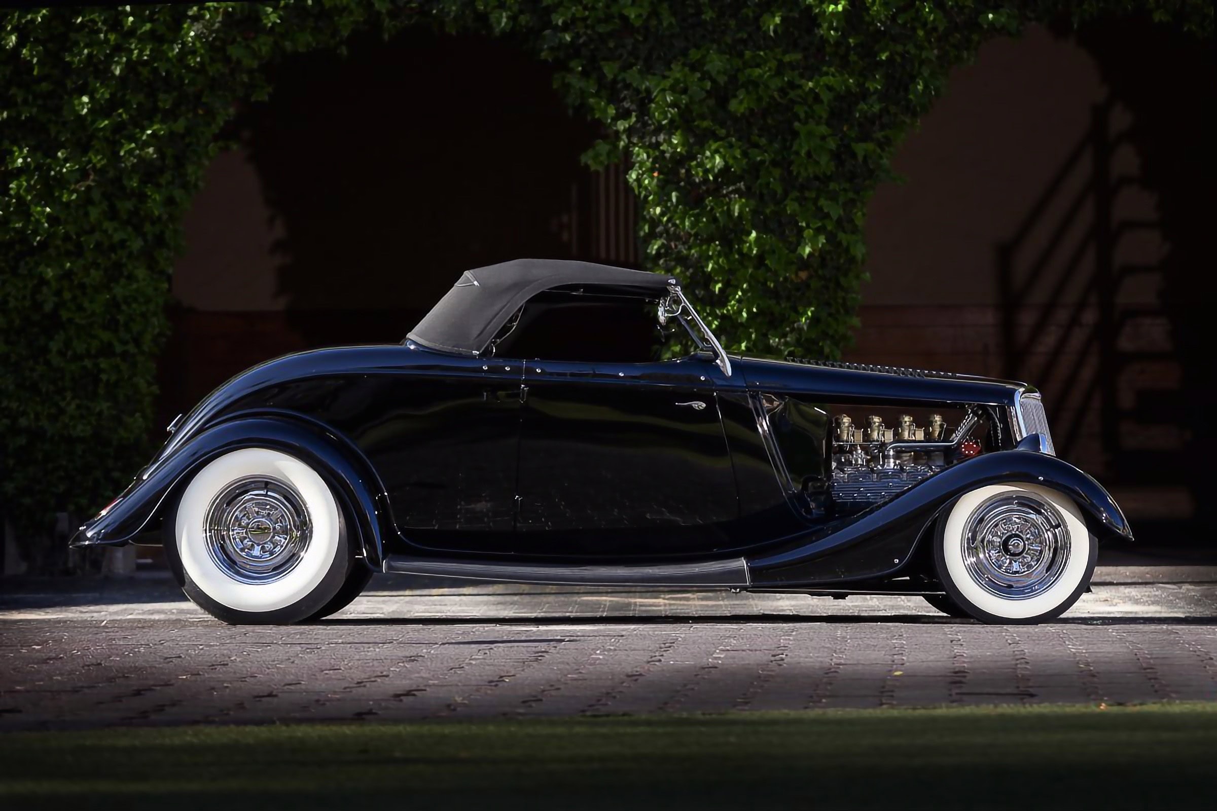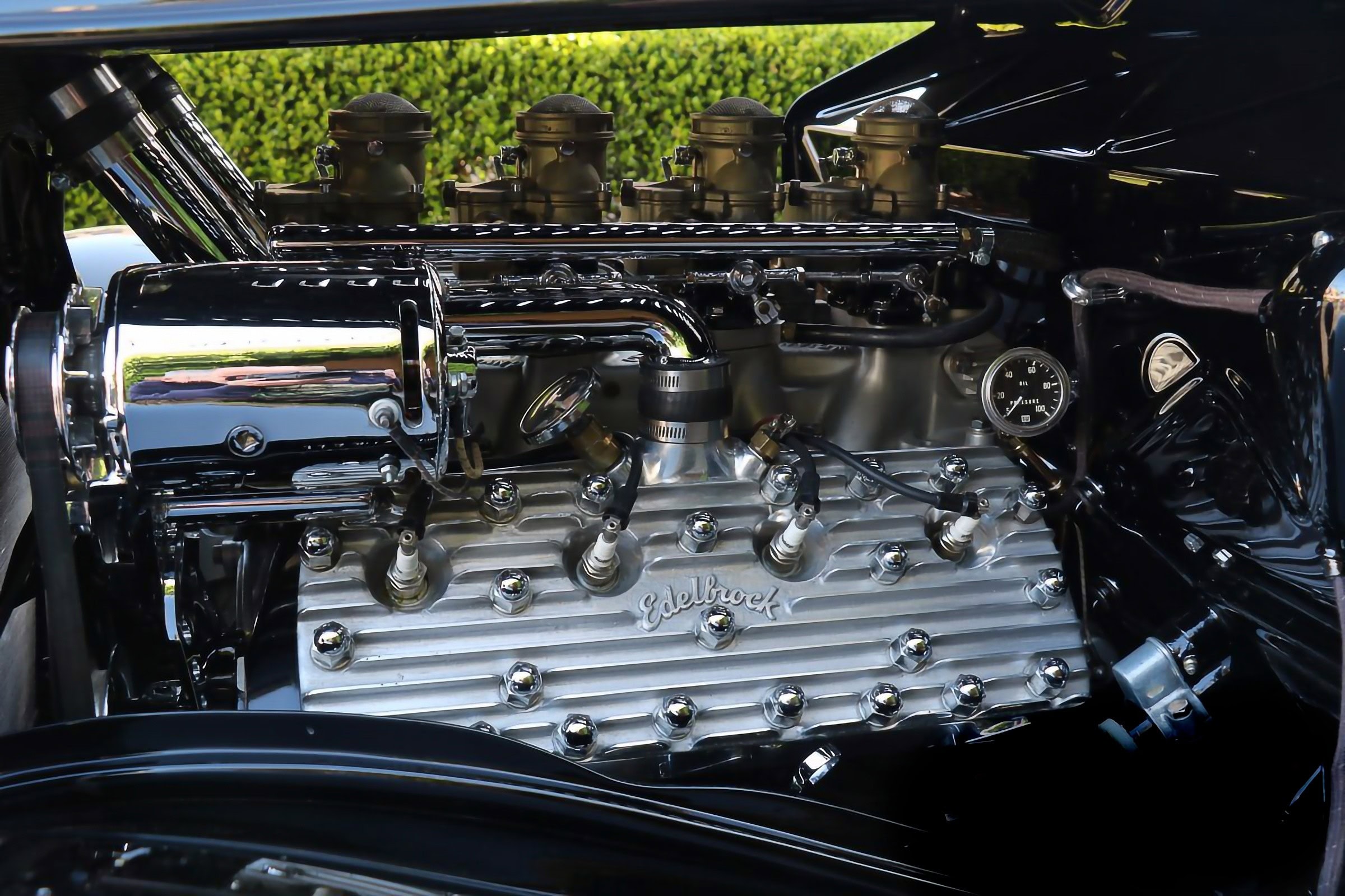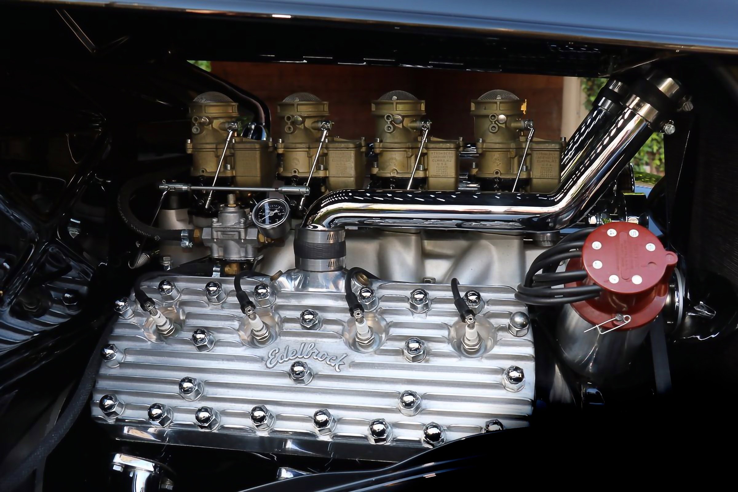 Le style de la voiture avait déjà été établi avec un châssis construit par Dale en utilisant un essieu avant abaissé, des triangles fendus et un pont arrière Quick-change Halibrand. Voyez comme tout est finalement désuet… Même le fantôme de Dale n’est pas là pour faire grincer les tambours de frein à ailettes Buick et les jantes inversées/retournées/chromées d’une Mercury également décédée dans le rituel funèbre… Toutes des pièces que Dale avait incorporées dans la construction sont aussi inertes que le néant… Certains pleurent surement… Le moteur est tout aussi Old-School, un antique V8 255ci Mercury Flathead équipé de têtes Edelbrock et d’une admission à quatre carburateurs supportant un quatuor de Stromberg et d’une magnéto Hunt… Amen… Sonnent les clochettes de la messe noire… Qui pleure en lisant tout ceci ? Quiconque ? Personne ! Vous ? Par contre la stupéfaction se fait sentir…