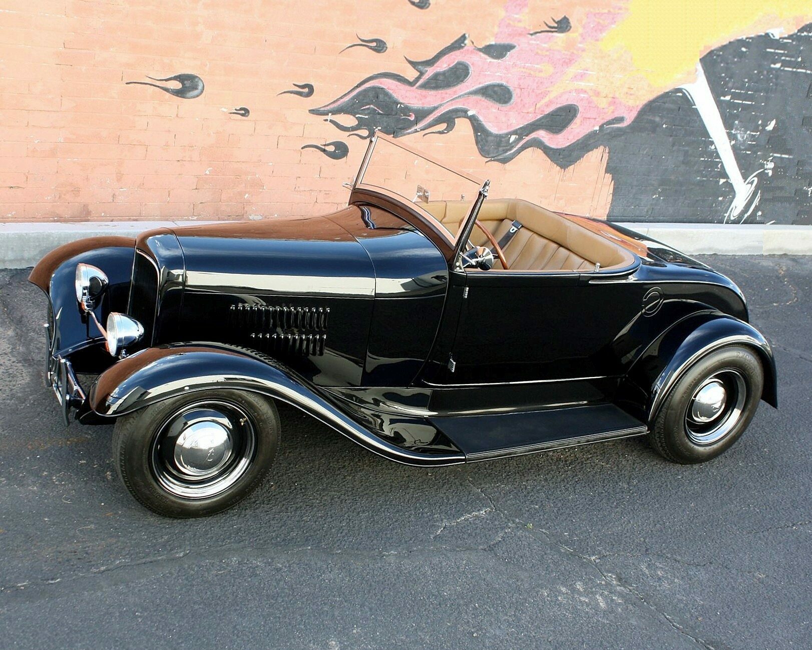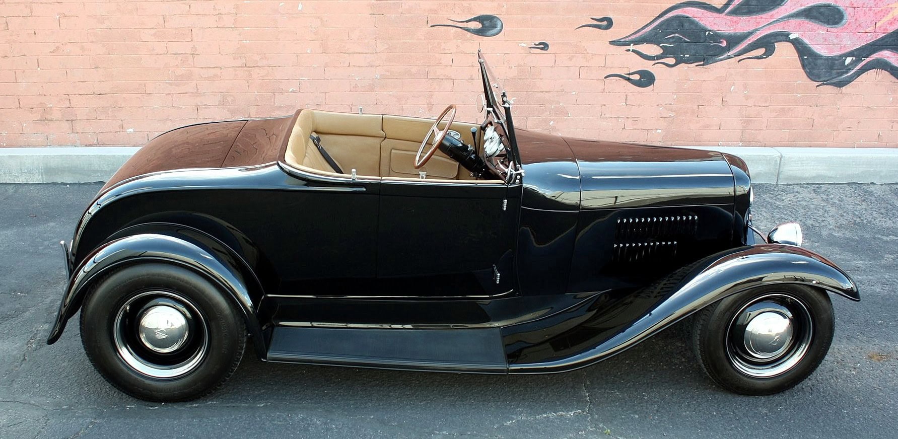 Simples et simplissimes, les Ford modèles A ont été produites en grand nombre de 1927 à 1931. Leur légèreté, leur grande disponibilité et leurs prix abordables en tant qu’occasions en ont fait des voitures de 1er choix pour les Hot Rodders, une tendance qui se poursuit de nos jours. Cette Ford Model A Roadster Street Rod de 1929 construite sur mesure et dotée d’ailes complètes, utilise une reproduction de carrosserie en acier de chez Brookville sur un châssis Ford 32 étiré.