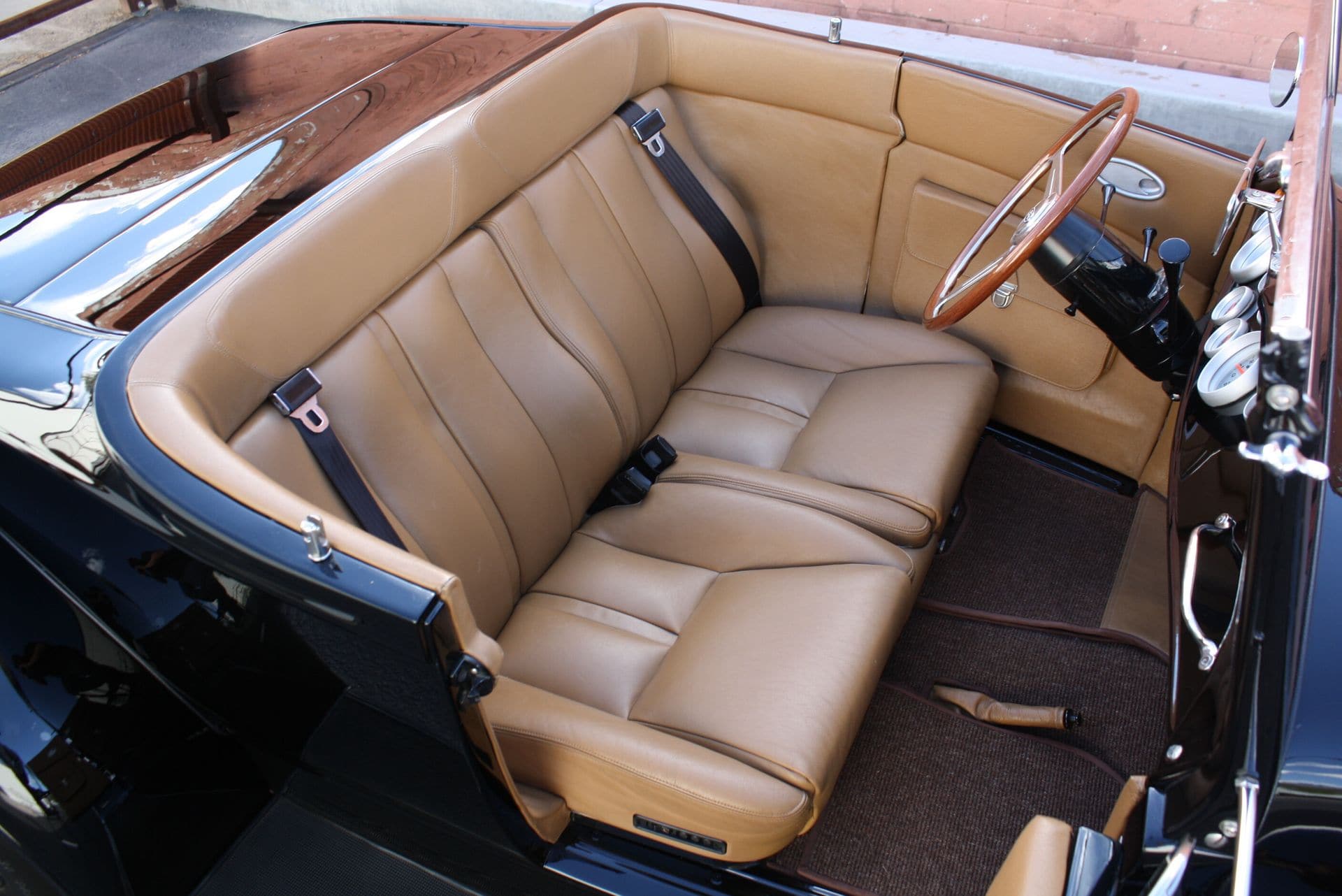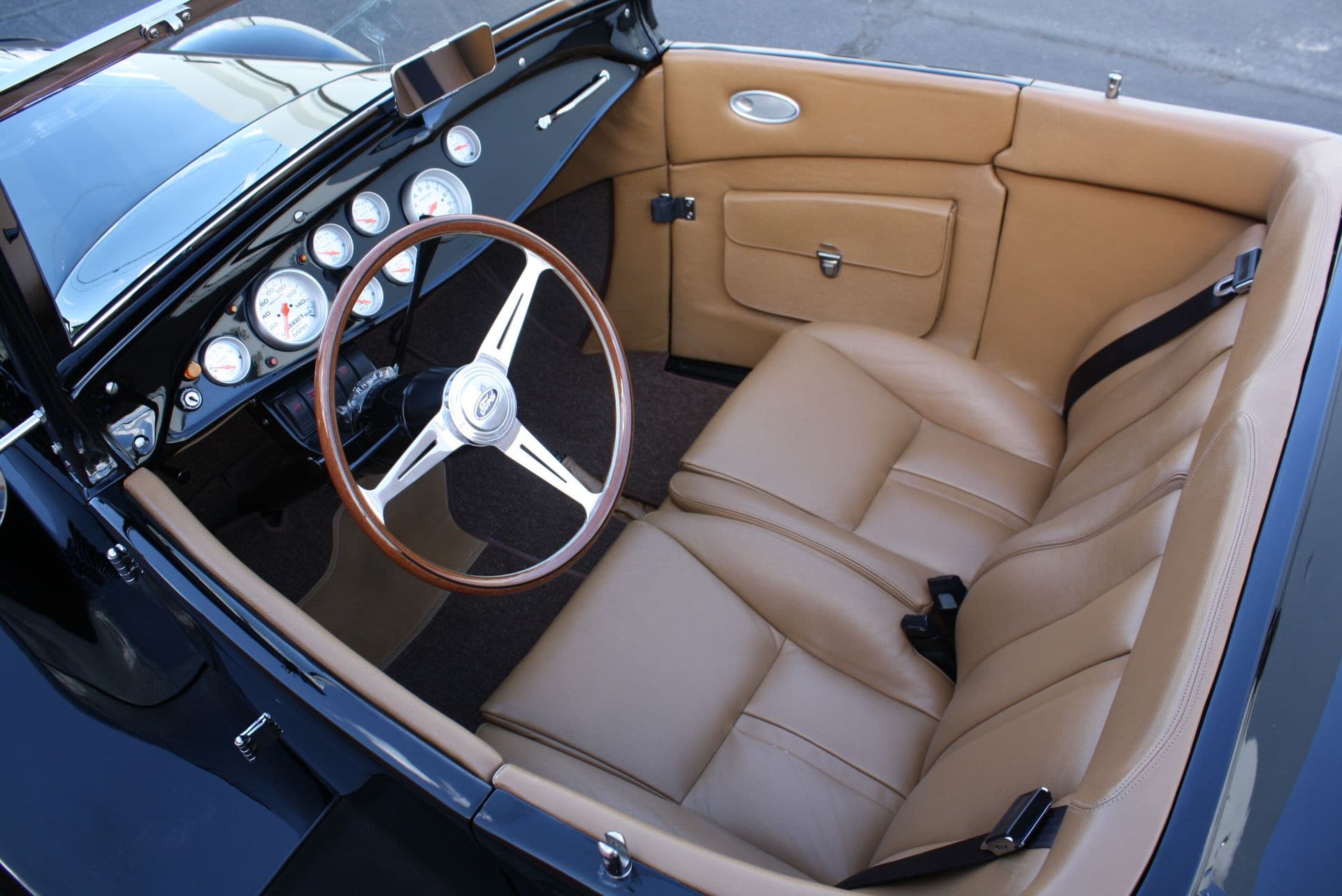 Immatriculation légale aux USA : Ford Model A Châssis A1128128 1929 – V8 Chevy LT4 5L7 OHV Corvette Injection électronique 1996 + Module informatique – Connecteurs Sanderson + silencieux Bassani quadruples – Radiateur aluminium + Ventilo SPAL 16po Transmission automatique GM 700-R4 quatre vitesses – Pont Ford 9po en 3,83:1 Kwick Change – Carrosserie Brookville en acier – Capot et panneaux avec Louvers Rootlieb – Peinture miroir Jet Black – Habitacle réalisé par Ocean Beach Upholstery en cuir Connolly beige – Compteurs AutoMeter –