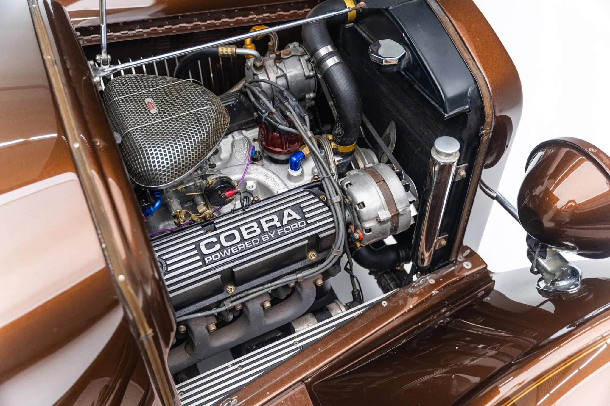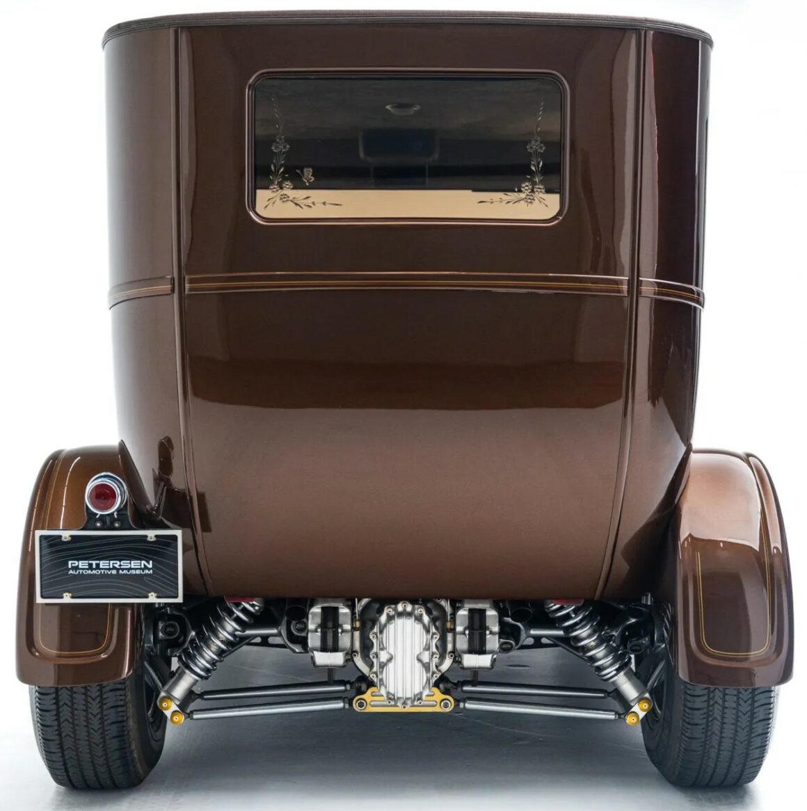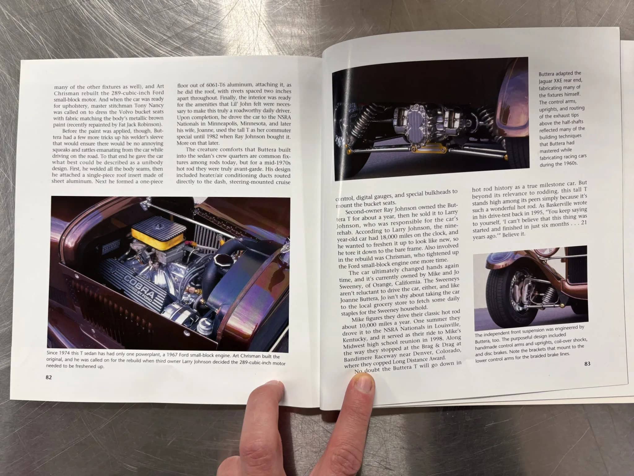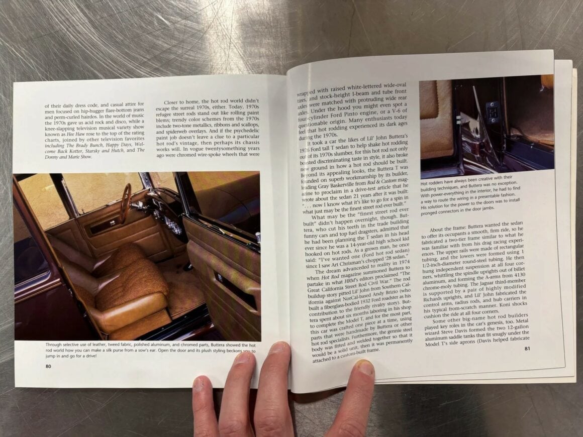 Mais, plus encore, dans d’autres publications. La carrosserie T en acier est montée sur un châssis en chromoly façon châssis spatial (Space Frame) fabriqué par John Buttera, qui a utilisé un V8 Ford 289ci et une transmission automatique C-4 pour la transmission. La voiture roule sur des jantes à rayons Borrani décalées AV et AR et dispose de freins à disques assistés, d’une suspension avant à bras triangulaire, d’un pont/différentiel Jaguar et de combinés amortisseurs filetés réglables Alden. L’intérieur comprend des sièges baquets Volvo, un tableau de bord Cadillac Eldorado’72, des vitres électriques, un régulateur de vitesse et la climatisation. Ce Hot Rod a été acheté et remis à neuf par le Petersen Museum en 2004. Vous voulez surement en connaître plus… OK… Buttera s’est procuré la carrosserie en acier T Tudor en Arizona, et modifiée avec un toit en tôle d’aluminium de 1/8po boulonné à la carrosserie, un plancher riveté, des coutures scellées et des ailes étirées…