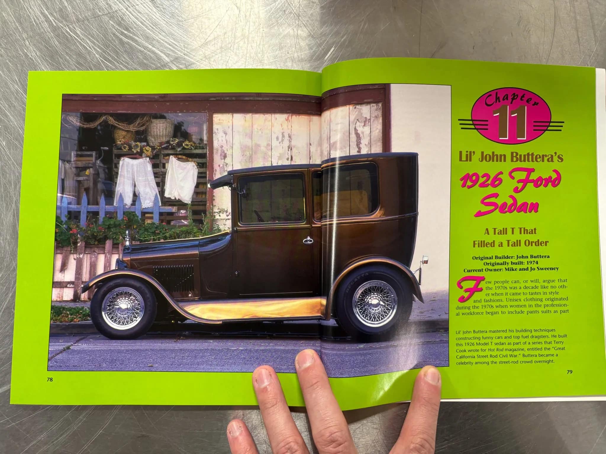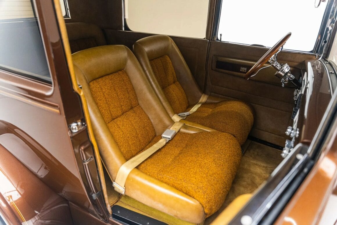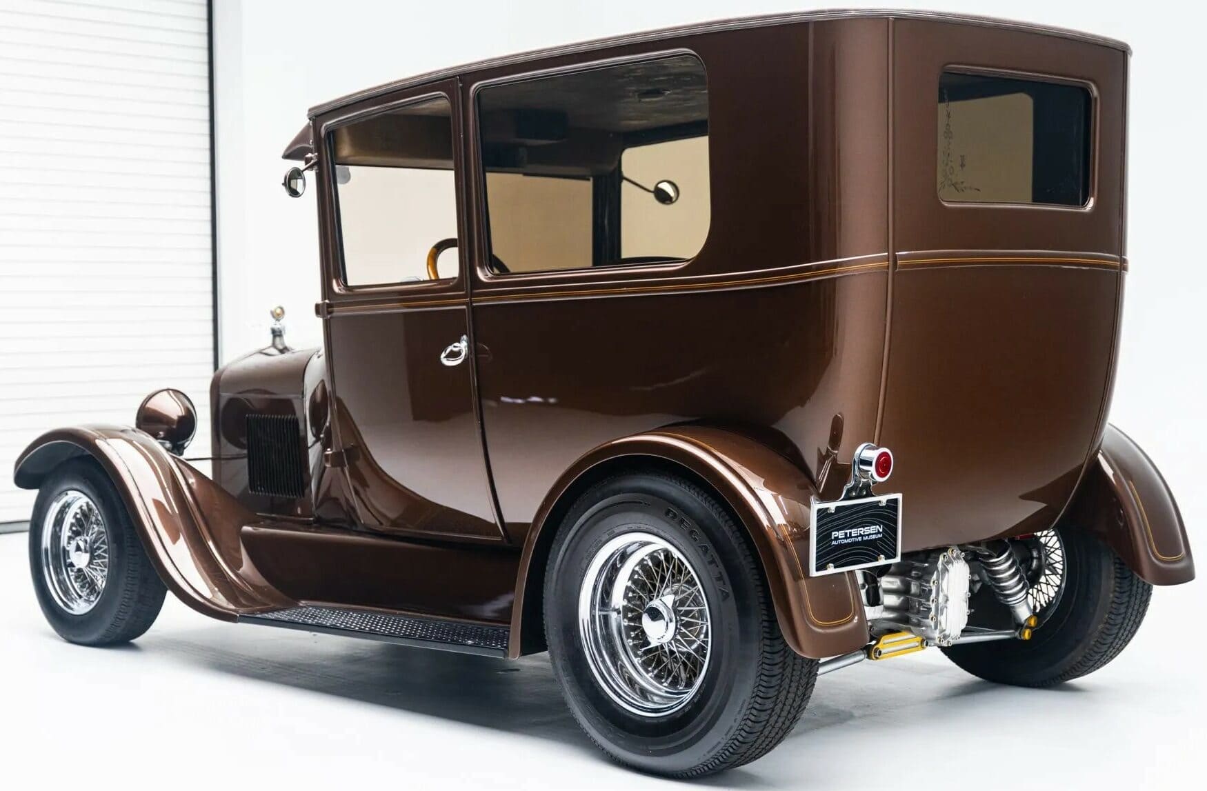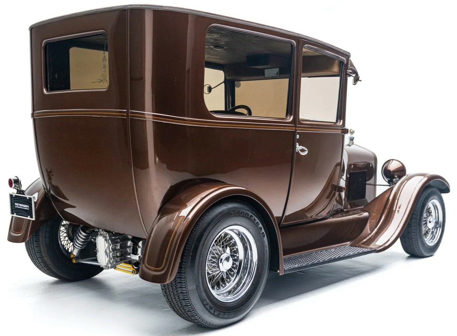 Mais, plus encore, dans d’autres publications. La carrosserie T en acier est montée sur un châssis en chromoly façon châssis spatial (Space Frame) fabriqué par John Buttera, qui a utilisé un V8 Ford 289ci et une transmission automatique C-4 pour la transmission. La voiture roule sur des jantes à rayons Borrani décalées AV et AR et dispose de freins à disques assistés, d’une suspension avant à bras triangulaire, d’un pont/différentiel Jaguar et de combinés amortisseurs filetés réglables Alden. L’intérieur comprend des sièges baquets Volvo, un tableau de bord Cadillac Eldorado’72, des vitres électriques, un régulateur de vitesse et la climatisation. Ce Hot Rod a été acheté et remis à neuf par le Petersen Museum en 2004. Vous voulez surement en connaître plus… OK… Buttera s’est procuré la carrosserie en acier T Tudor en Arizona, et modifiée avec un toit en tôle d’aluminium de 1/8po boulonné à la carrosserie, un plancher riveté, des coutures scellées et des ailes étirées…