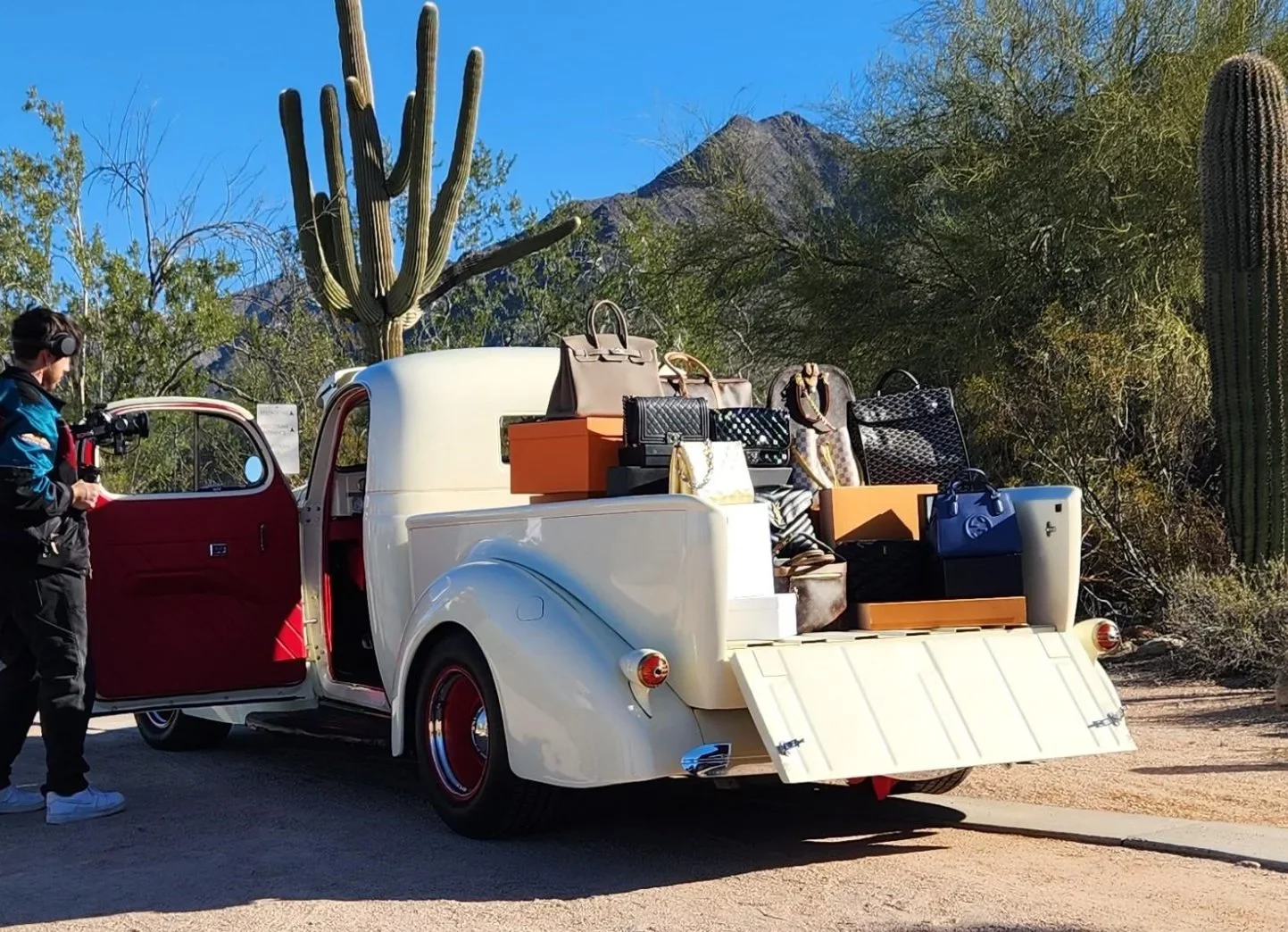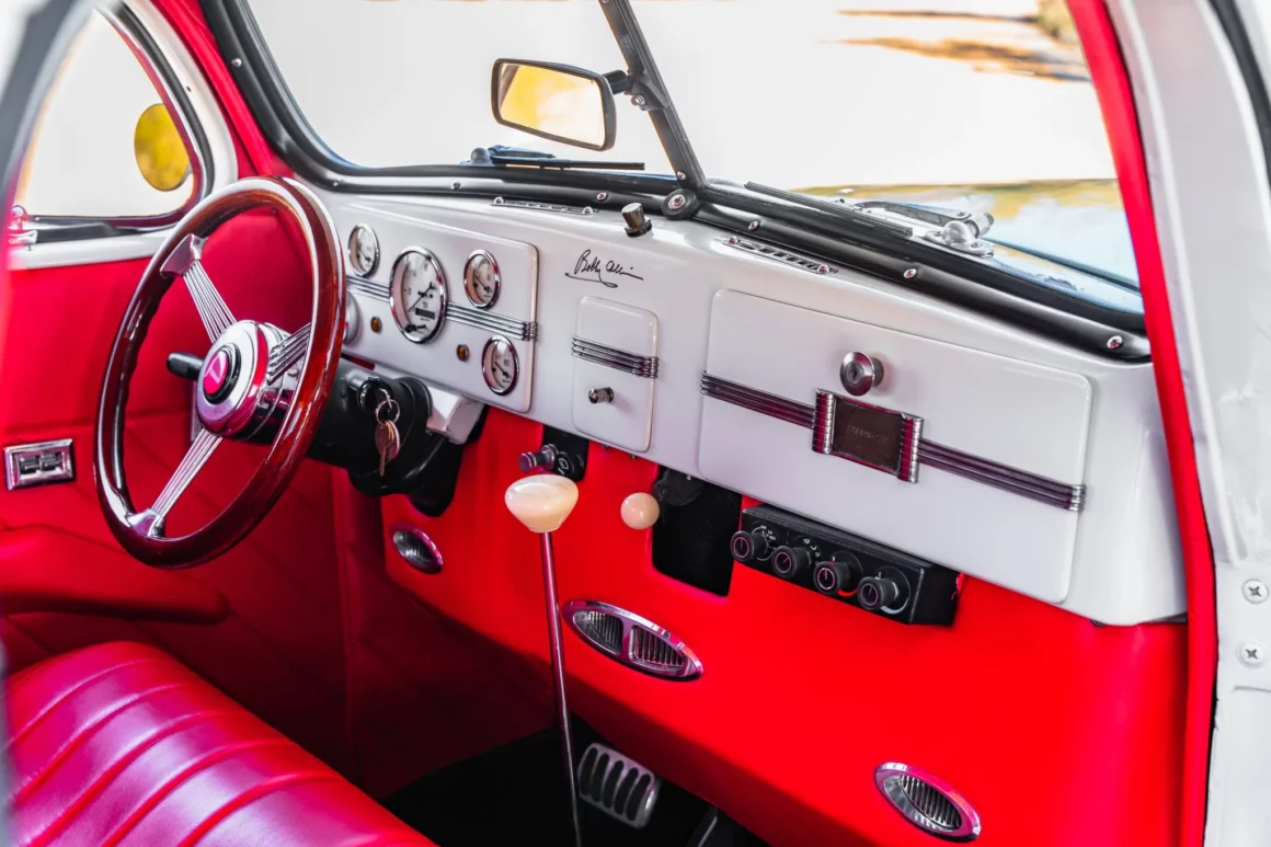 Une roue de secours est montée sous un couvercle de couleur de carrosserie dans l’aile avant droite. Le camion dispose d’une suspension avant indépendante ainsi que d’une configuration arrière à quatre bras, de coilovers QA1 aux quatre coins et d’un boîtier de direction et d’un stabilisateur de style Fat Fabrications Mustang II. La puissance de freinage est fournie par les freins à disque avant Wilwood à assistance électrique avec rotors fendus et percés ainsi que par tambours arrière. La cabine dispose d’une banquette garnie d’une sellerie en cuir rouge ainsi que d’une garniture de toit, de panneaux de porte et d’un tableau de bord inférieur.