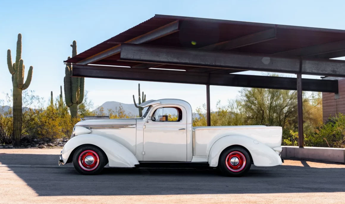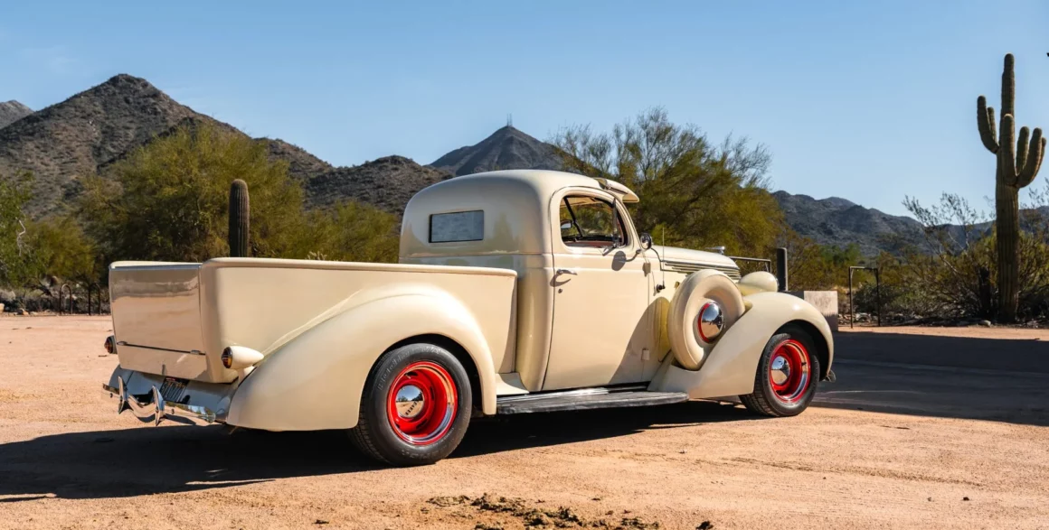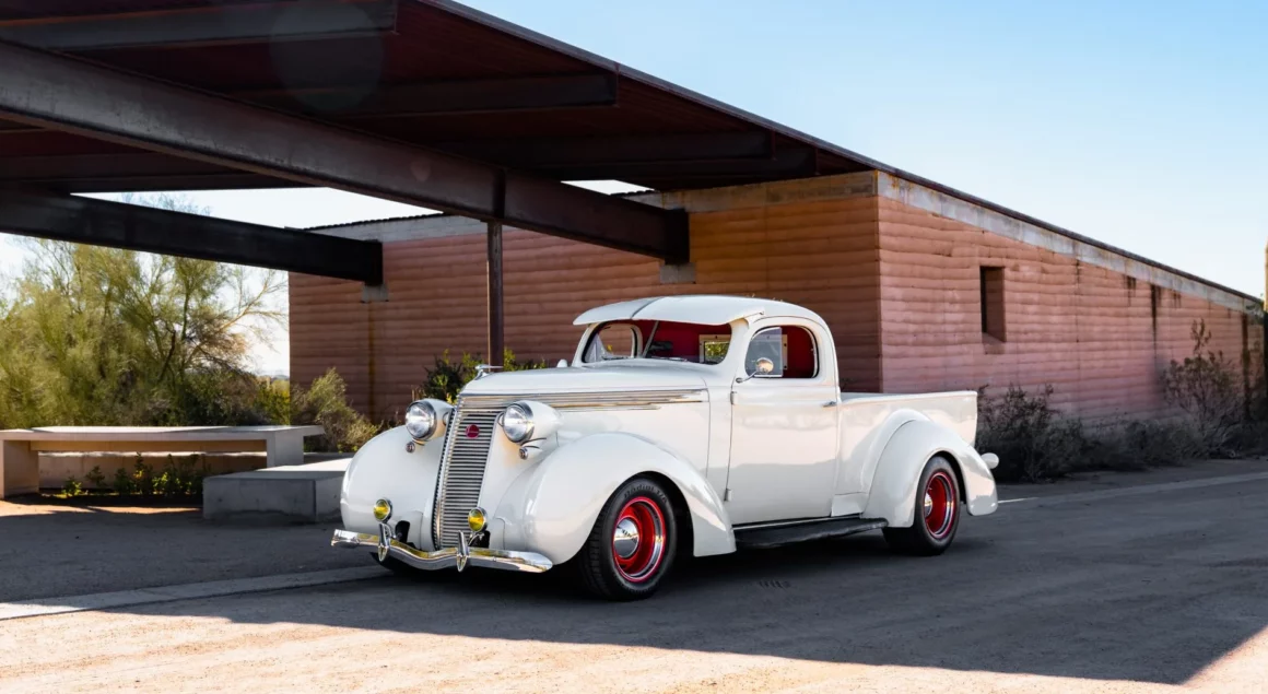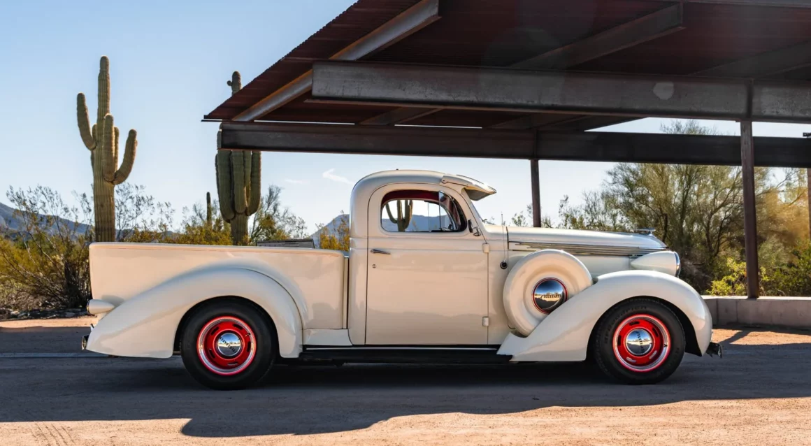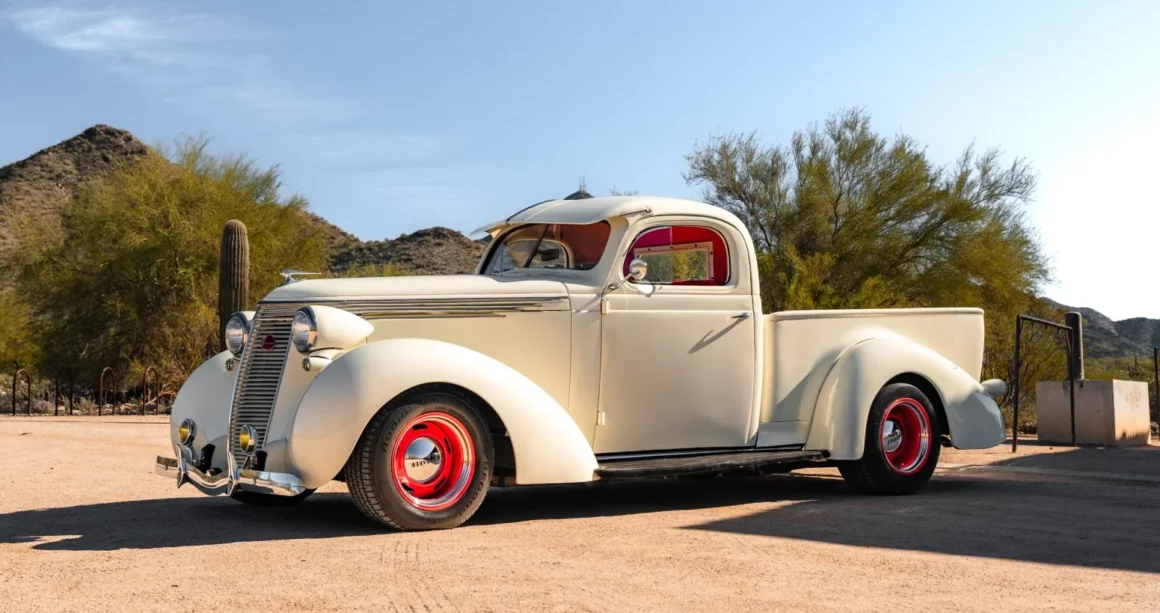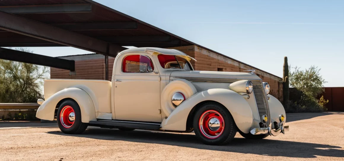 Post-Scriptum : Ce Pick-Up Studebaker J5 Coupé-Express de 1937 est l’un des 3.125 exemplaires produits et a été construite par Studebaker of Canada Limited à Walkerville, en Ontario. Il a été acheté en 2014, puis rénové et modifié. La puissance provient d’un V8 LT1 de 5,7 litres jumelé à une transmission automatique 4L60-E à quatre vitesses, et le Pick-Up est fini en crème sur une sellerie en cuir rouge. Les caractéristiques comprennent une suspension avant indépendante et un arrière à quatre bras avec coilovers QA1 ainsi qu’une pont arrière Chevrolet à 12 boulons et un boîtier de direction Fat Man Fabrications