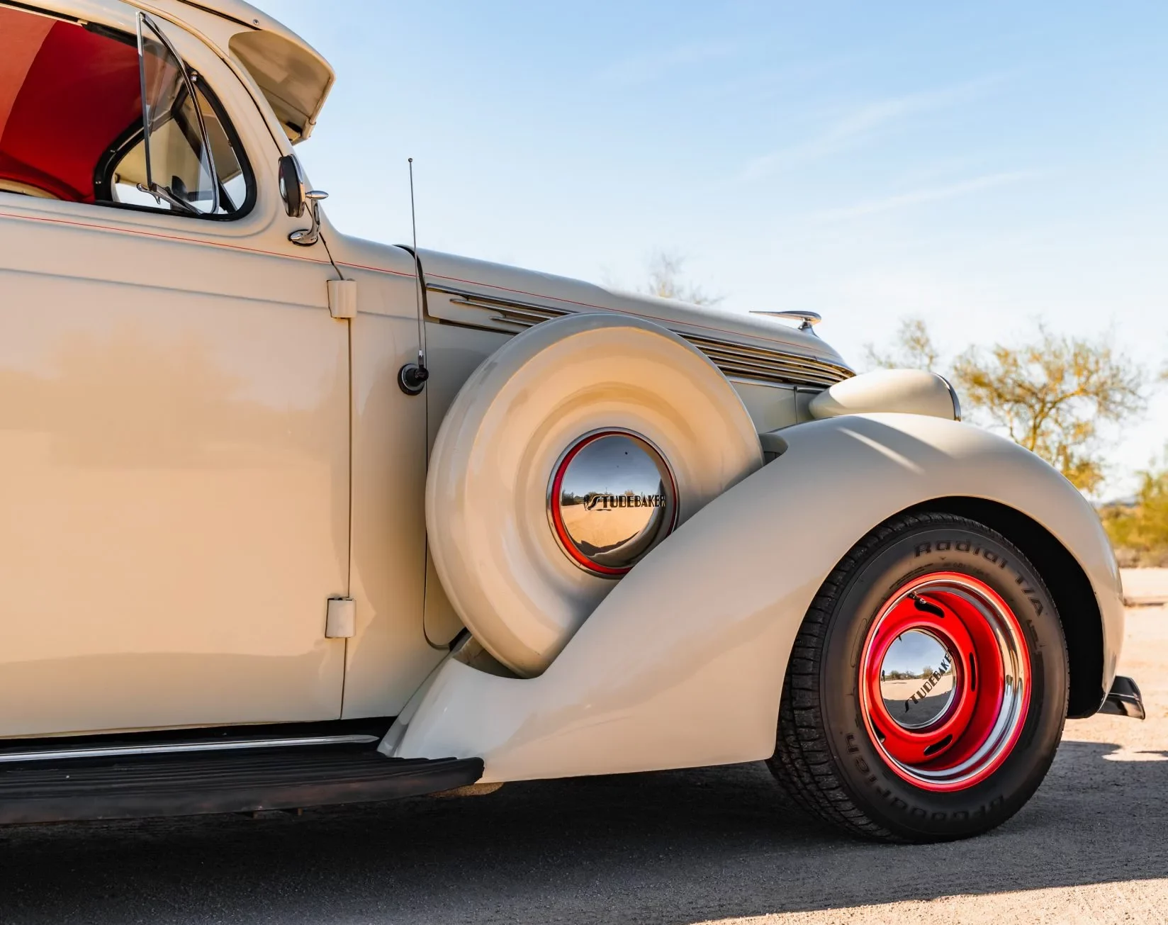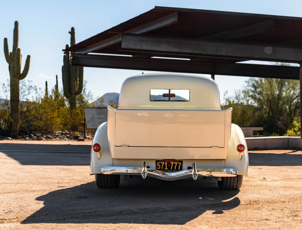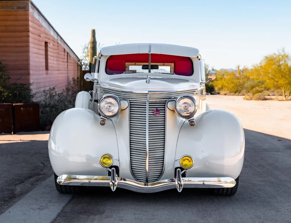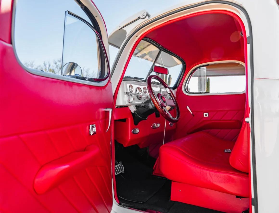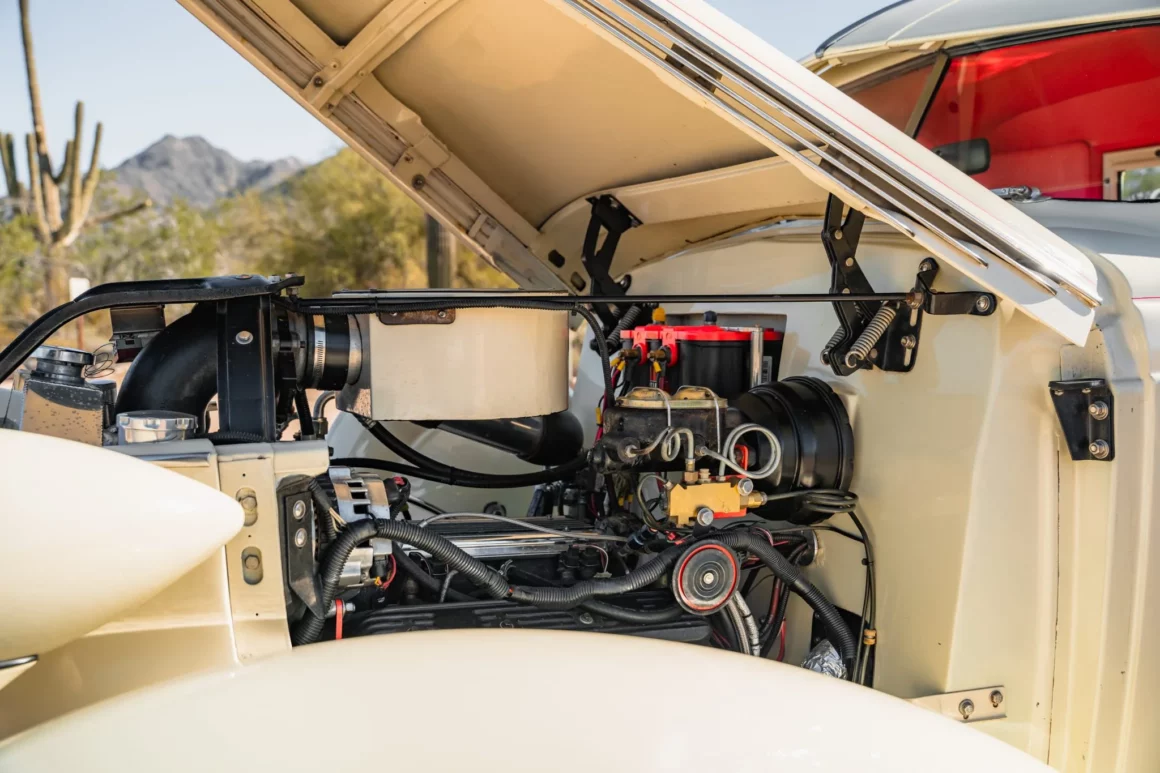 Il a reçu des mises à jour annuelles de style jusqu’à ce qu’il soit abandonné après l’année modèle 1939. La carrosserie de cet exemplaire a été sablée et les ailes élargies de 2 pouces avant d’être repeinte en crème. Les caractéristiques comprennent des pare-chocs chromés Ford 1933 modifiés, des feux de route, des clignotants avant provenant d’une Ducati, un ornement de capot, une visière de pare-brise en métal, deux rétroviseurs latéraux, des marchepieds et des feux arrière provenant d’une Chrysler de 1937. Les jantes de 15 pouces peintes en rouge proviendraient d’une Corvette et portent des enjoliveurs Studebaker et des pneus BFGoodrich Radial T/A.