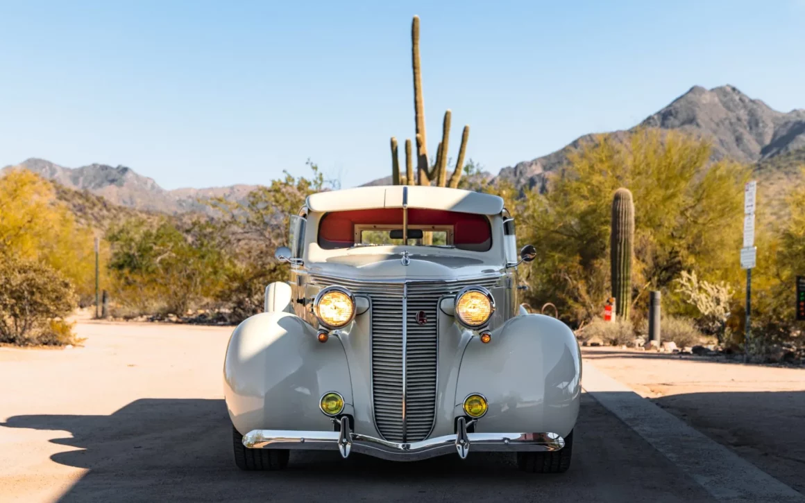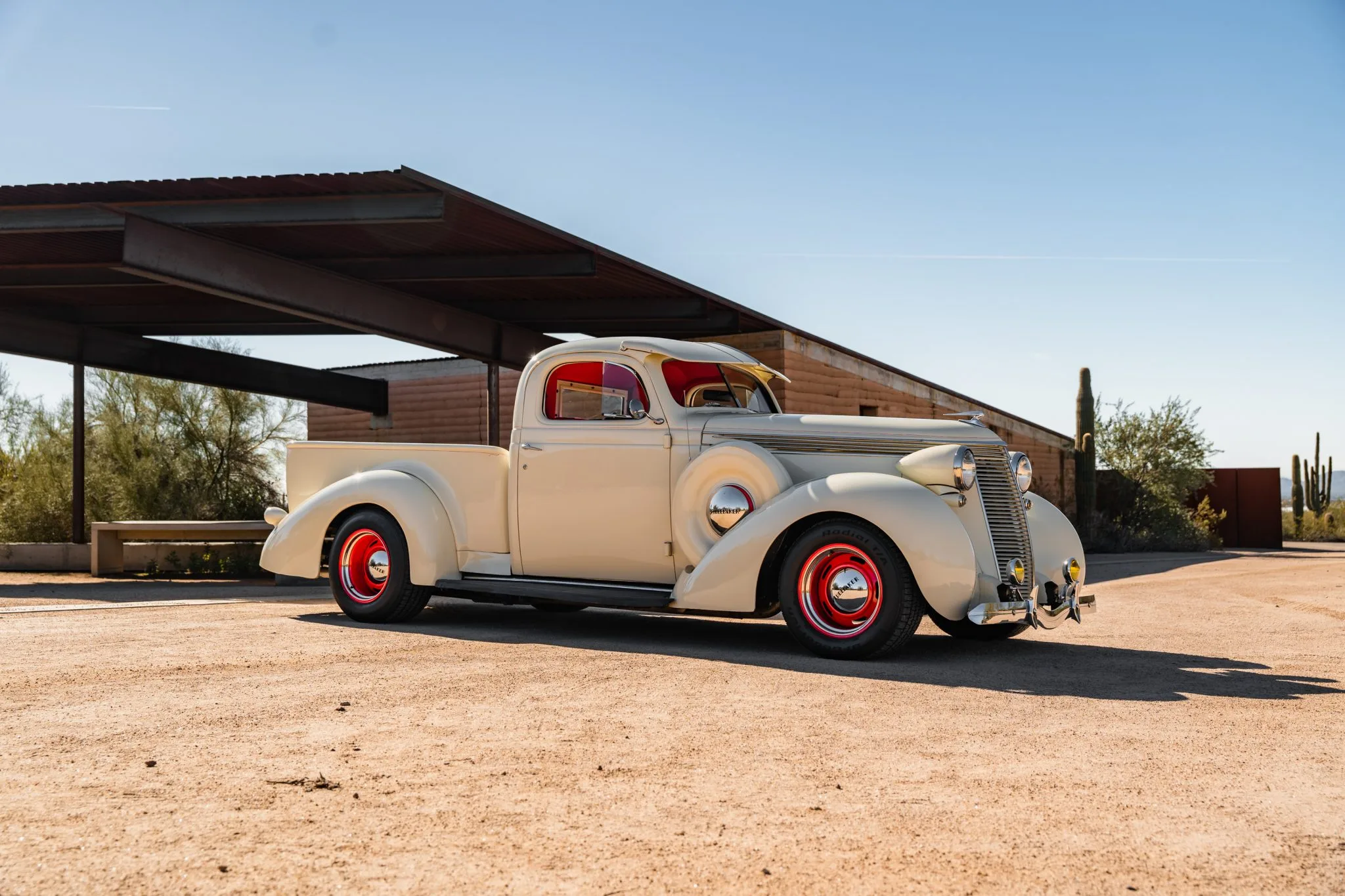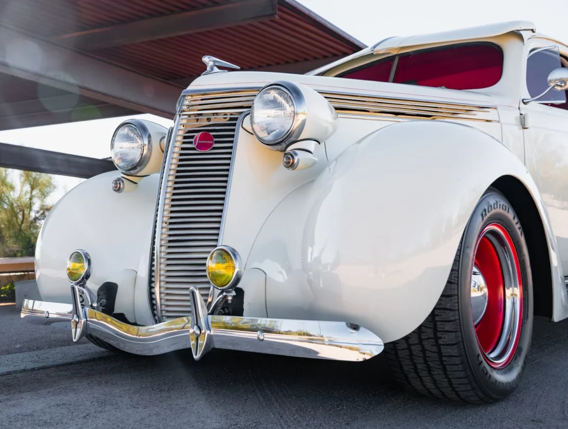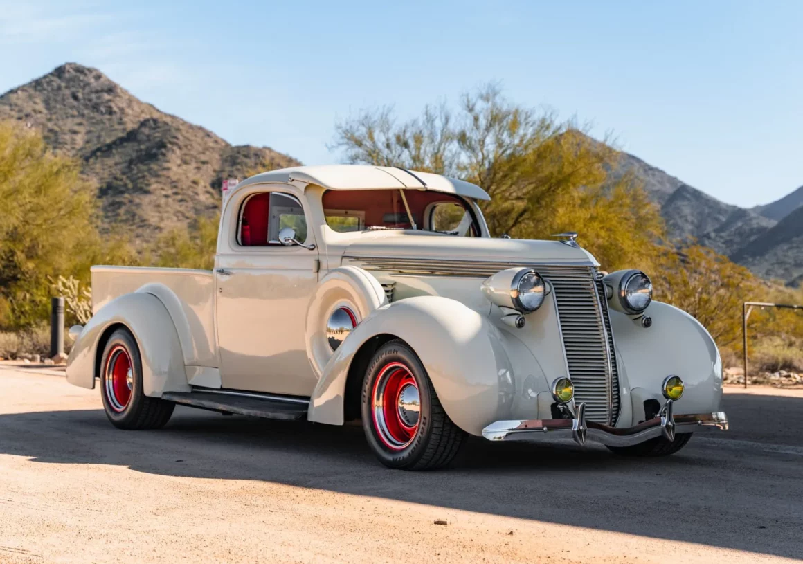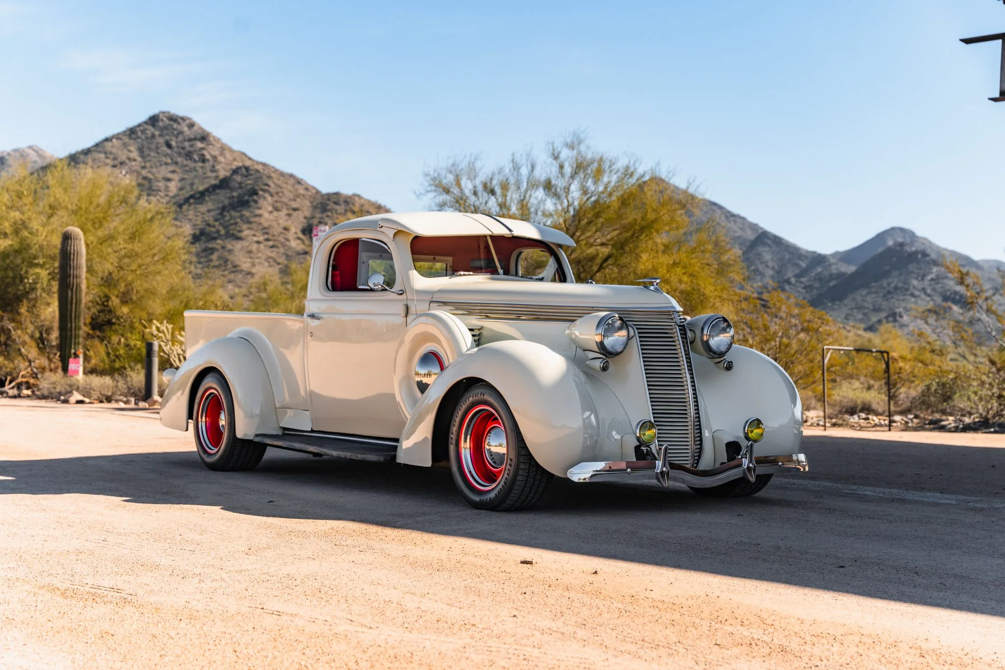 Il a reçu des mises à jour annuelles de style jusqu’à ce qu’il soit abandonné après l’année modèle 1939. La carrosserie de cet exemplaire a été sablée et les ailes élargies de 2 pouces avant d’être repeinte en crème. Les caractéristiques comprennent des pare-chocs chromés Ford 1933 modifiés, des feux de route, des clignotants avant provenant d’une Ducati, un ornement de capot, une visière de pare-brise en métal, deux rétroviseurs latéraux, des marchepieds et des feux arrière provenant d’une Chrysler de 1937. Les jantes de 15 pouces peintes en rouge proviendraient d’une Corvette et portent des enjoliveurs Studebaker et des pneus BFGoodrich Radial T/A.