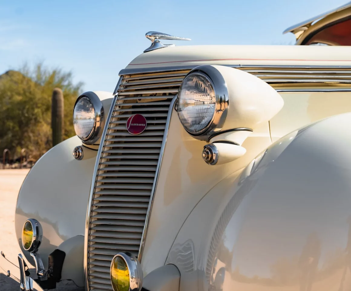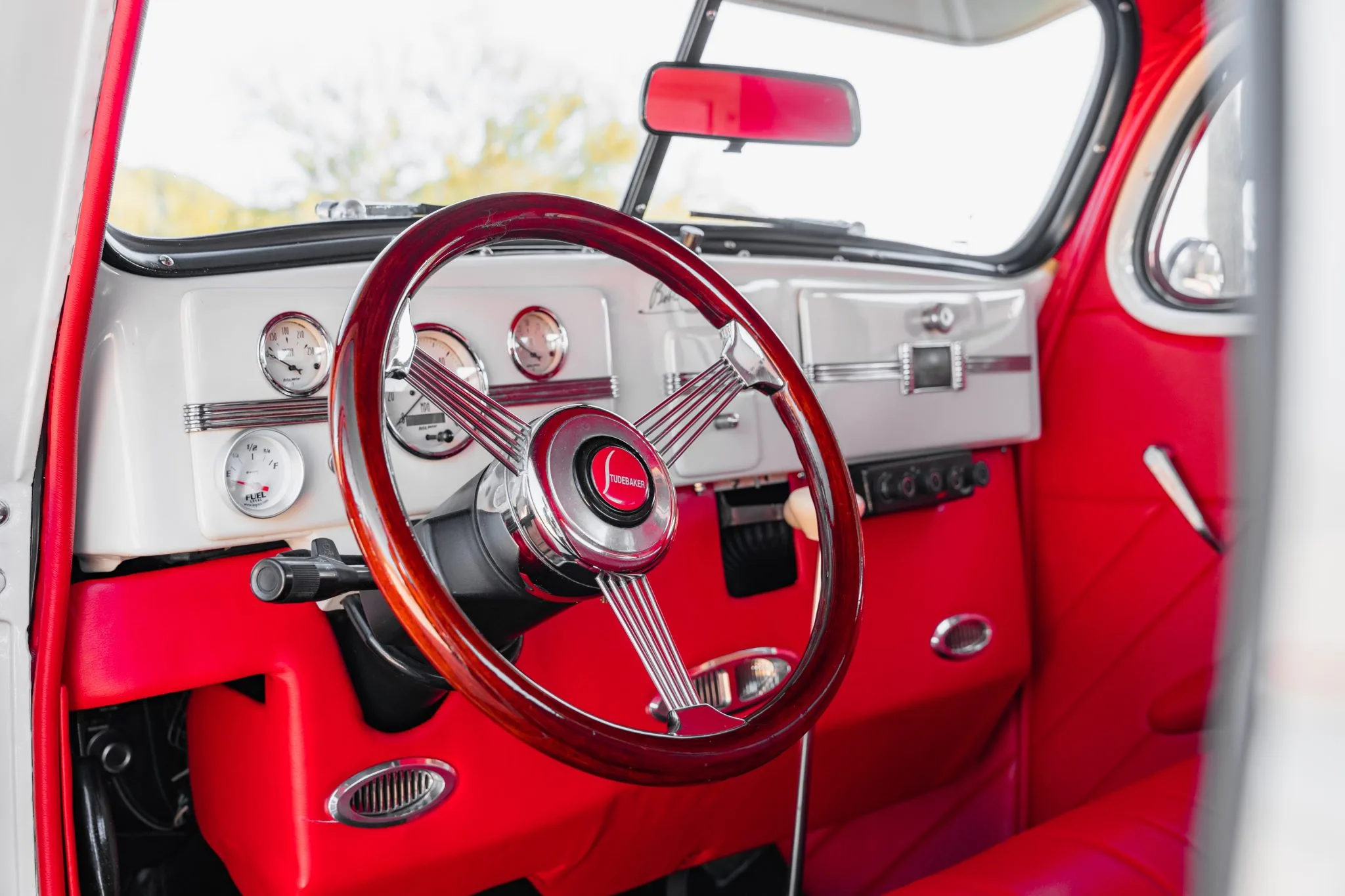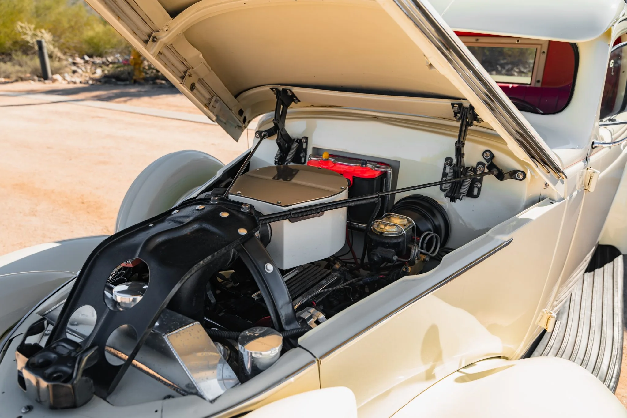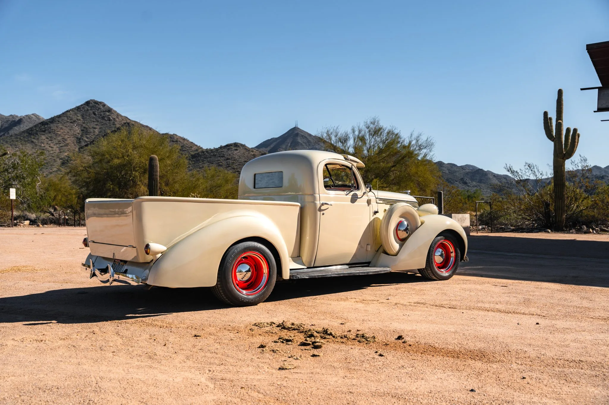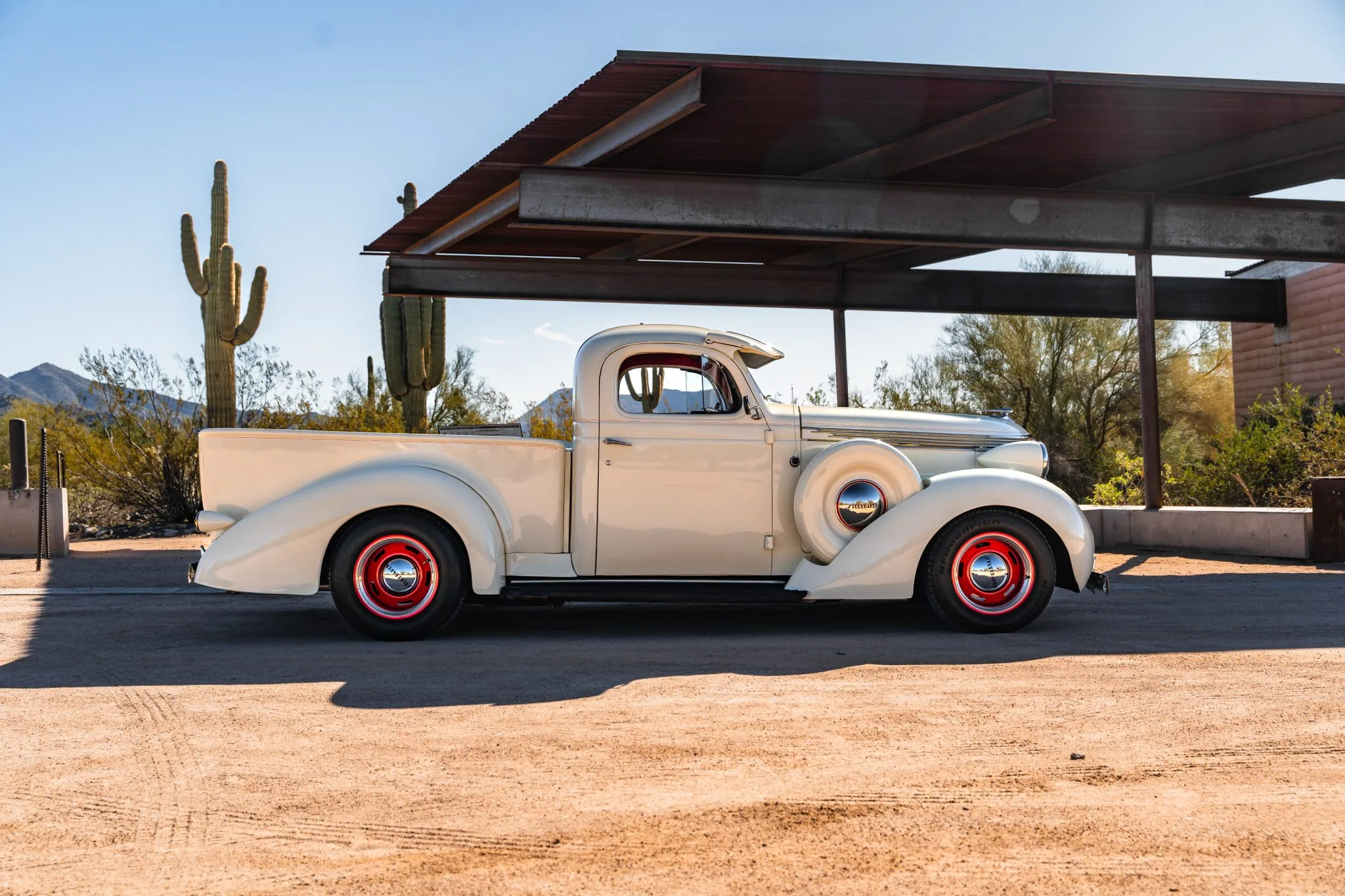 Il a reçu des mises à jour annuelles de style jusqu’à ce qu’il soit abandonné après l’année modèle 1939. La carrosserie de cet exemplaire a été sablée et les ailes élargies de 2 pouces avant d’être repeinte en crème. Les caractéristiques comprennent des pare-chocs chromés Ford 1933 modifiés, des feux de route, des clignotants avant provenant d’une Ducati, un ornement de capot, une visière de pare-brise en métal, deux rétroviseurs latéraux, des marchepieds et des feux arrière provenant d’une Chrysler de 1937. Les jantes de 15 pouces peintes en rouge proviendraient d’une Corvette et portent des enjoliveurs Studebaker et des pneus BFGoodrich Radial T/A.