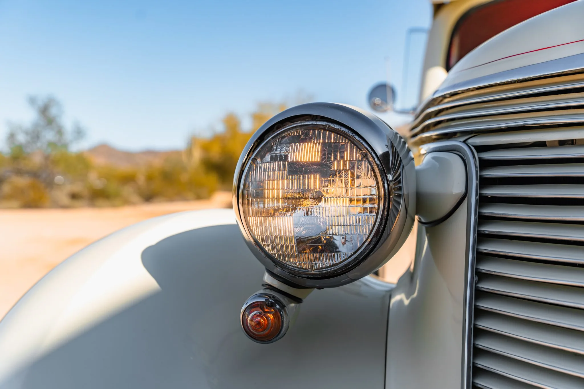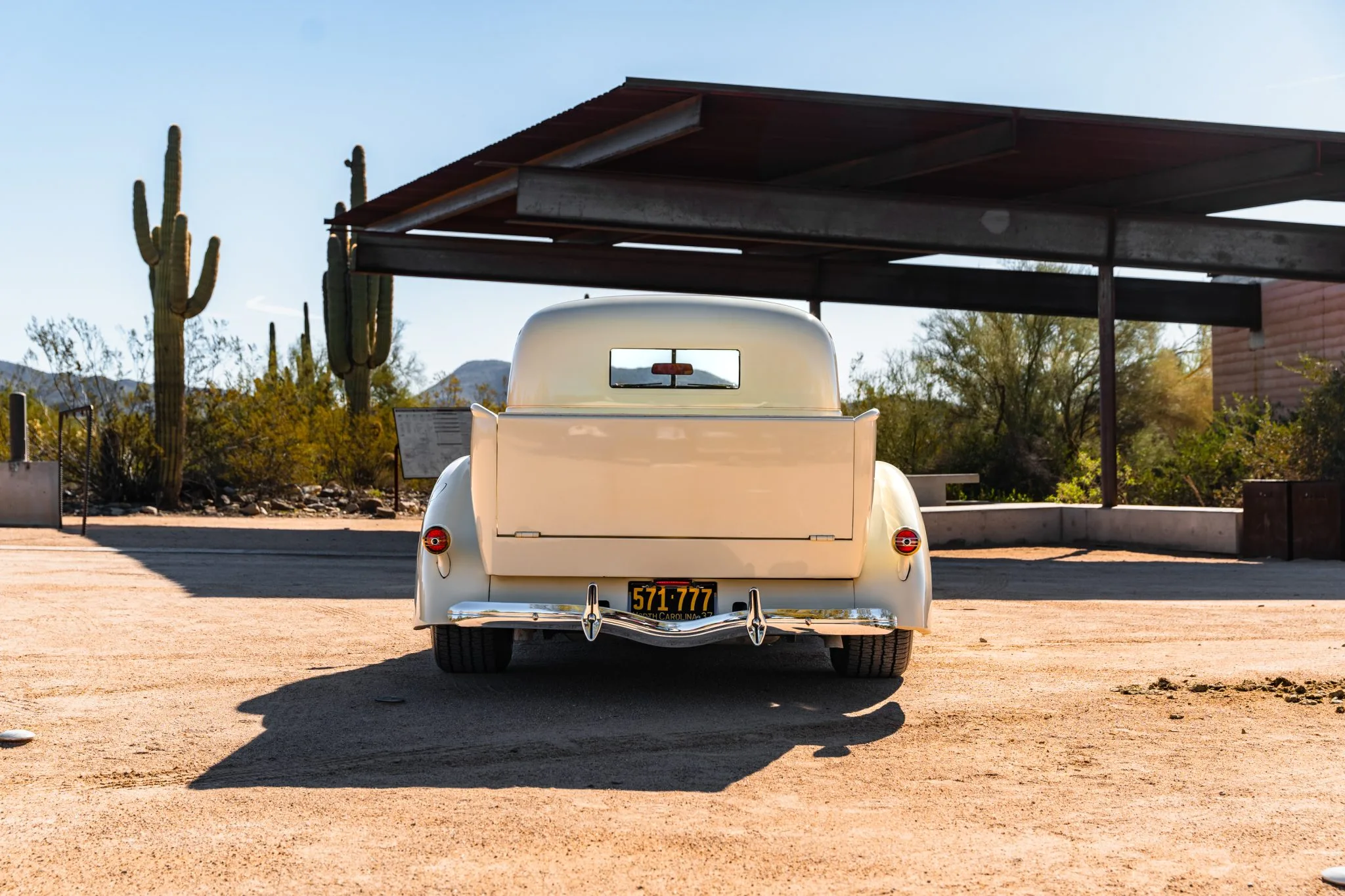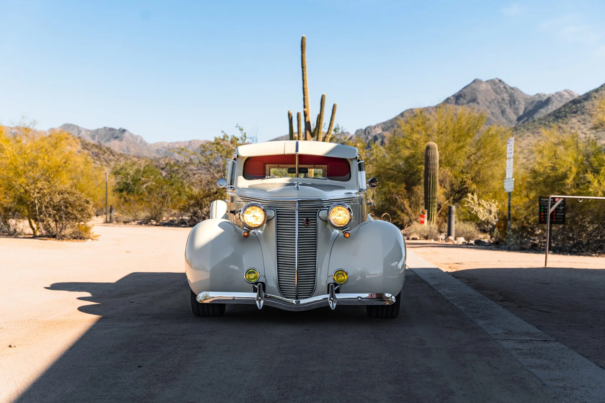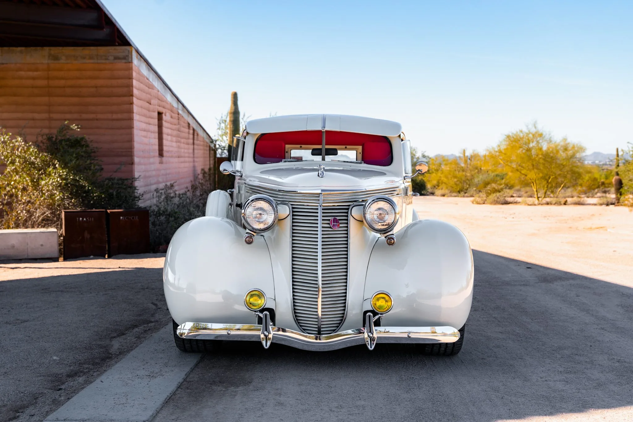 Il a reçu des mises à jour annuelles de style jusqu’à ce qu’il soit abandonné après l’année modèle 1939. La carrosserie de cet exemplaire a été sablée et les ailes élargies de 2 pouces avant d’être repeinte en crème. Les caractéristiques comprennent des pare-chocs chromés Ford 1933 modifiés, des feux de route, des clignotants avant provenant d’une Ducati, un ornement de capot, une visière de pare-brise en métal, deux rétroviseurs latéraux, des marchepieds et des feux arrière provenant d’une Chrysler de 1937. Les jantes de 15 pouces peintes en rouge proviendraient d’une Corvette et portent des enjoliveurs Studebaker et des pneus BFGoodrich Radial T/A.