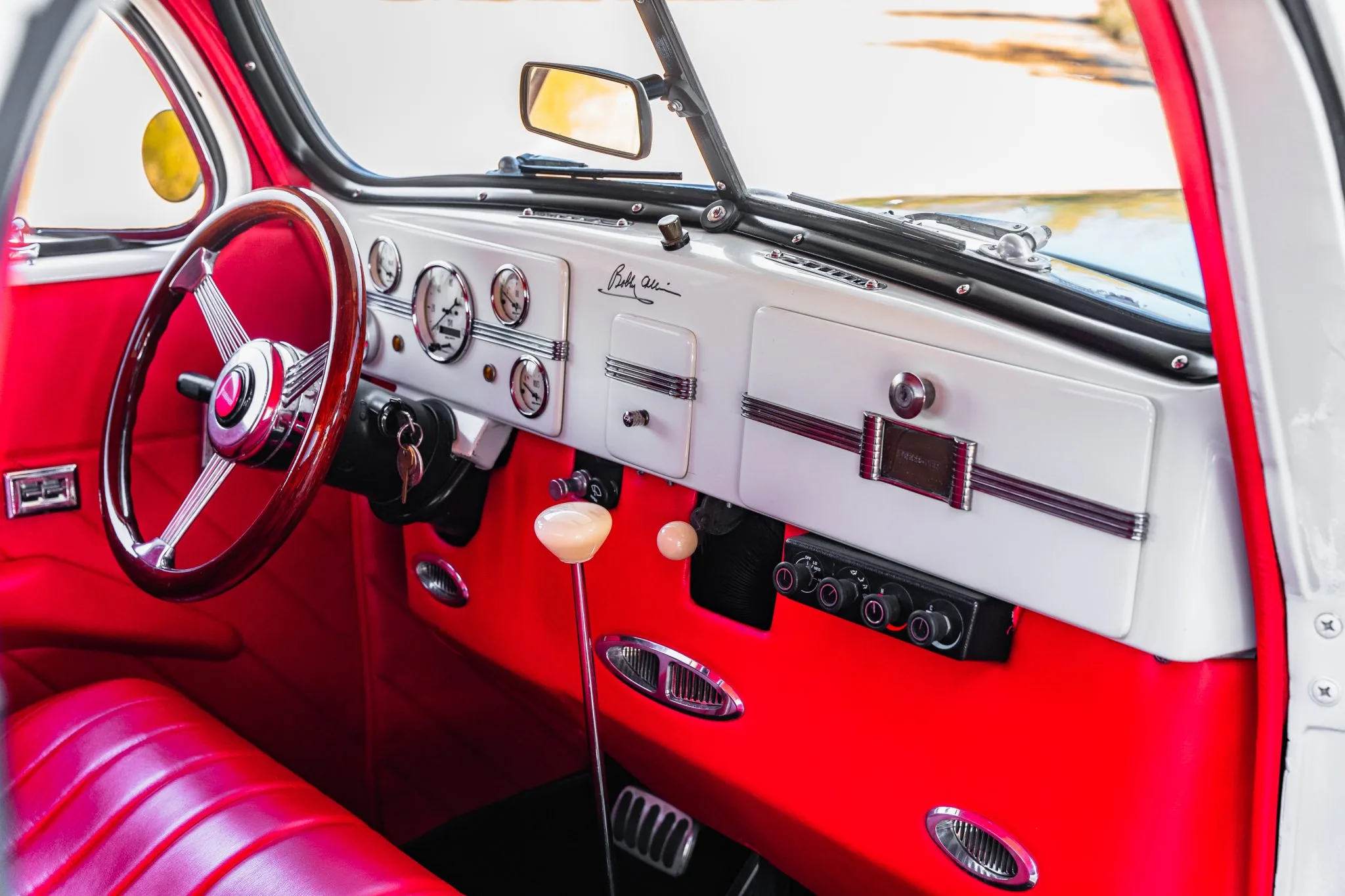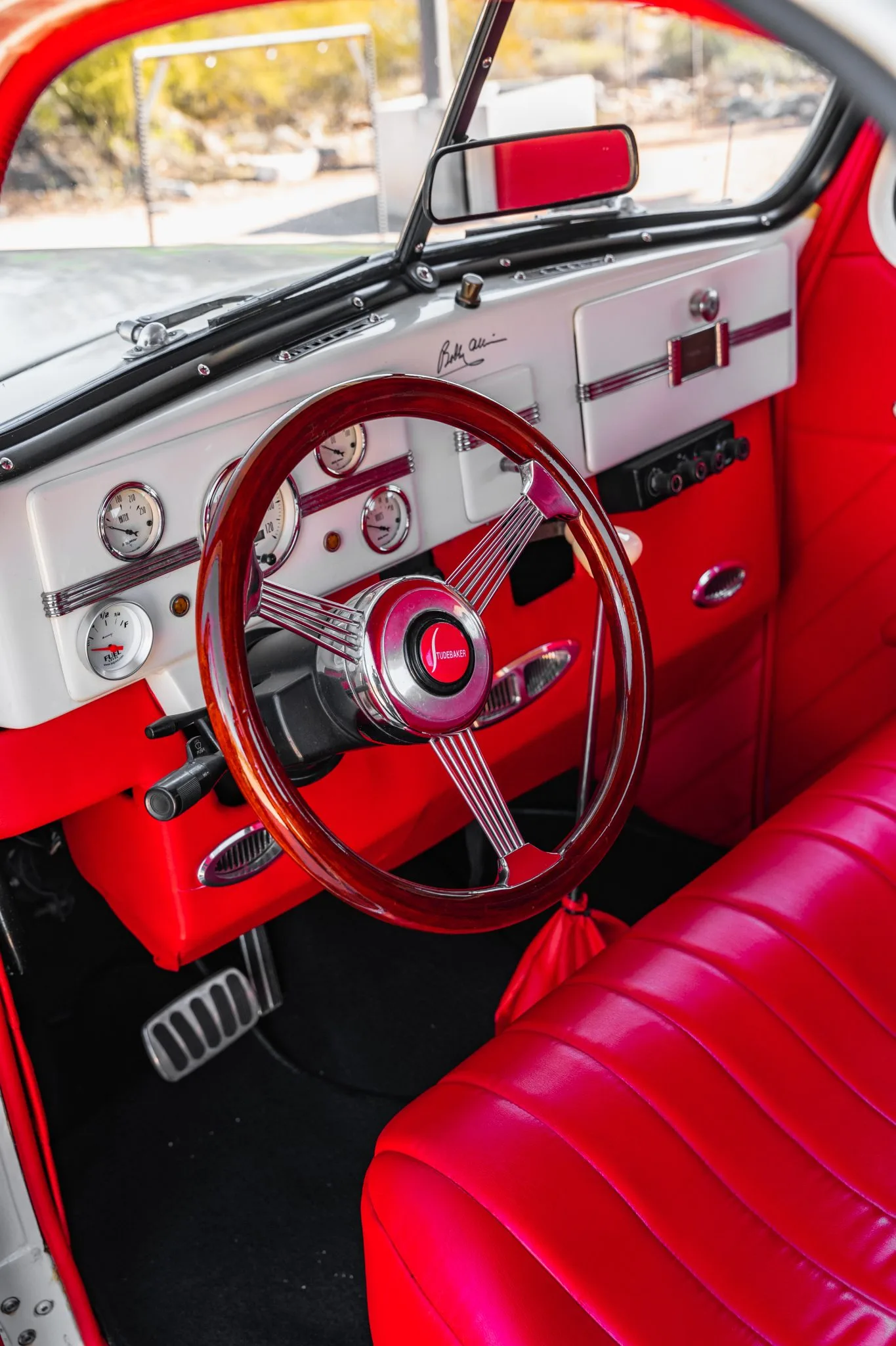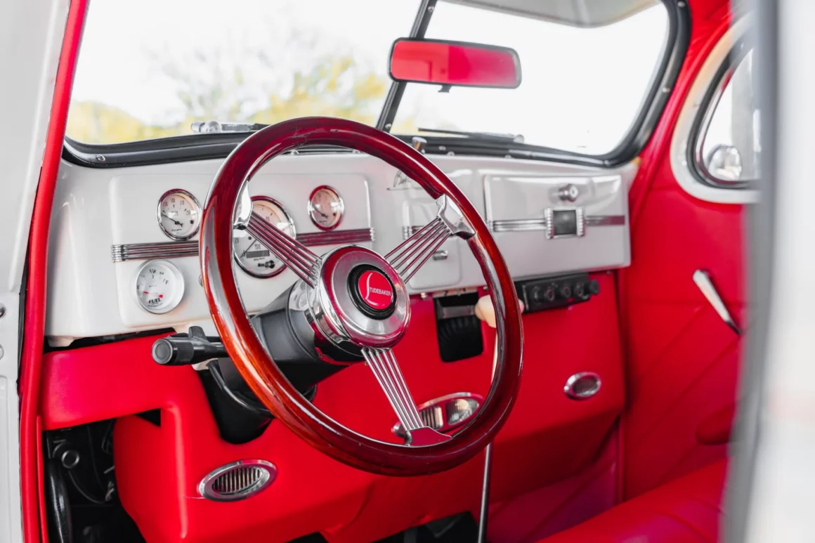 Des tapis noirs tapissent les planchers, et l’équipement supplémentaire comprend des vitres électriques, un système CVC VintageAir et une chaîne stéréo Bluetooth jumelée à l’audio Focal. Le tableau de bord porte la signature de Bobby Allison. Le volant de style banjo à monture de bois Grant est doté d’un bouton de moyeu Studebaker et il est monté sur une colonne inclinable devant un tableau de bord en acier peint abritant un compteur de vitesse AutoMeter de 120 mph et des jauges auxiliaires. Le compteur kilométrique numérique indique 53 000 miles, dont 15 000 ont été ajoutés sous la propriété du vendeur. Le V8 LT1 de 5,7 litres provient d’une Chevrolet de 1996 et a été reconstruit. Un alternateur est équipé d’un radiateur en aluminium Be Cool, de deux ventilateurs électriques, d’une boîte à air personnalisée et d’une batterie Optima Red Top. La puissance est envoyée aux roues arrière via une transmission automatique 4L60-E à quatre vitesses.