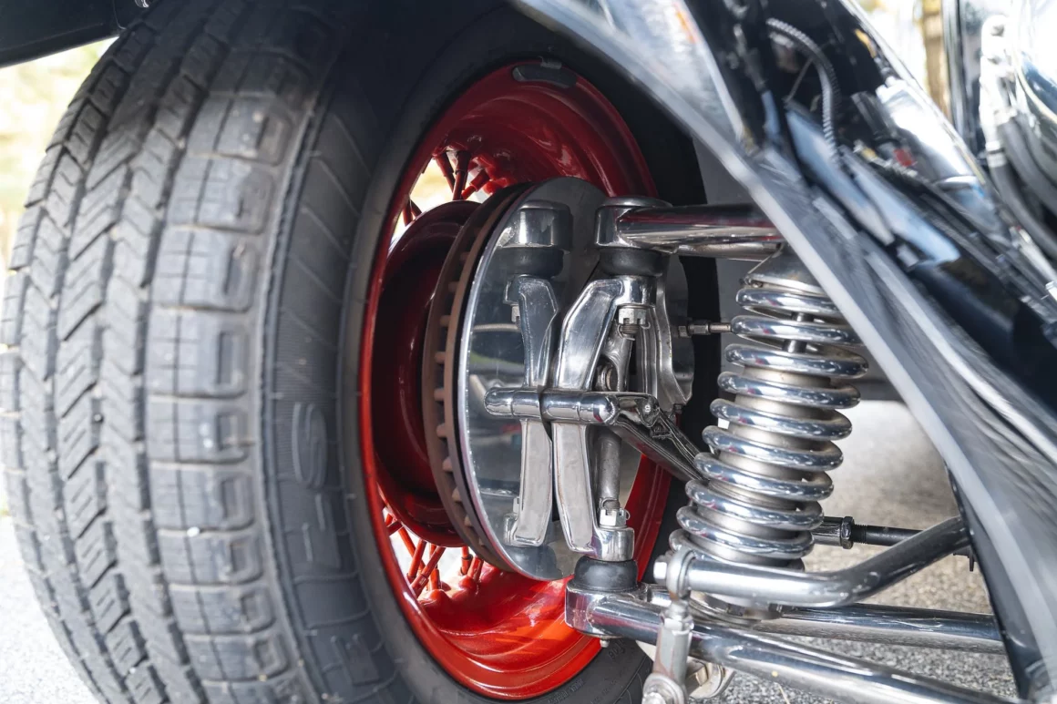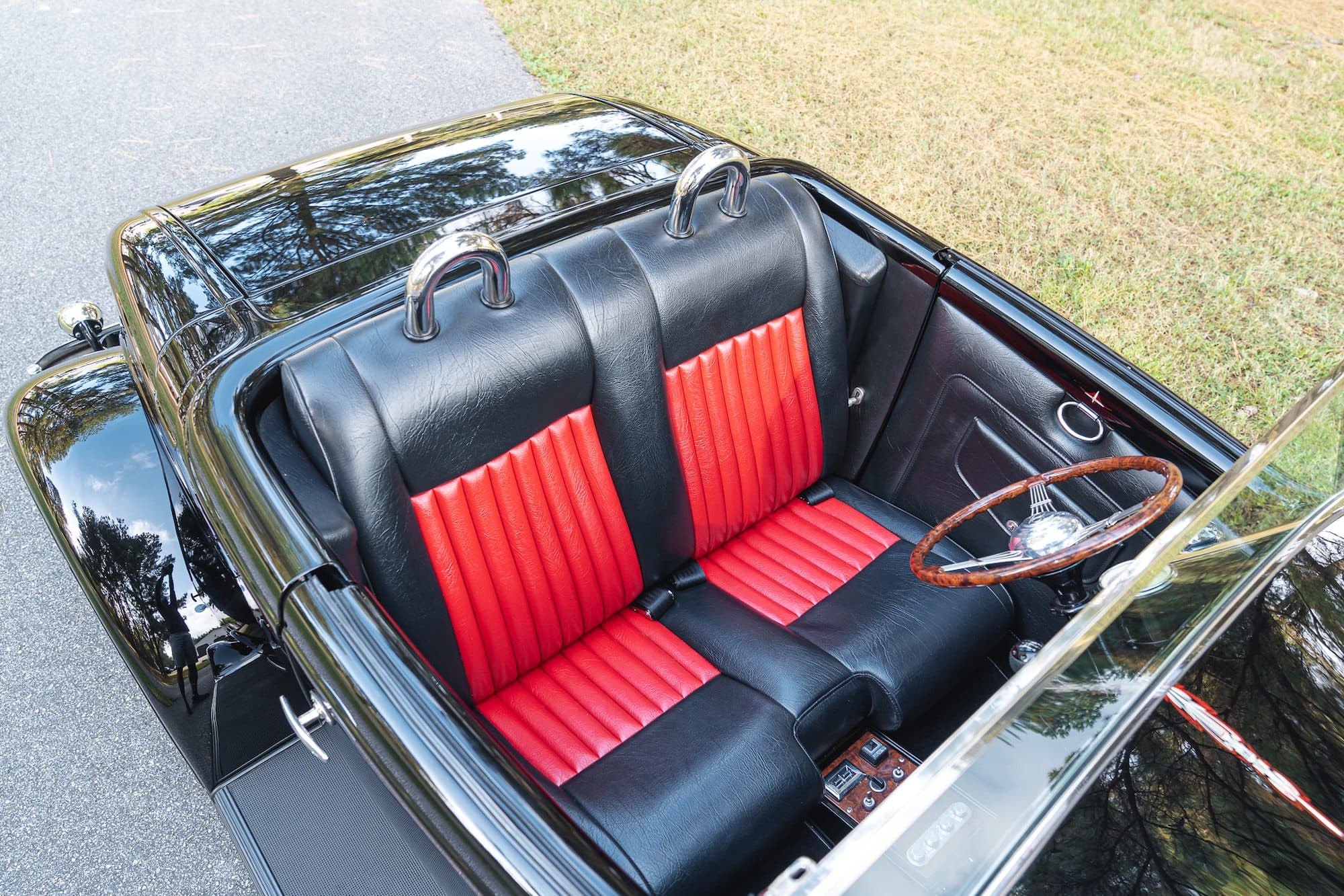 Il est basé sur un châssis Broqueville avec un système de suspensions Heidts Superide équipées de combinés filetés réglables et de freins à disque Wilwood offrant une maniabilité et une puissance de freinage bien meilleures que les originaux. Le châssis est tout en acier, vient de Dearborn Deuce et est fini avec une peinture PPG noire appliquée par Jerry Campbell du Delaware. Le Hot Rod est doté d’un pare-brise pivotant et d’une capote rabattable escamotable en toile noire. Je ne sais vous en écrire plus sans redire pareil… Donc revoyez les photos et relisez tout puis passez aux autres articles…