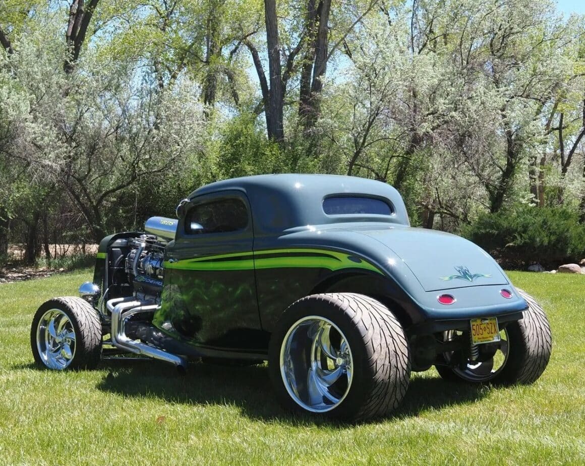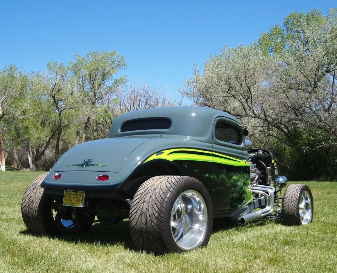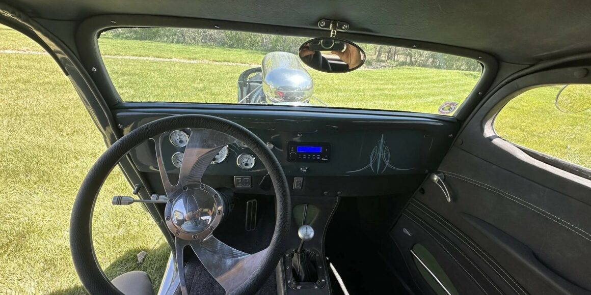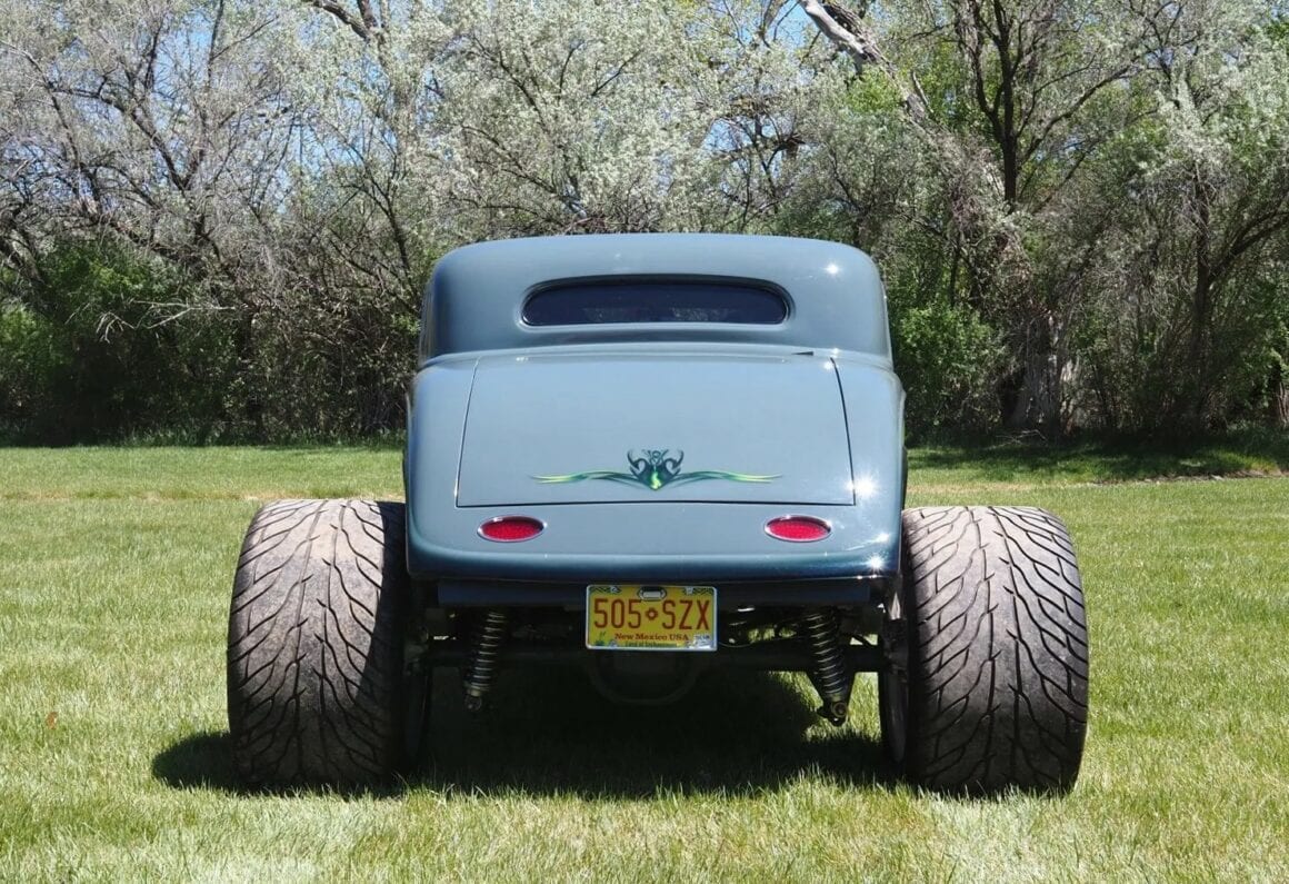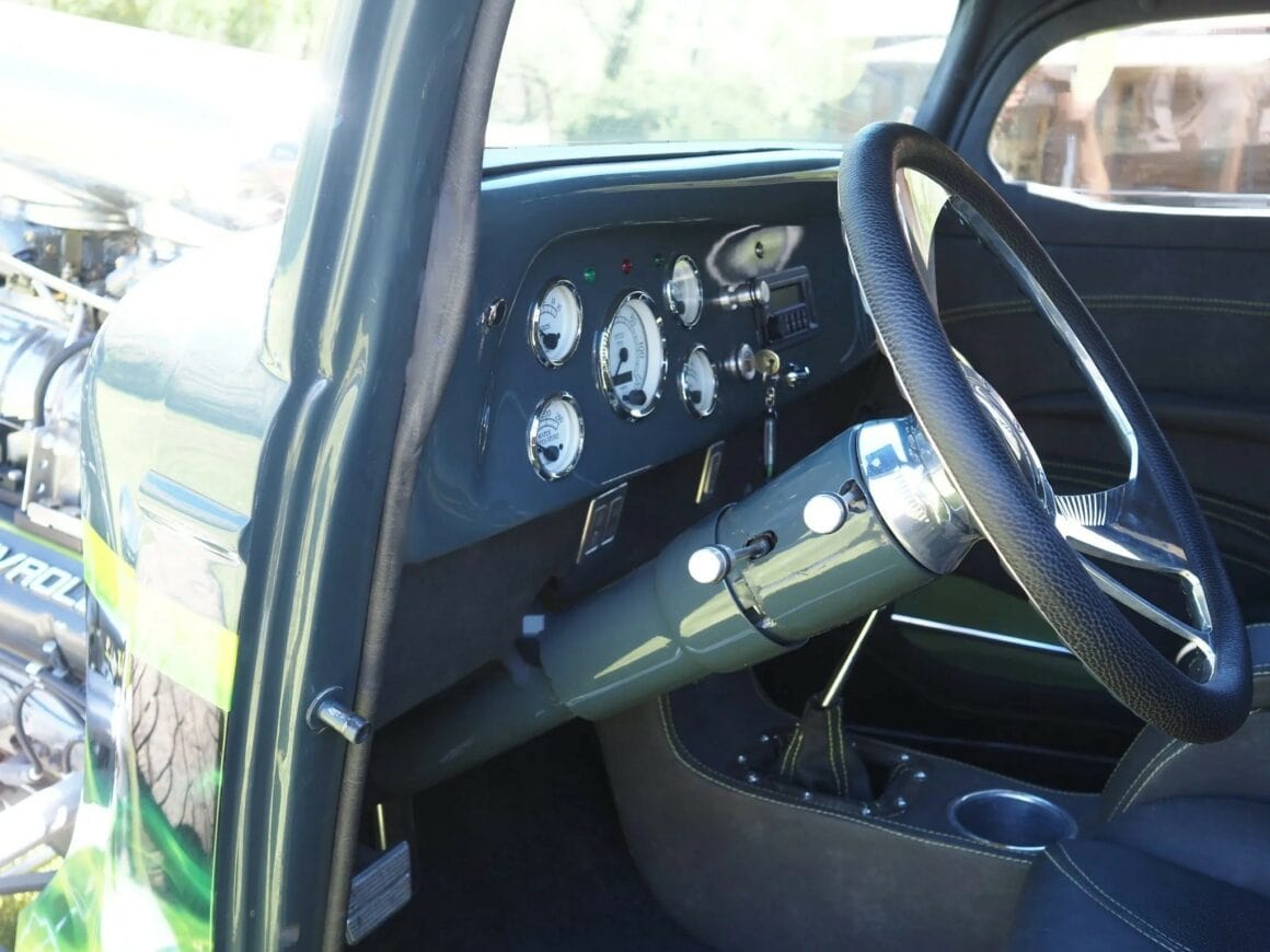 Un distributeur MSD et un module 6AL-2 ont été installés ainsi qu’un radiateur en aluminium refroidi par un ventilateur électrique SPAL. La puissance est envoyée aux roues arrière par une transmission automatique à trois vitesses manœuvrée par un levier Lokar. Peinte en gris/vert et noir avec des graphiques de flammes vertes par Airgraphics de Farmington, au Nouveau-Mexique, la carrosserie en fibre de verre est montée sur un châssis en acier tubulaire fabriqué sur mesure.