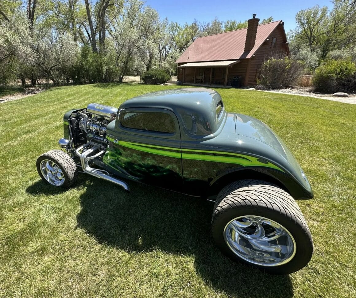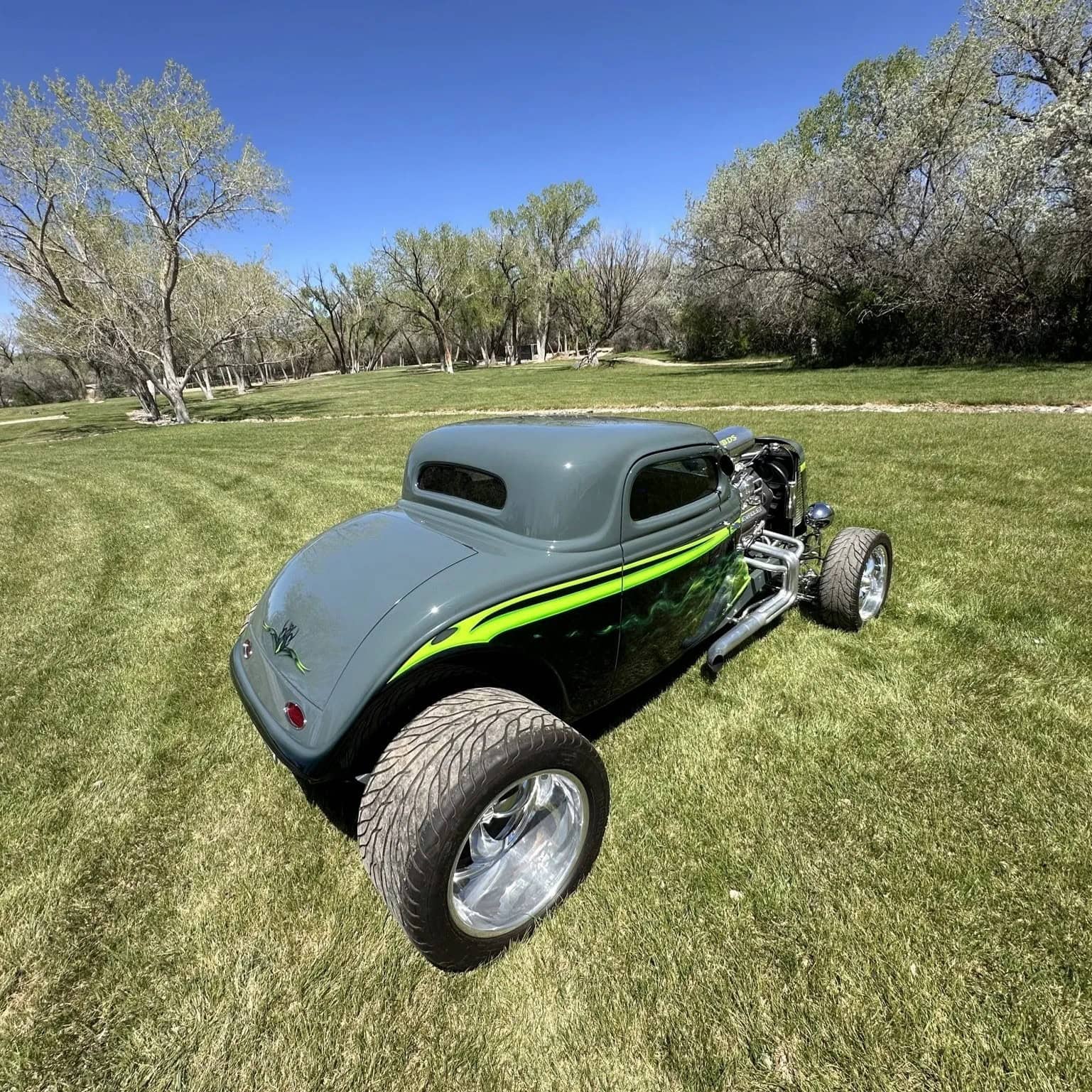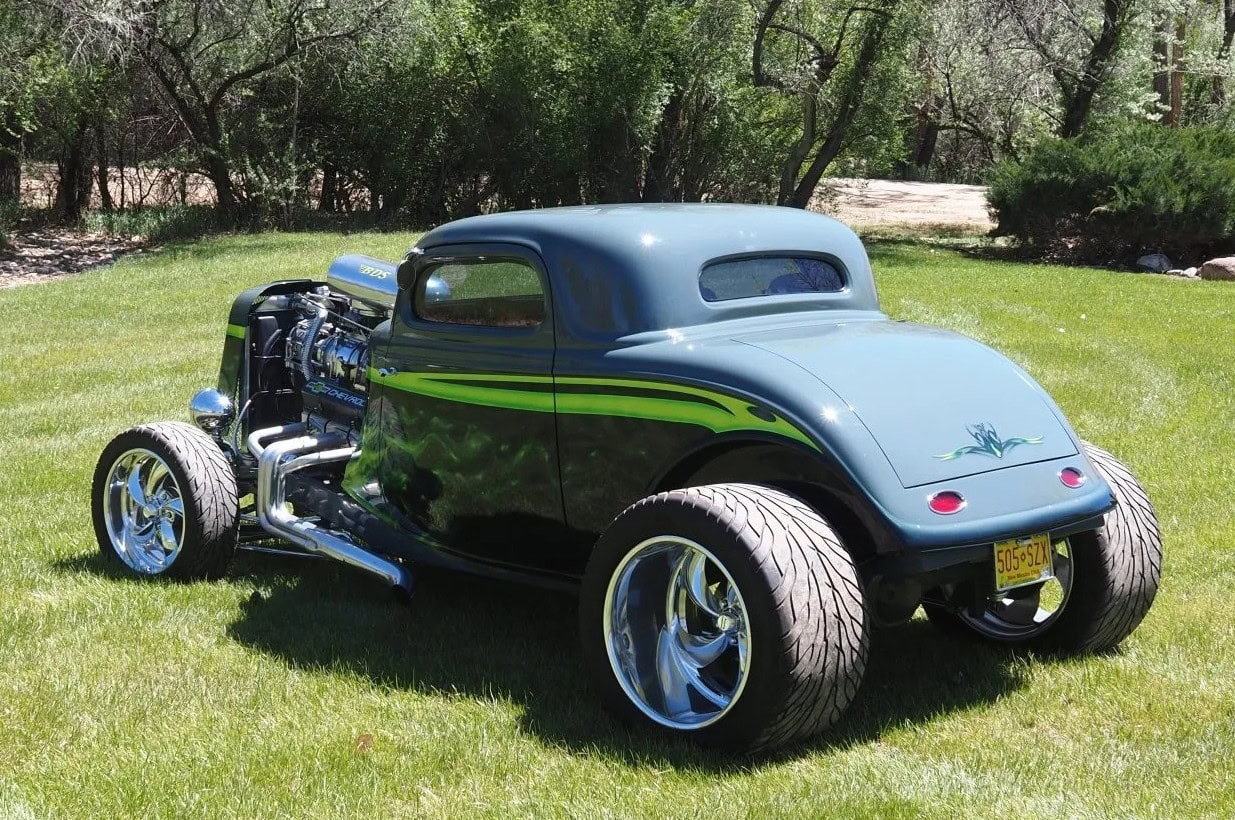 Un distributeur MSD et un module 6AL-2 ont été installés ainsi qu’un radiateur en aluminium refroidi par un ventilateur électrique SPAL. La puissance est envoyée aux roues arrière par une transmission automatique à trois vitesses manœuvrée par un levier Lokar. Peinte en gris/vert et noir avec des graphiques de flammes vertes par Airgraphics de Farmington, au Nouveau-Mexique, la carrosserie en fibre de verre est montée sur un châssis en acier tubulaire fabriqué sur mesure.
