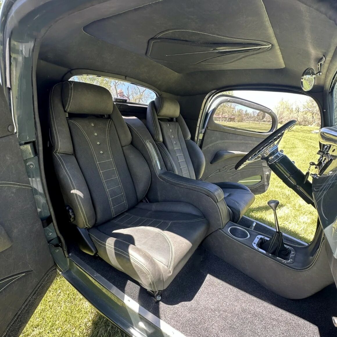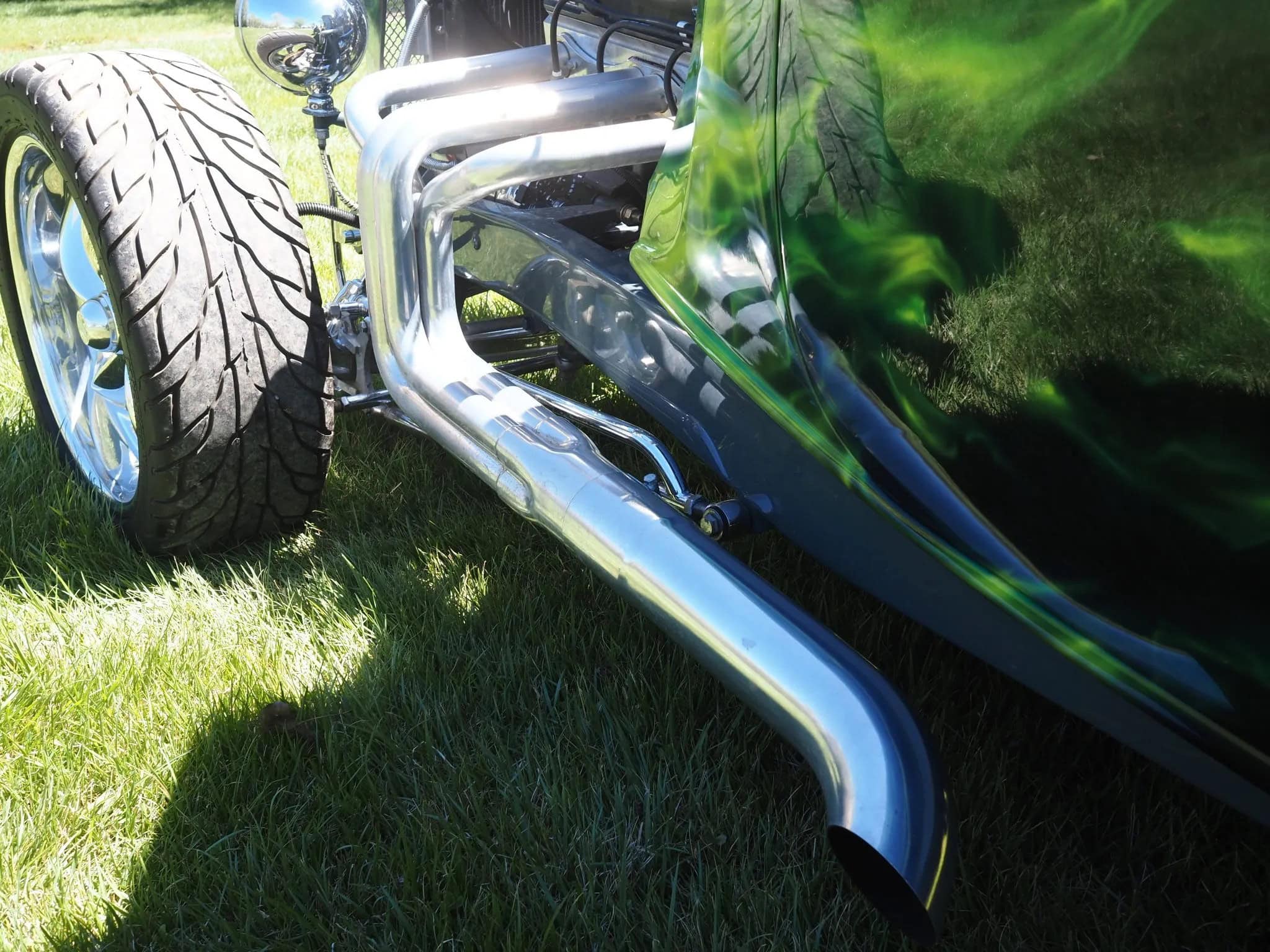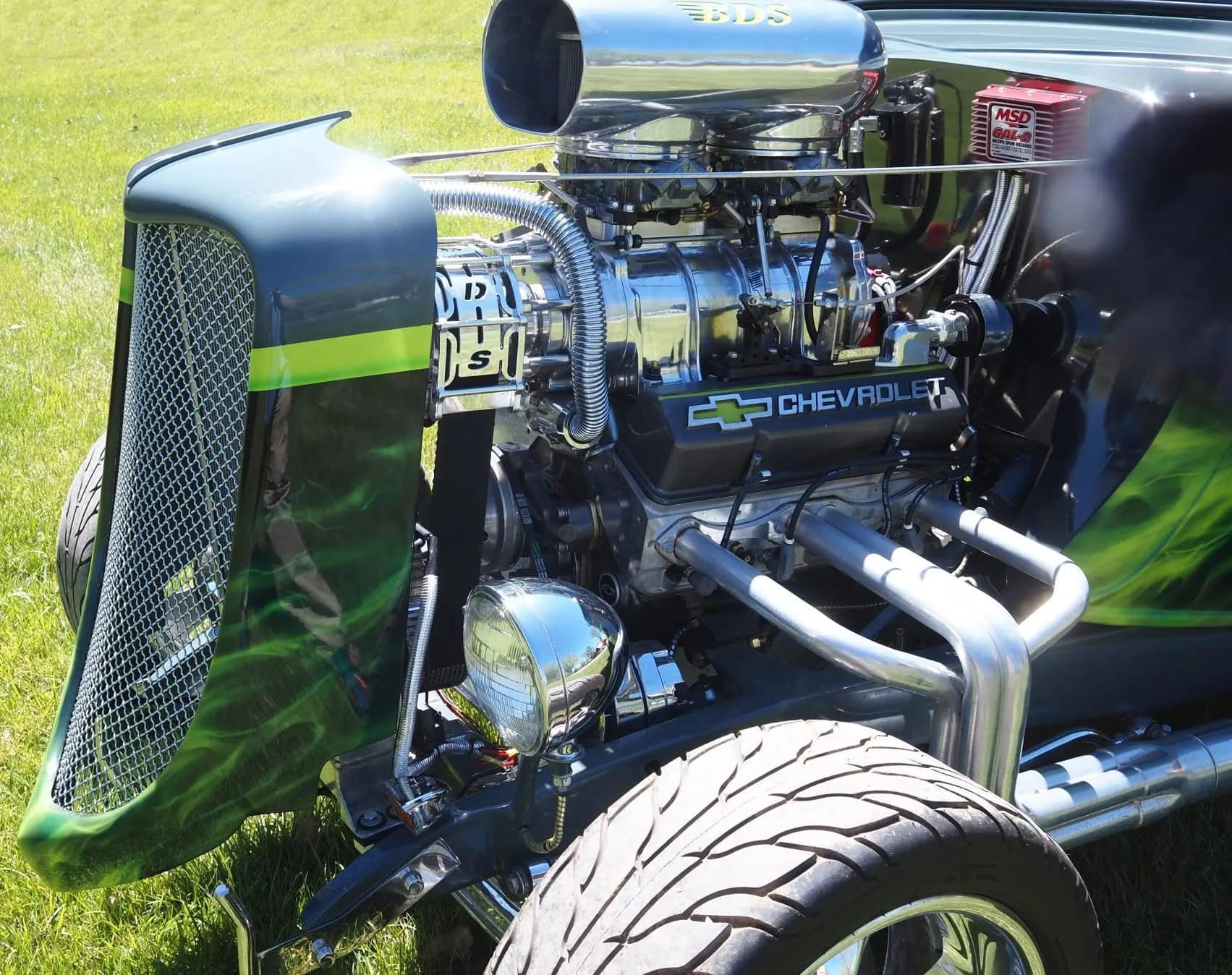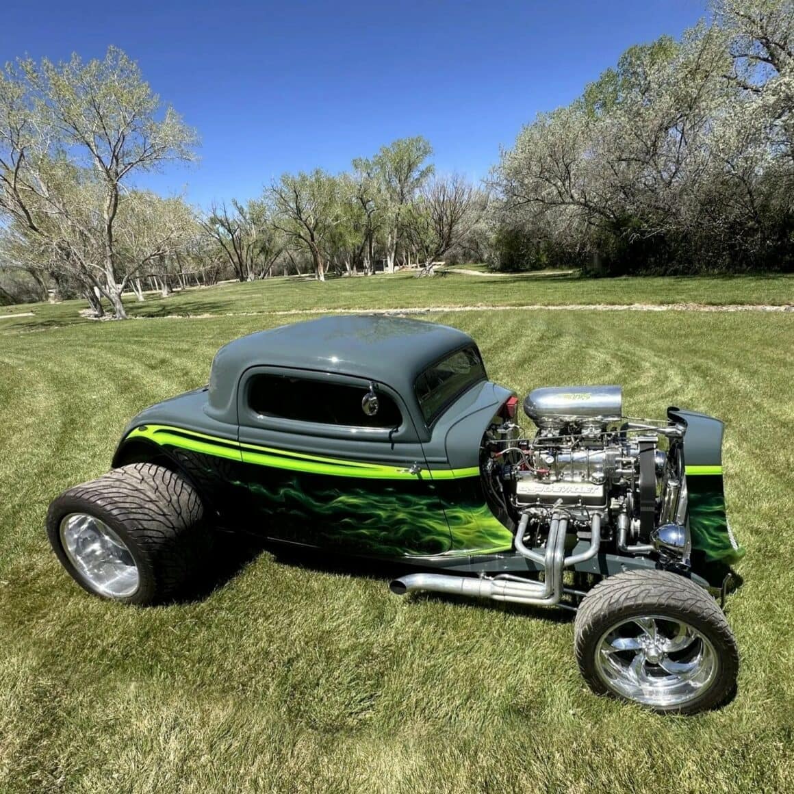 Un distributeur MSD et un module 6AL-2 ont été installés ainsi qu’un radiateur en aluminium refroidi par un ventilateur électrique SPAL. La puissance est envoyée aux roues arrière par une transmission automatique à trois vitesses manœuvrée par un levier Lokar. Peinte en gris/vert et noir avec des graphiques de flammes vertes par Airgraphics de Farmington, au Nouveau-Mexique, la carrosserie en fibre de verre est montée sur un châssis en acier tubulaire fabriqué sur mesure.