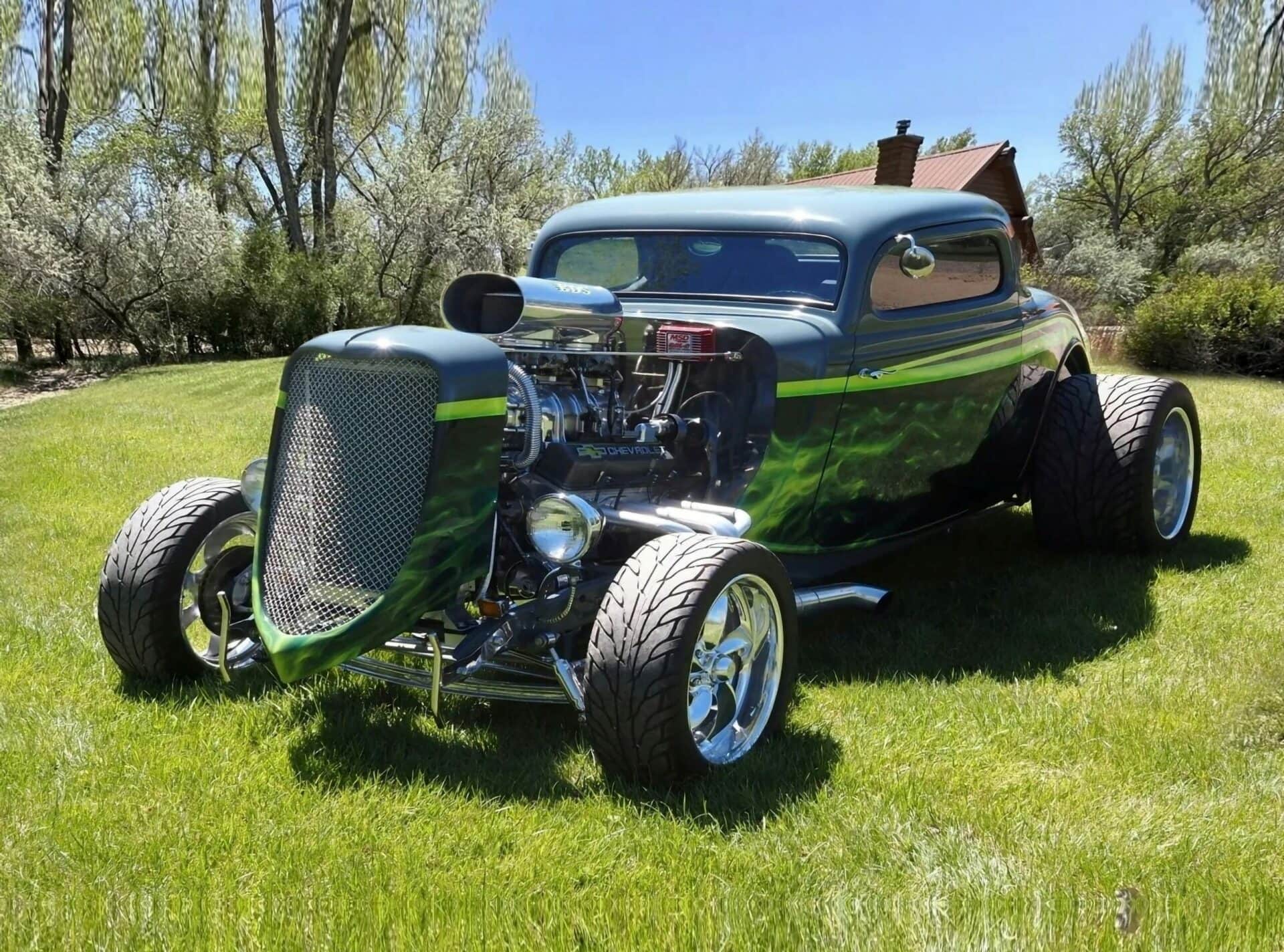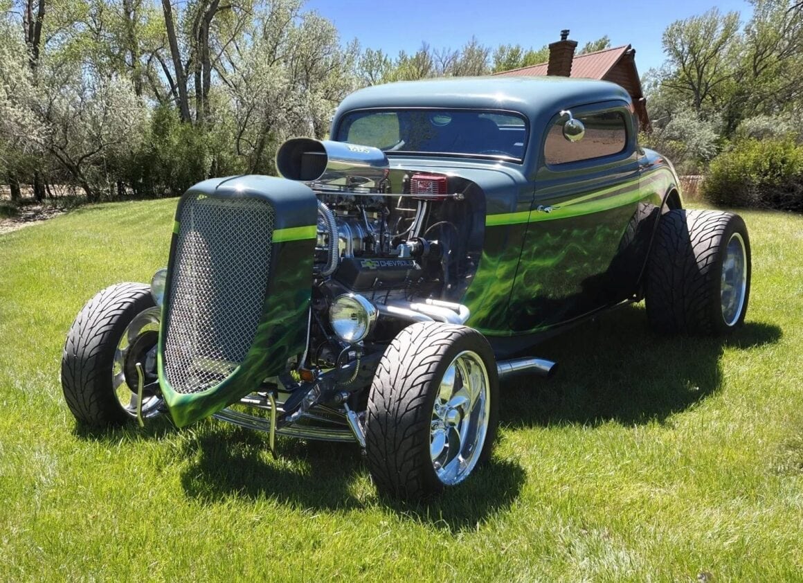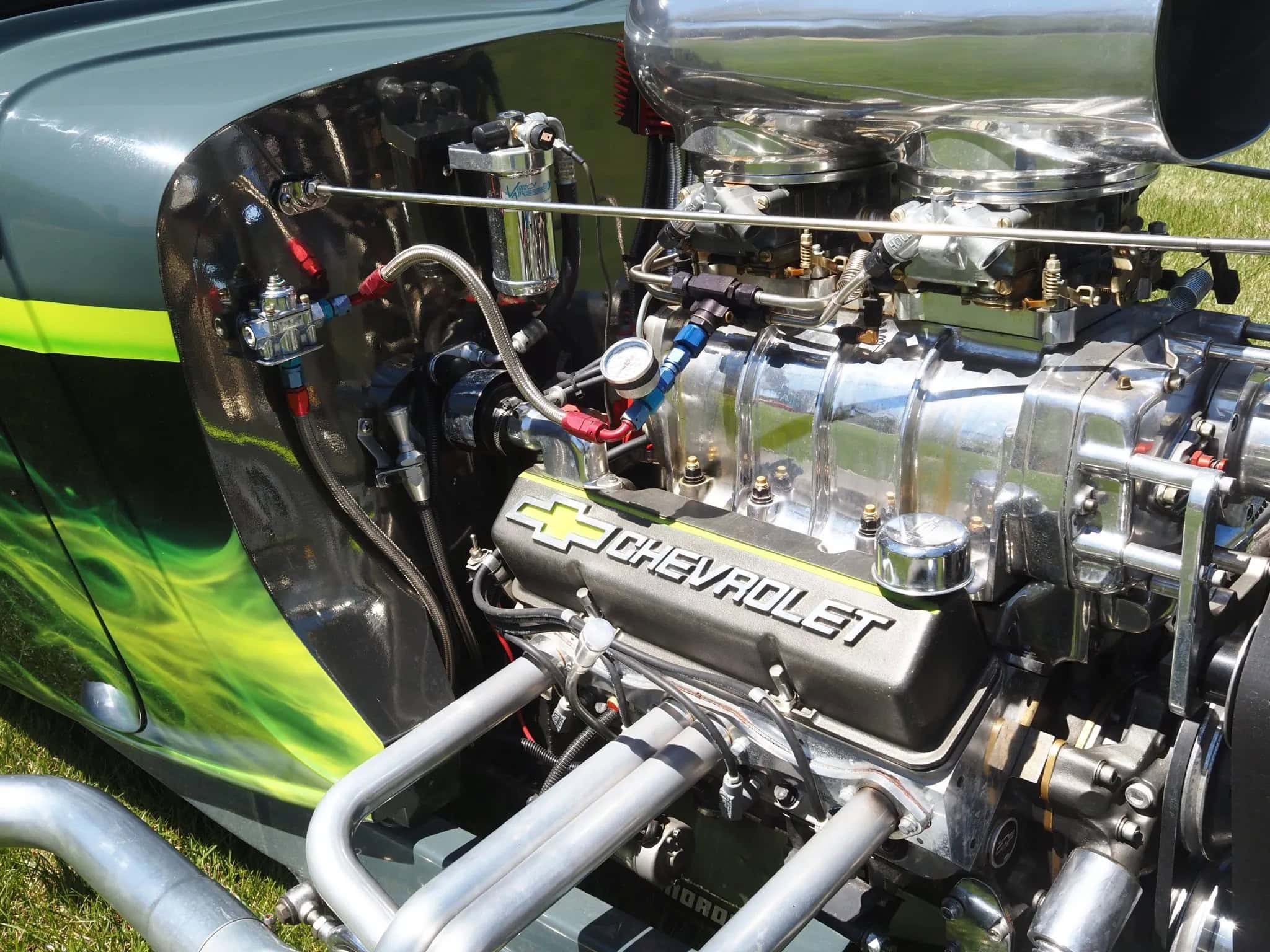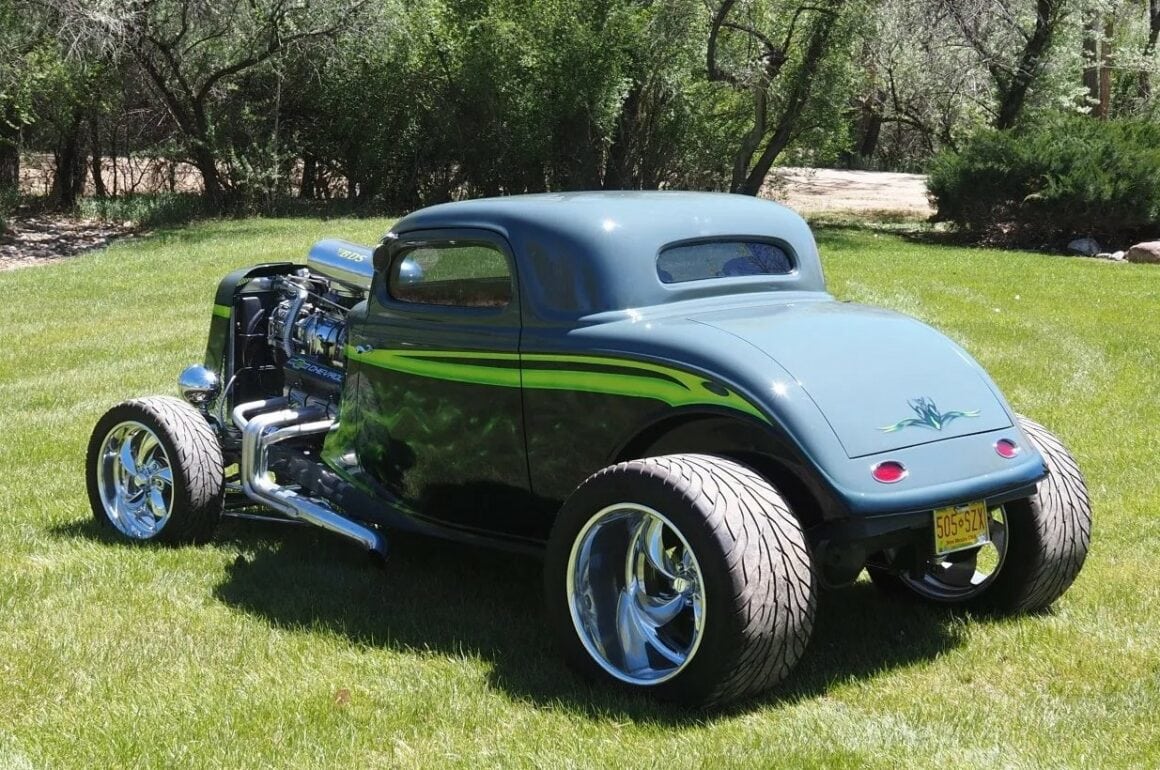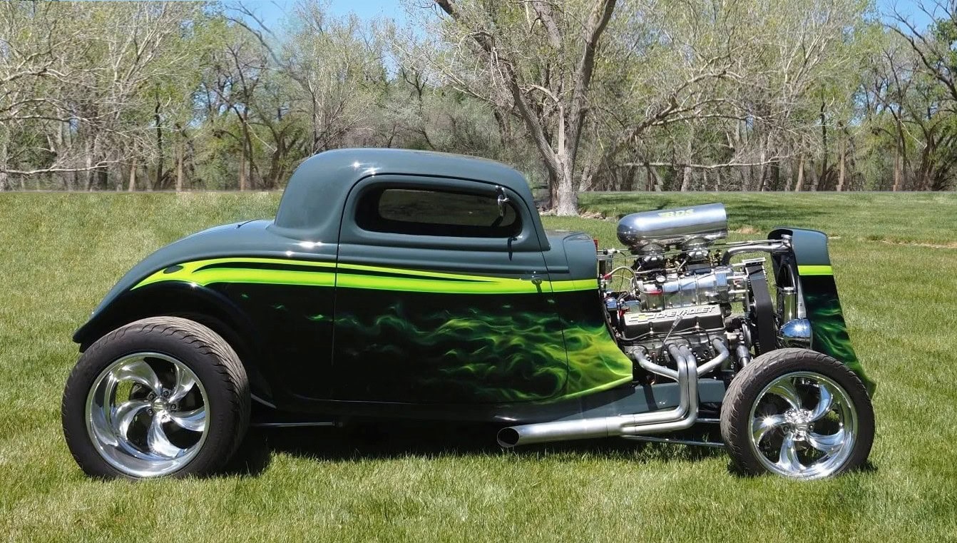 Bien, du coup j’suis bien entouré… Allez, hop, en avant, v’la l’texte… Ouauissss ! Ce Hot Rod Ford Coupé’33 three windows a été construit à 100% par son propriétaire actuel il y a environ dix ans. Le V8 383ci stroker Chevy a été refait de A à Z par Don Maples Racing. Les pièces maîtresses sont le vilebrequin Scat série 9000, des pistons Racing, des bielles forgés et des culasses en aluminium. Le compresseur BDS est alimenté par deux carburateurs Holley à quatre corps le tout surmonté d’une prise d’air chromée.