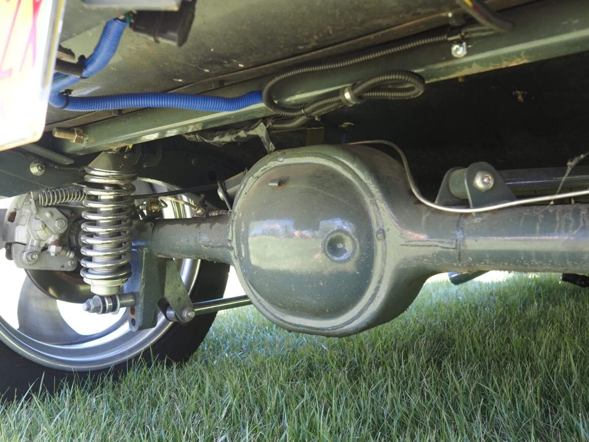 Les jantes sont des American Racing en 18 pouces chaussées de pneus Mickey Thompson de 26×10,00 po à l’avant et de 31×18,00 po à l’arrière. Il y a des freins à disque aux quatre roues, la suspension arrière est triangulée à quatre bras avec combinés filetés réglables. L’intérieur comprend des sièges baquets personnalisés garnis d’une sellerie grise avec des coutures contrastantes, identiques à la garniture de toit, aux panneaux des portes et au coffre. Le volant est un Budnik. Une unité infodivertissement Custom Autosound a été installée.