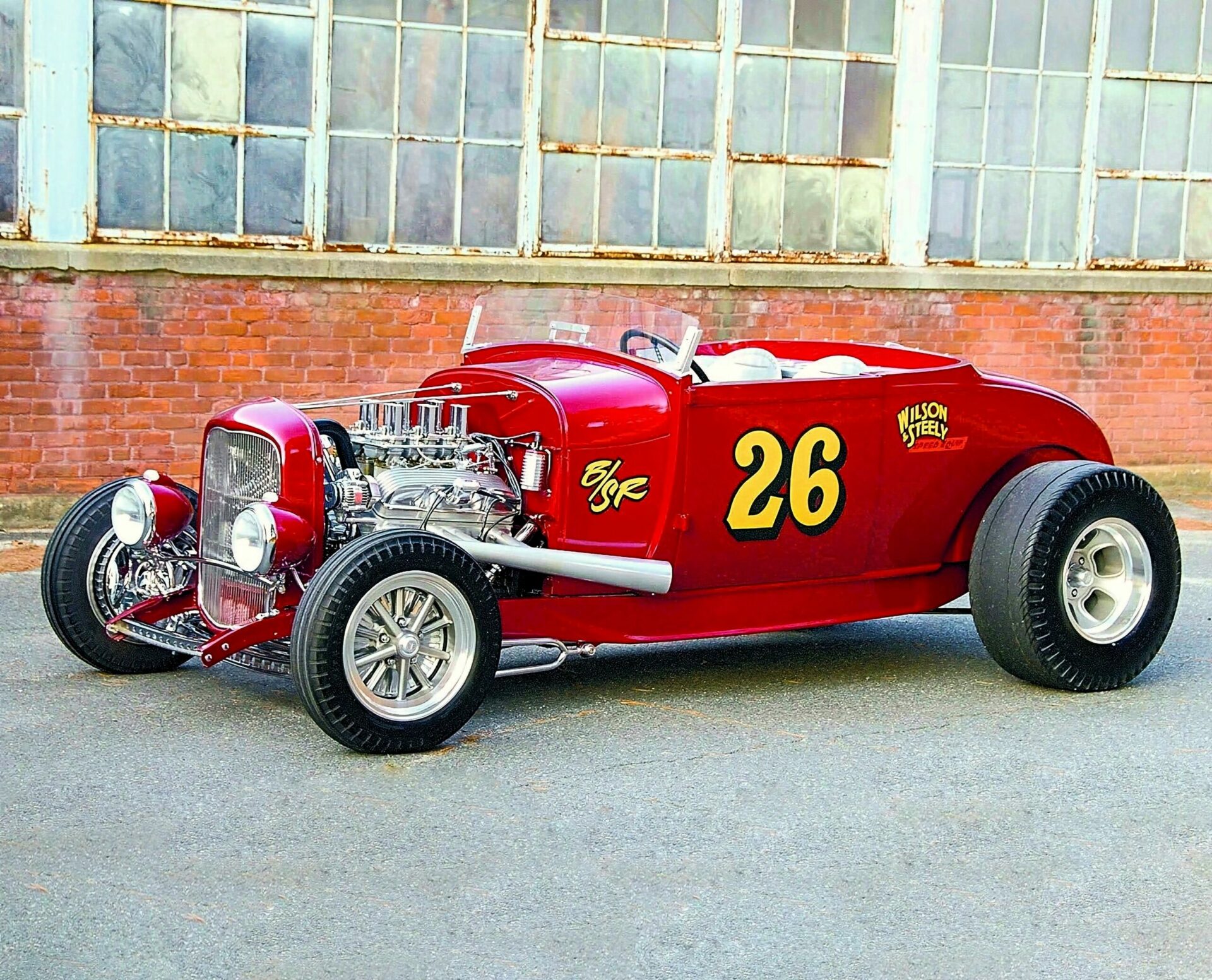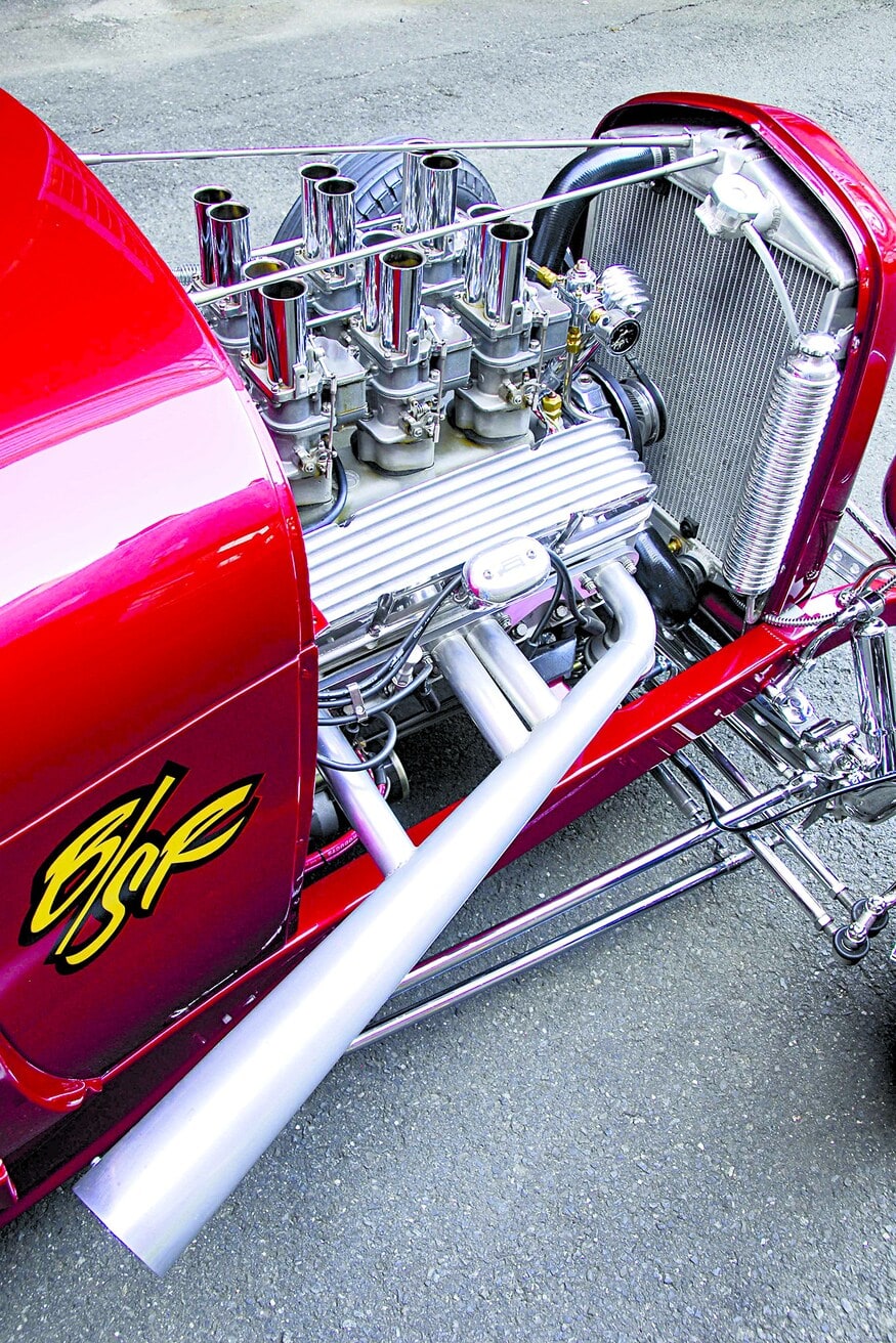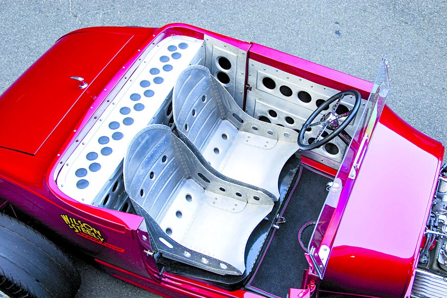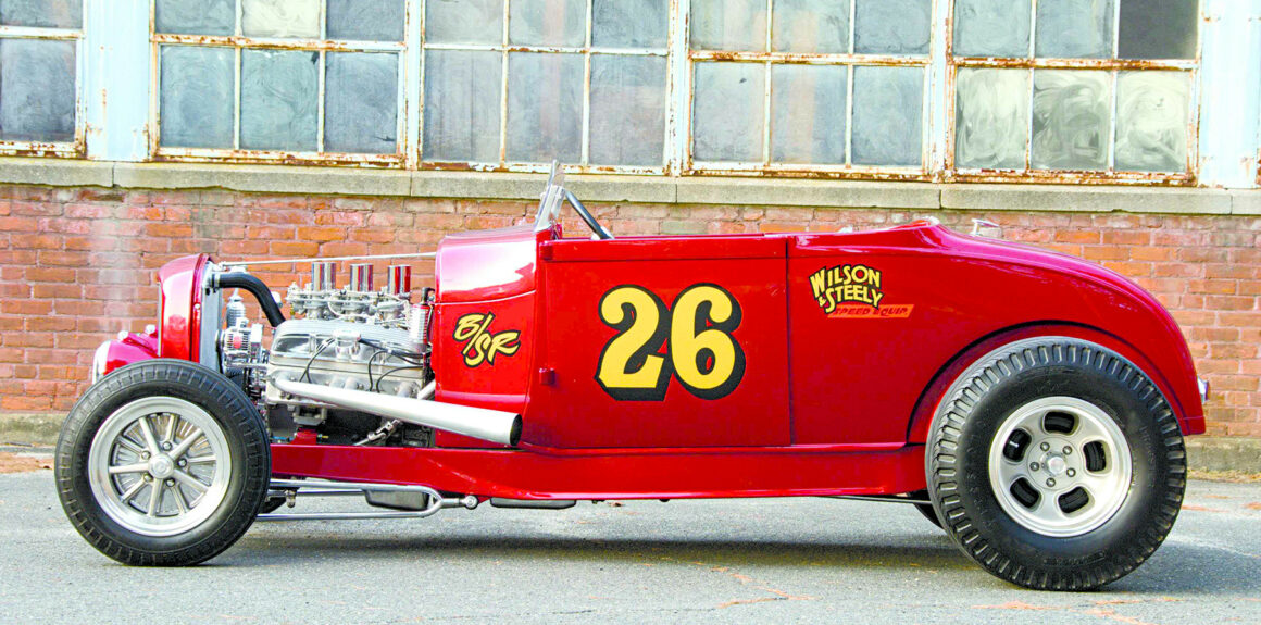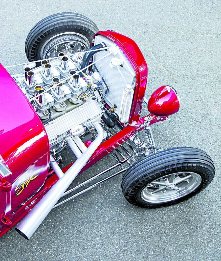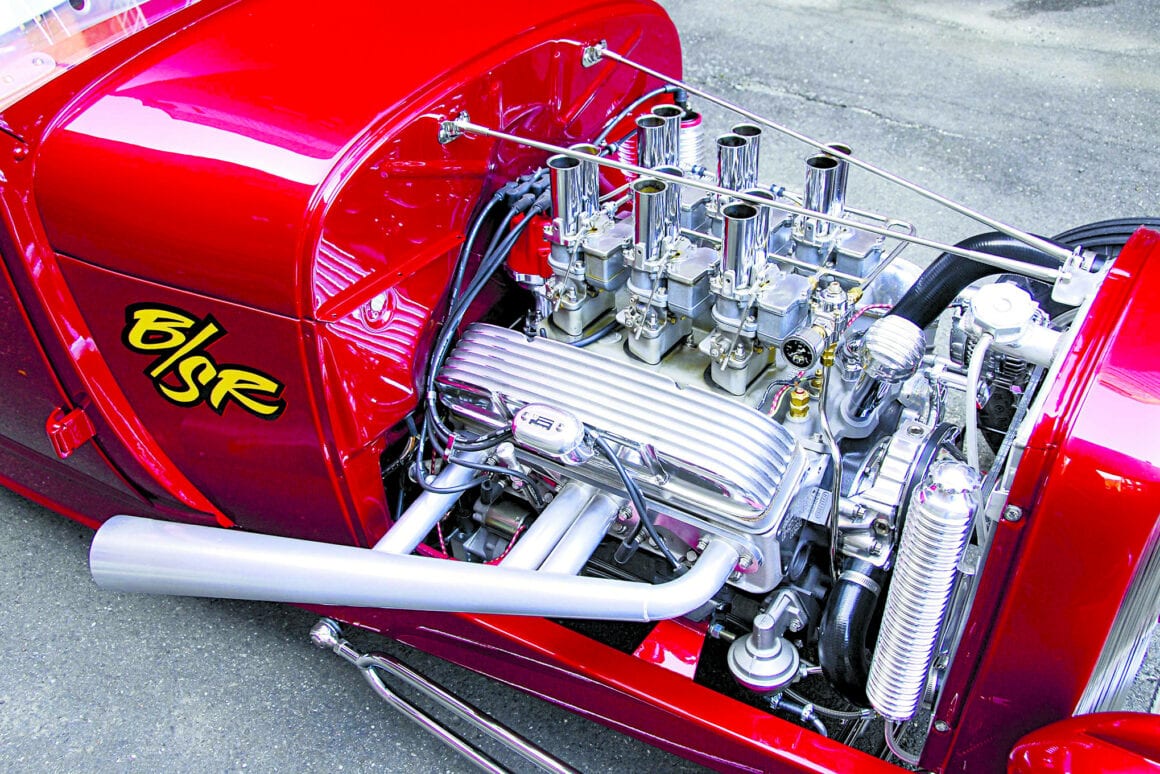 Il a finalement été conduit dans un garage voisin où une carrosserie de coupé sport Ford 1929 était cachée sous un kilomètre de poussière. Après un rapide essai, Steve a conclu un accord et a ramené la voiture à l’atelier. Steve a contacté Wheeler Power Products à Jacksonville, en Floride, pour leur acheter l’un de leurs robustes V8 à petit bloc Chevy. Il a ensuite travaillé avec Bob Mahoney de Nashua, New Hampshire, pour améliorer le moteur en ajoutant des culasses en aluminium Edelbrock, une prise d’air Offy à six points et un escadron de carburateurs Stromberg de la série 97/Scott. Pour déplacer la bête, une boîte automatique Turbo 350 modifiée par Performance Automotive de Frederick, dans le Maryland, mène à un arbre de transmission personnalisé. En ce qui concerne la carrosserie, Steve avait beaucoup d’idées.