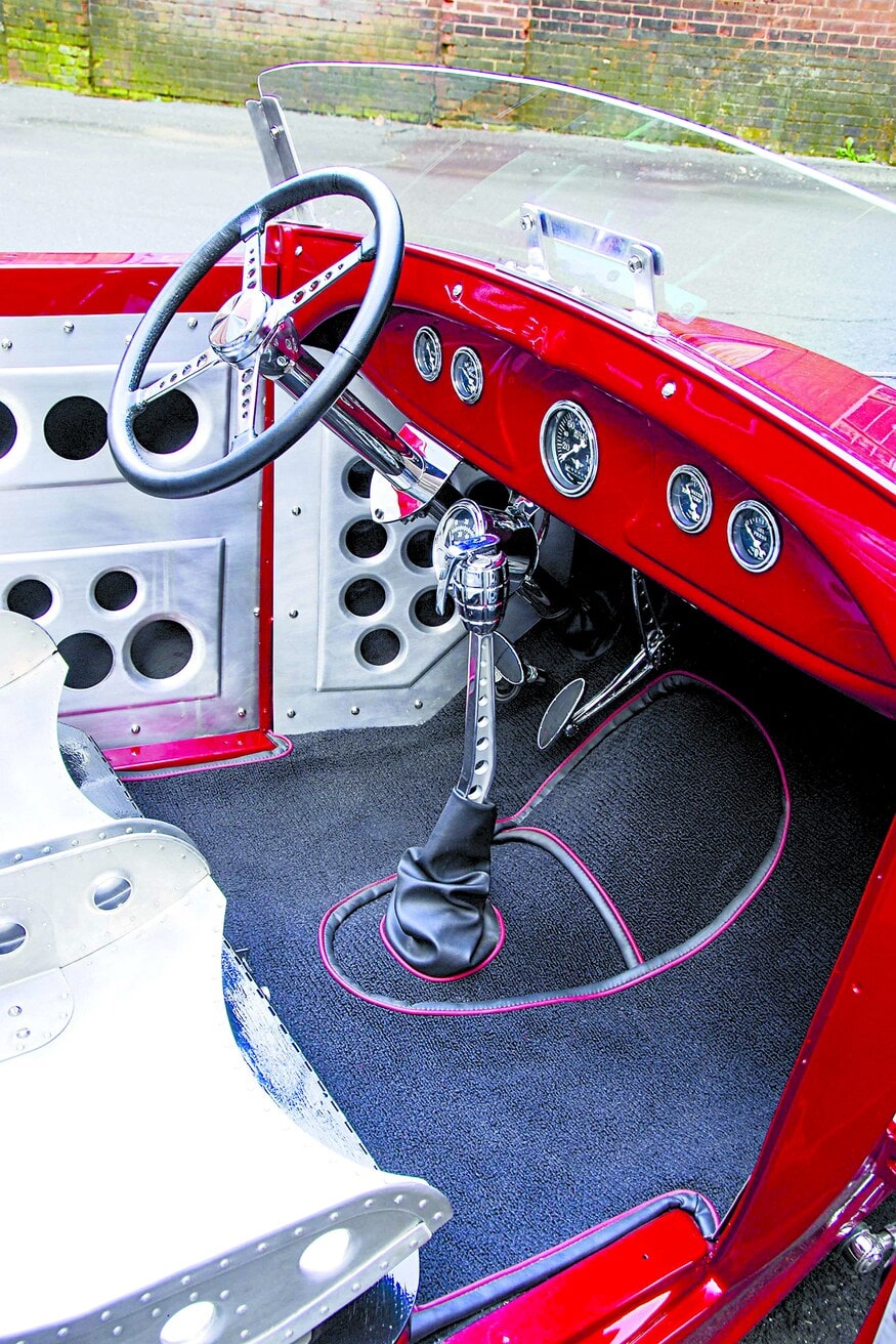 Une fois toute la ferronnerie terminée, Steve a confié son Hot-Rod à Richard Duck Day d’Antrim, dans le New Hampshire, pour qu’il pose une couche lisse de rouge RM métallisé, donnant vie à l’ensemble. Le remontage comprenait un pare-brise unique, des phares Guide et des feux AR Hudson 1951. Pour un nouveau look intérieur, Steve a fabriqué une paire de sièges en aluminium de style bomber. Les moquettes noires à boucles proviennent de Clinton Morton d’Errol, dans le New Hampshire, tandis qu’un kit American Autowire a été installé par Steve. Une colonne LimeWorks, un volant de style Sprint et des cadrans Stewart-Warner ainsi qu’un levier de vitesses Lokar ont complété la réalisation. Voilà… Ensuite il a couru les concentres pour présenter son œuvre, une au milieu de dizaines de milliers d’autres dont tout le monde n’en a rien à branler.