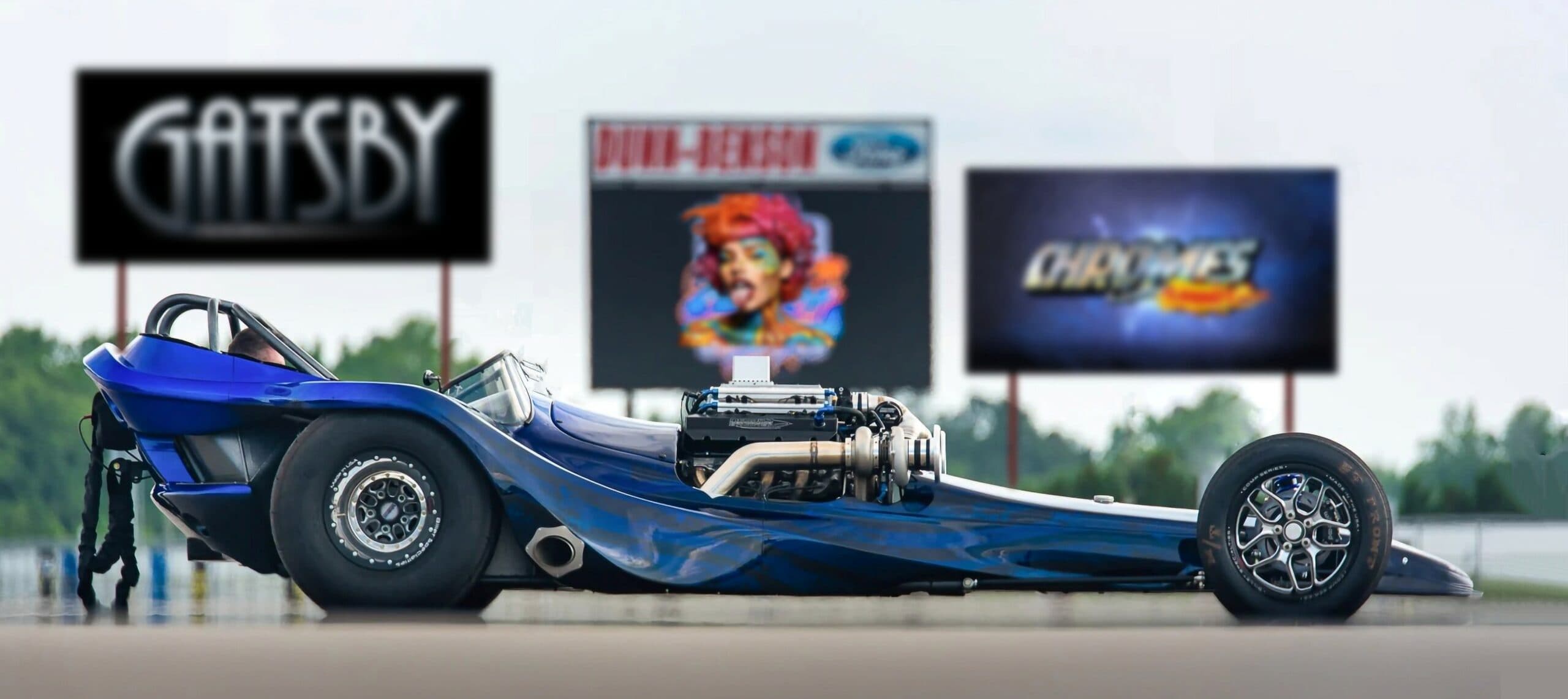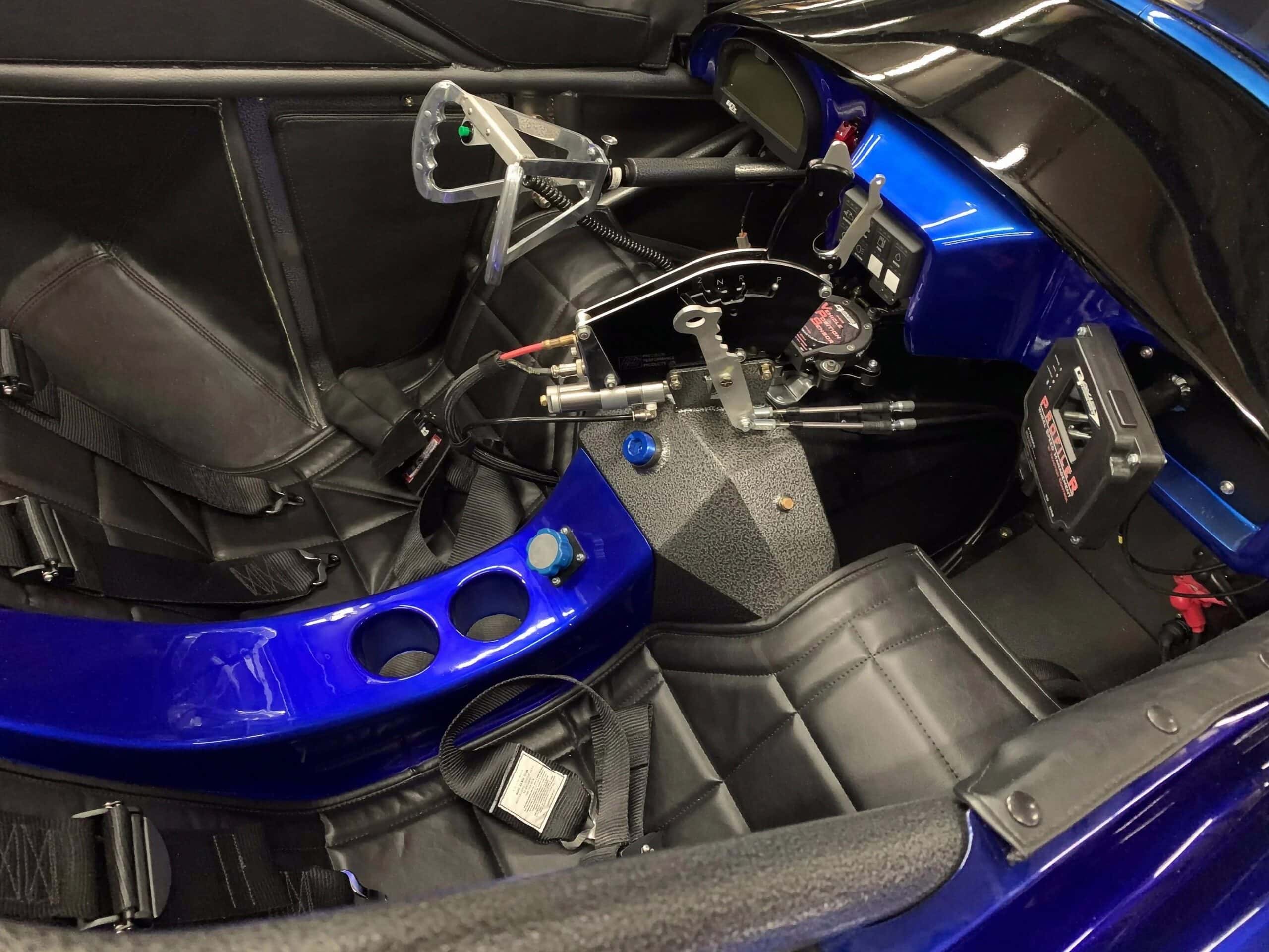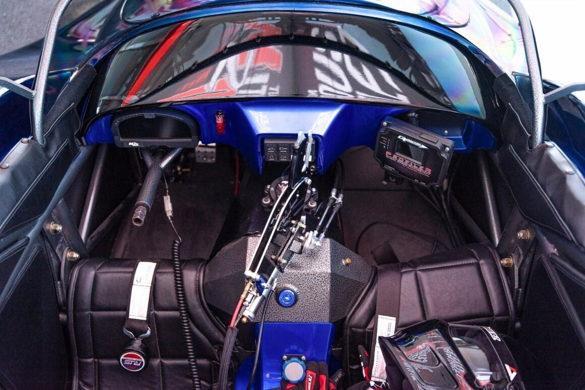 Il y a également un capteur de position du véhicule, ainsi qu’un système de d’injection de nitroglycérine. C’est l’enfer quand ça se déchaine ! “Il ne reste qu’à manieuvrer le levier de vitesses, le contrôle de la suralimentation et en finale les parachutes”... “Kevin Mullins” a règlé ce Hot Drag à l’aide d’un système “Holley EFI Dominator” câblé par “Modern Racing”, qui fournit du carburant via 16 injecteurs “Billet Atomizer” de 550lb-h. Avec un radiateur et 20 gallons de méthanol “Sunoco” à bord, Ankin dit qu’il maintient la température sur la route et qu’il obtient une consommation de carburant à 80L/100kms.