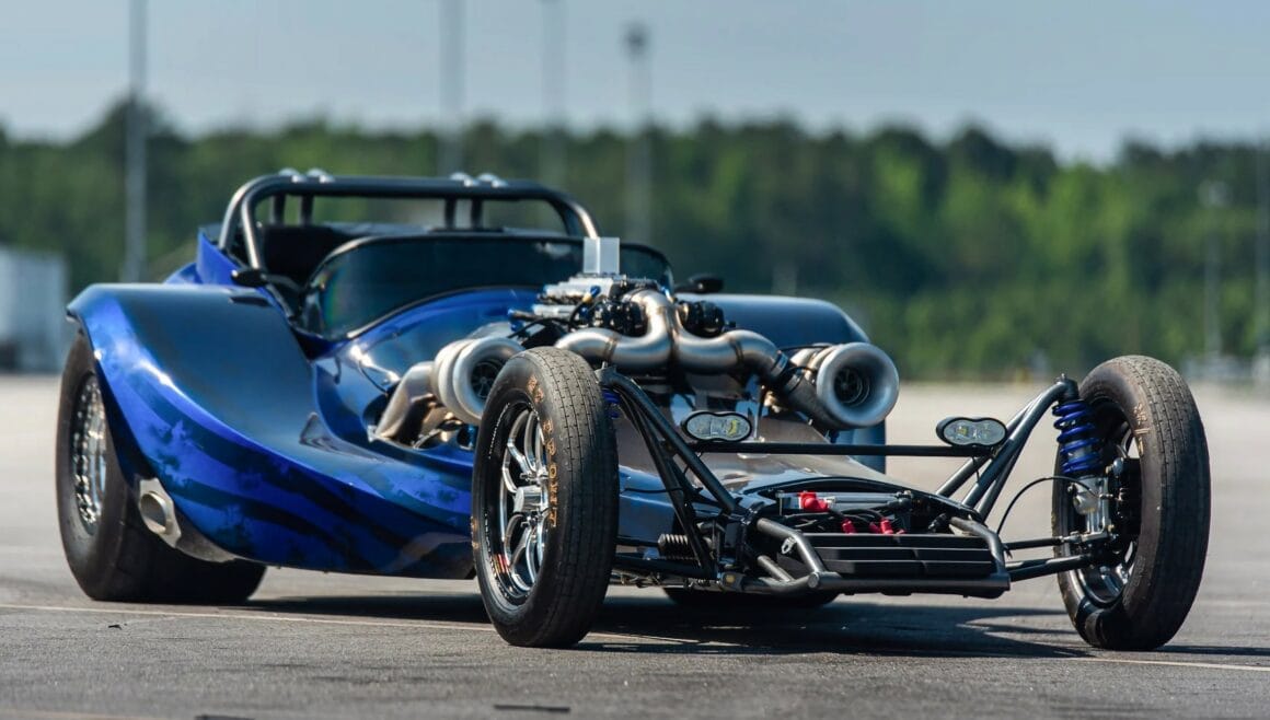 Deux sièges, oui… Mais avec un téléviseur/téléphone, des lumières psychédéliques et tout le confort des Cadillac’s. Et c’est exactement ce qu’il a réalisé… Ankin et son équipe ont construit à la main le châssis et la carrosserie, puis ont fait équipe avec divers experts de l’industrie des courses de dragsters. Son ami Brent Nesbitt a construit le moteur V8 Big-bloc de 540ci arborant une paire de culasses “Brodix” avec des culbuteurs en acier “T&D Machine”. Une rencontre fortuite à une table de blackjack au SEMA Show/Las Vegas avec un représentant de “Precision Turbo” a ensuite abouti à un partenariat fructueux.