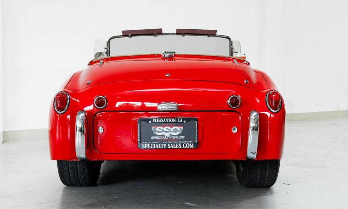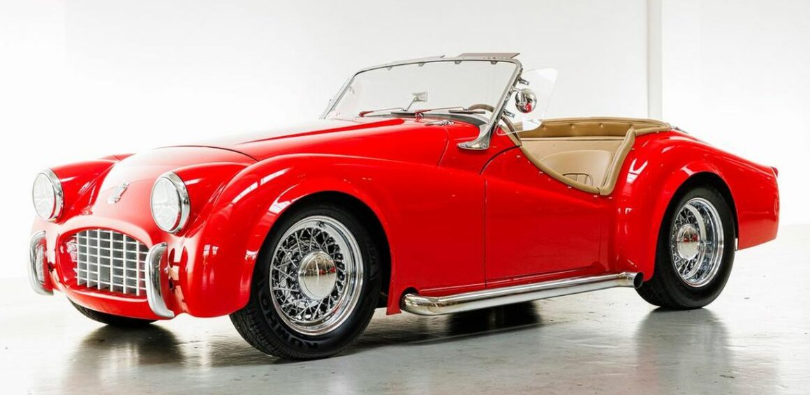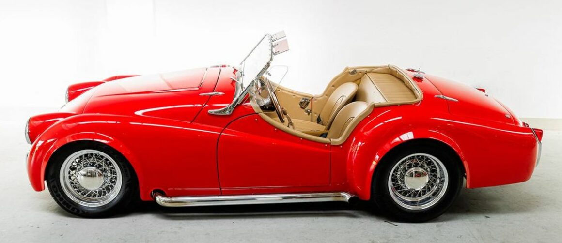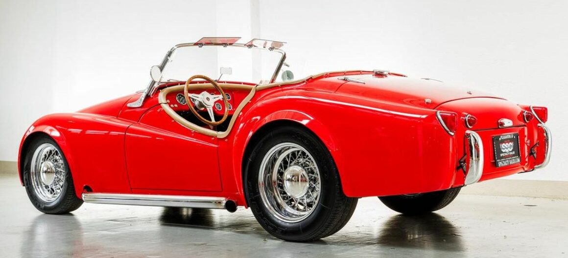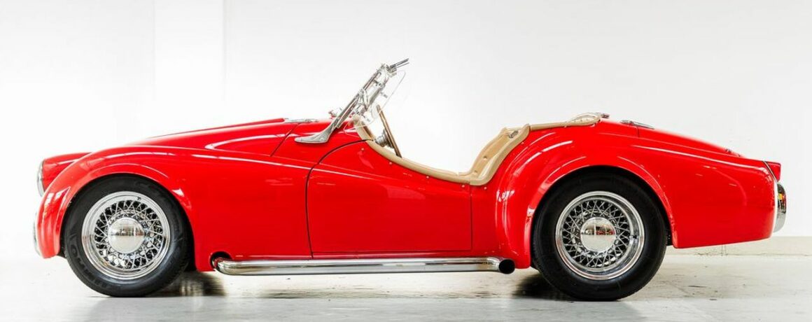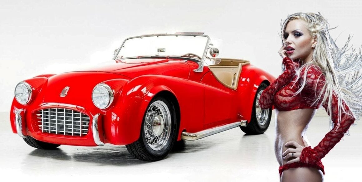 Aujourd’hui, c’est la Triumph TR3 qui va déclencher la haine des irréductibles fanatiques envers ce web-site, de ce qu’elle a été évoluée façon Hot Rod par des iconoclastes. J’ai ajouté une nanana sexy-bandatoire pour maximiser l’effet érectile des mêmes et transgenres inclus incluant l’effet “mouillage” au port d’attache… Comme pour presque toutes les voitures de sport britanniques, la grande majorité des TR3 (environ 85 %) ont été exportées, et la plupart d’entre elles sont allées en Amérique du Nord. C’est le cas de cette Triumph TR3 de 1957 qui exportée du royaume d’Albion (la perfide) et importée sous le soleil californien, à, “oh mon Dieu !”, été comme transmutée/transgendrée de diverses améliorations !