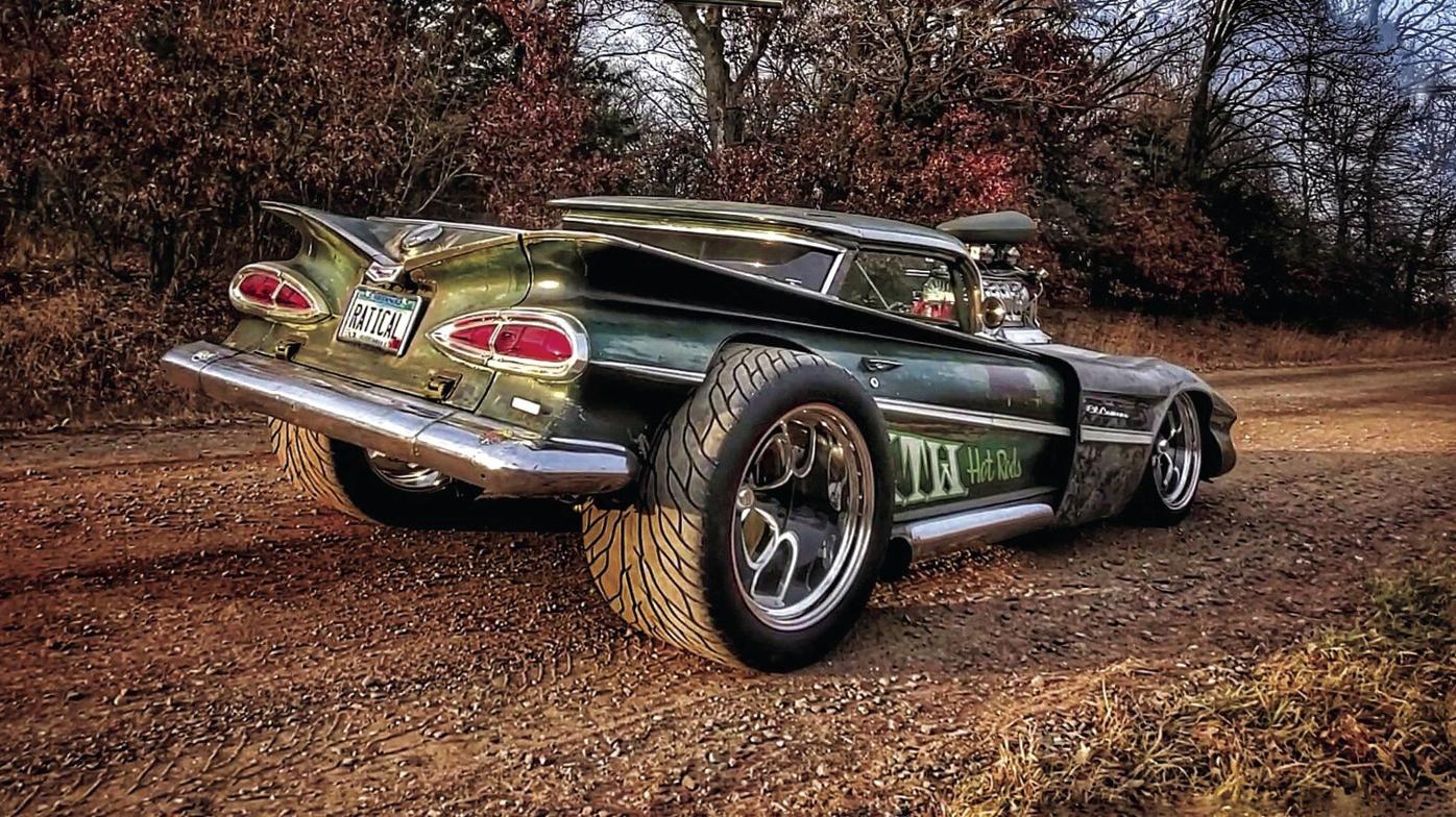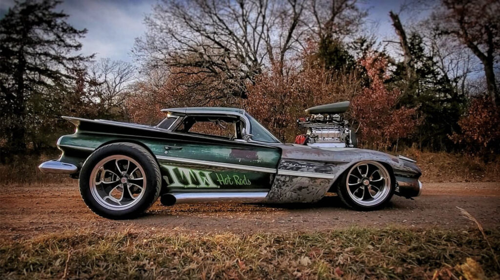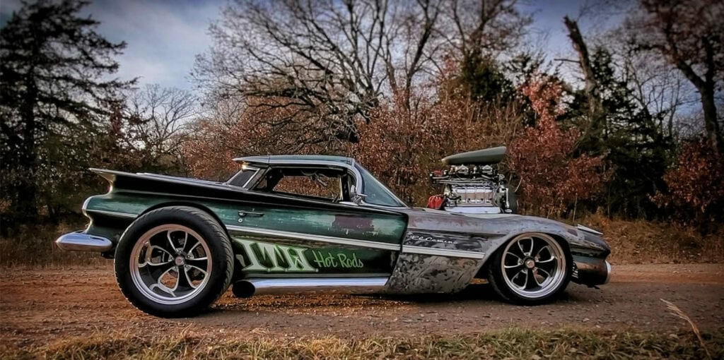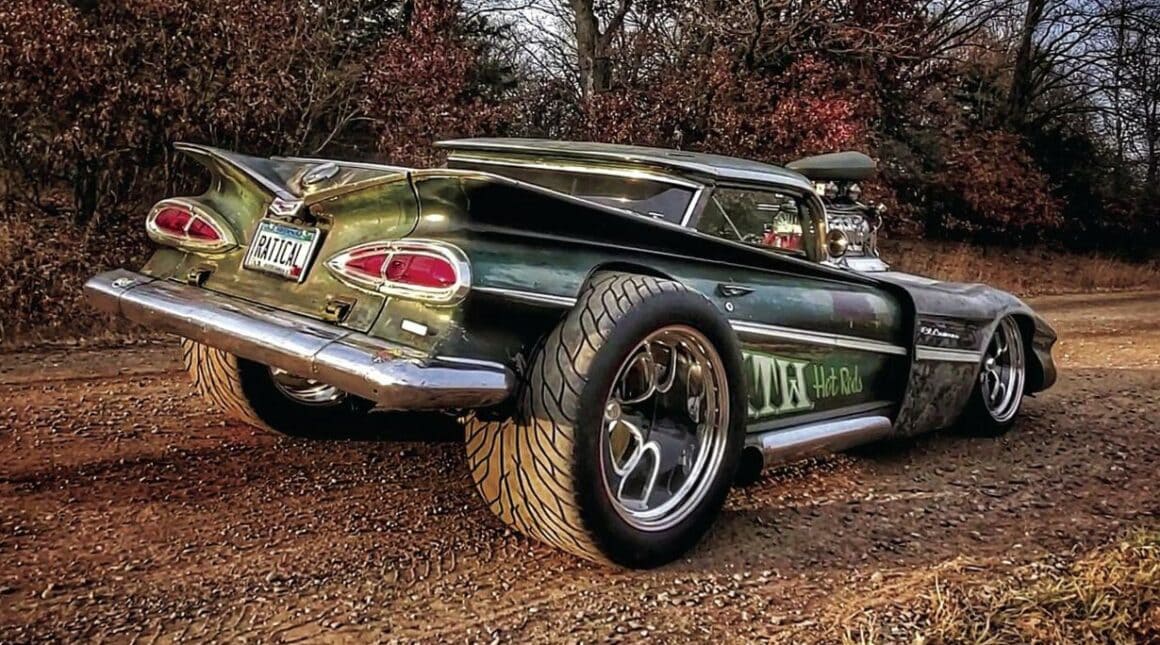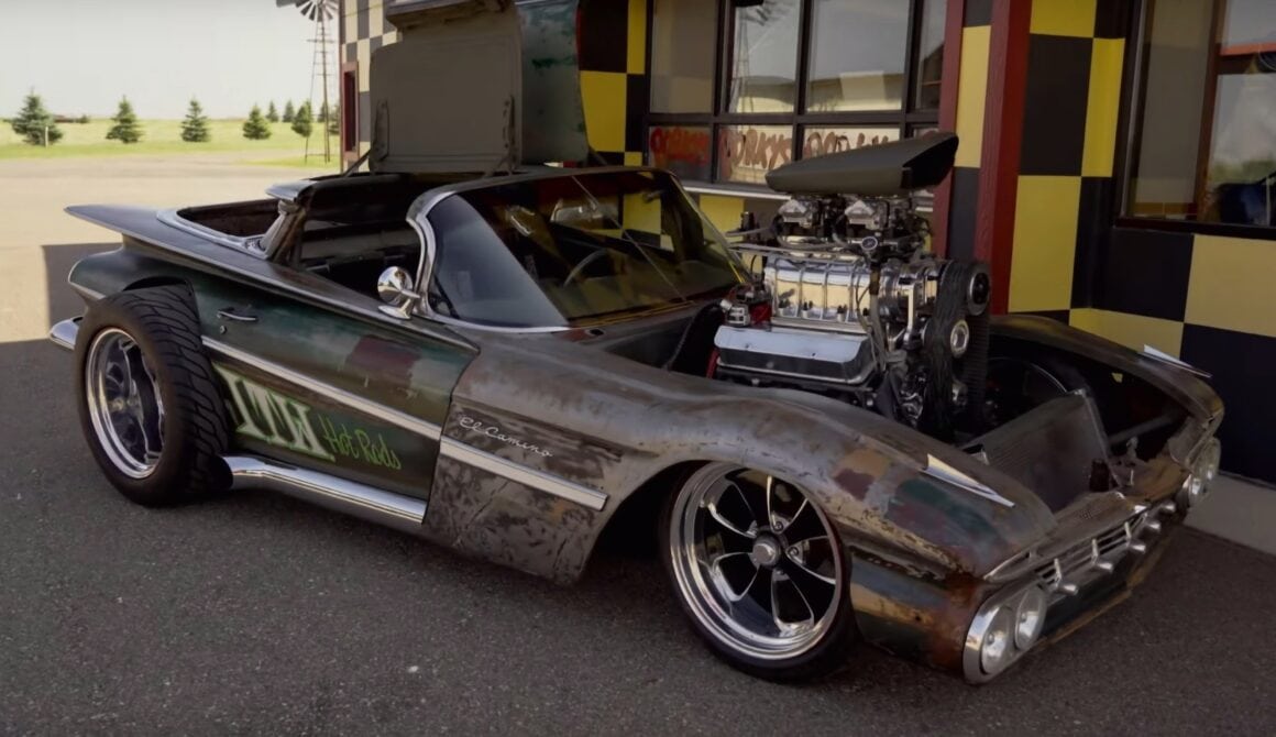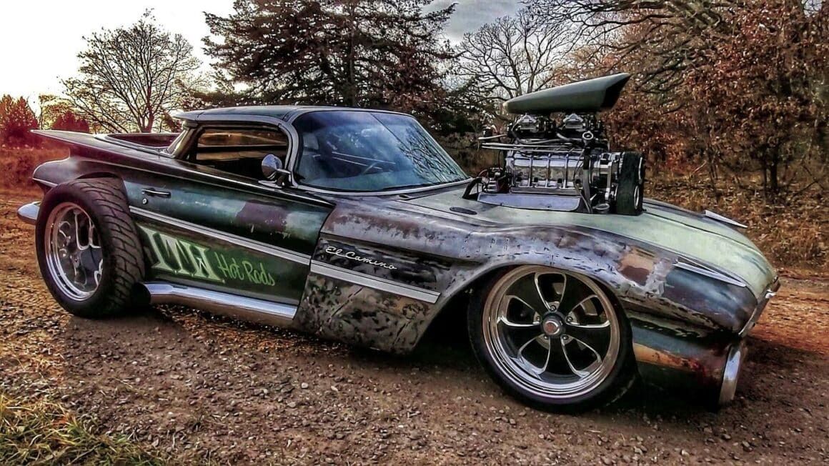 -Bien, il me semble être temps d’en venir à la voiture “illustrante”… Il s’agit de la première génération de la Chevrolet El Camino n’a été produite que pendant deux ans, de 1959 à 1960, lorsque les commandes ont chuté et que sa production a été abandonnée. Cela n’en a peut-être pas l’air, mais cette “Hulk Camino” a l’âme et le corps d’une Chevrolet El Camino de 1959. Le propriétaire actuel l’a trouvé derrière un garage, l’a acheté et a commencé à y travailler dès le lendemain, la transformant en une combinaison entre un Hot Rod, un Rat Rod et une Street Machine… Cette Camino n’est plus la “chose” rouillée de partout qu’elle était initialement. Elle est est équipée d’un moteur V8 Chevy 400ci qui développe 811cv, mais, même ainsi, elle n’atteint qu’une vitesse de pointe de 140 m/ph (225 km/h) car elle pèse pèse 2.300 lb (1.043 kg) et se balance sur des pneus de 31 pouces. La carrosserie a été coupée et modifiée à peu près partout, mais les tôles qui s’y trouvent sont presque toutes celles d’origine, quoique les ailes avant et le capot ont été fortement remodelés.