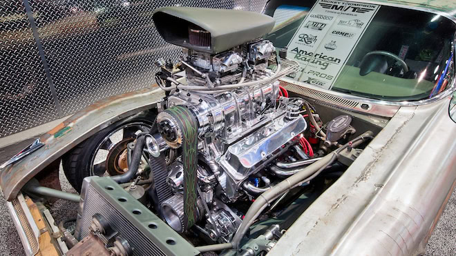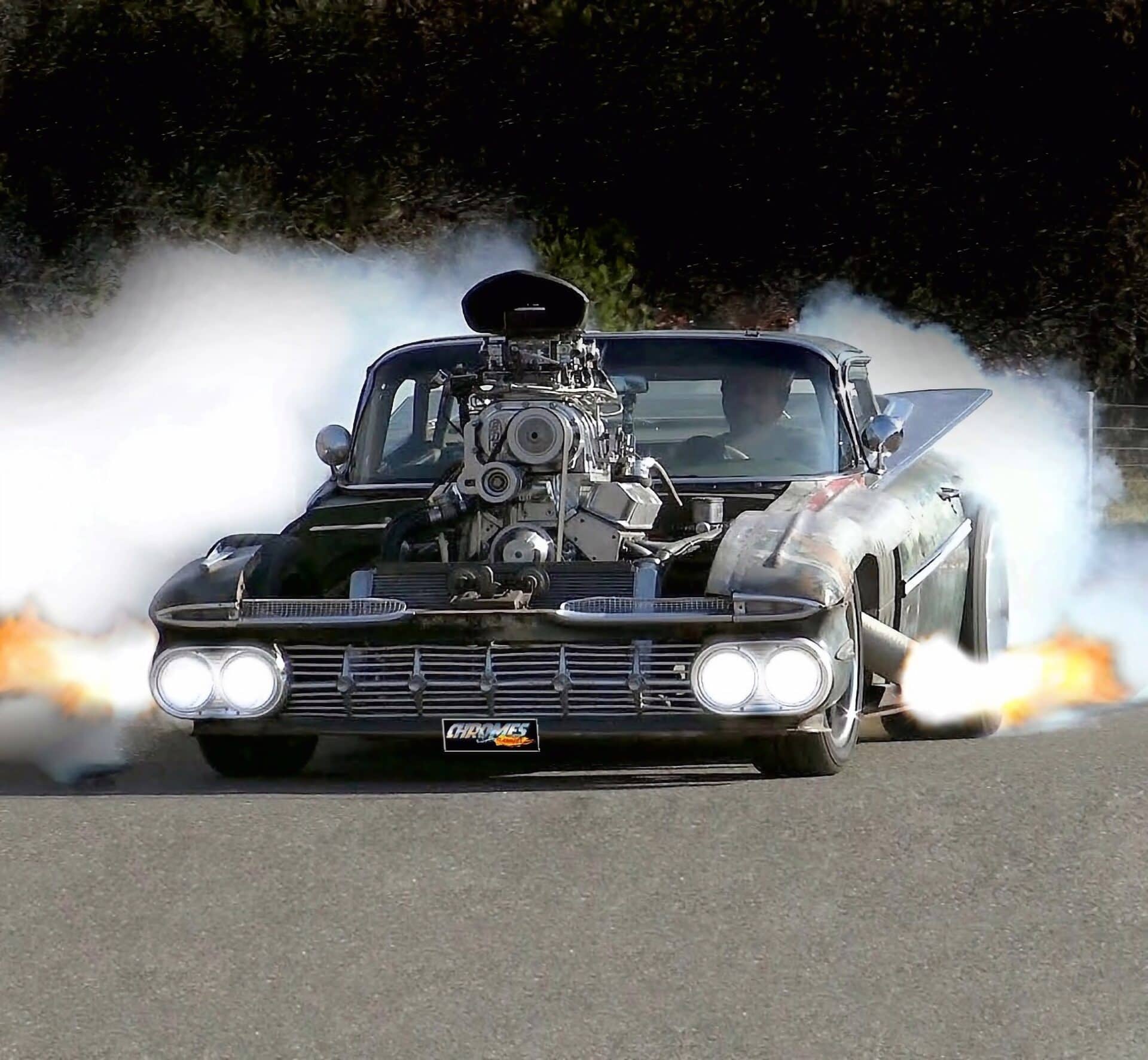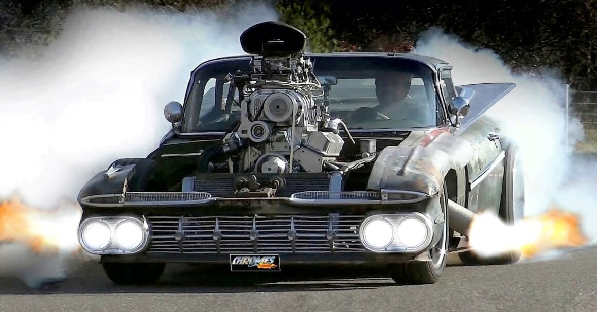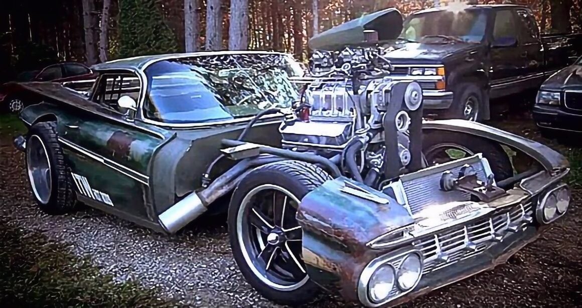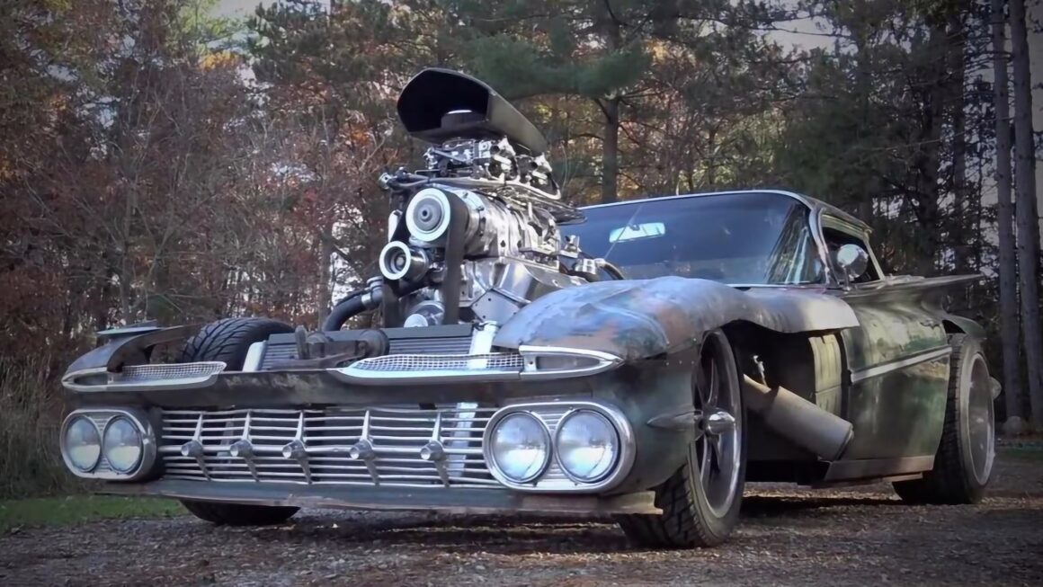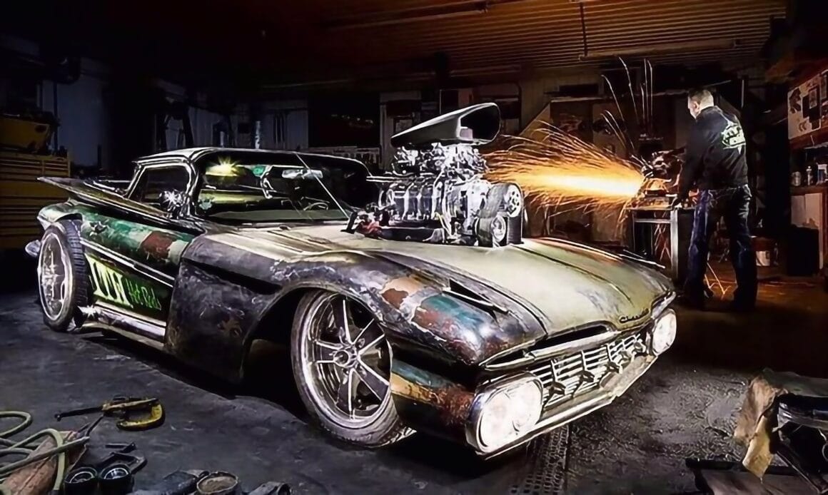 -Bien, il me semble être temps d’en venir à la voiture “illustrante”… Il s’agit de la première génération de la Chevrolet El Camino n’a été produite que pendant deux ans, de 1959 à 1960, lorsque les commandes ont chuté et que sa production a été abandonnée. Cela n’en a peut-être pas l’air, mais cette “Hulk Camino” a l’âme et le corps d’une Chevrolet El Camino de 1959. Le propriétaire actuel l’a trouvé derrière un garage, l’a acheté et a commencé à y travailler dès le lendemain, la transformant en une combinaison entre un Hot Rod, un Rat Rod et une Street Machine… Cette Camino n’est plus la “chose” rouillée de partout qu’elle était initialement. Elle est est équipée d’un moteur V8 Chevy 400ci qui développe 811cv, mais, même ainsi, elle n’atteint qu’une vitesse de pointe de 140 m/ph (225 km/h) car elle pèse pèse 2.300 lb (1.043 kg) et se balance sur des pneus de 31 pouces. La carrosserie a été coupée et modifiée à peu près partout, mais les tôles qui s’y trouvent sont presque toutes celles d’origine, quoique les ailes avant et le capot ont été fortement remodelés.