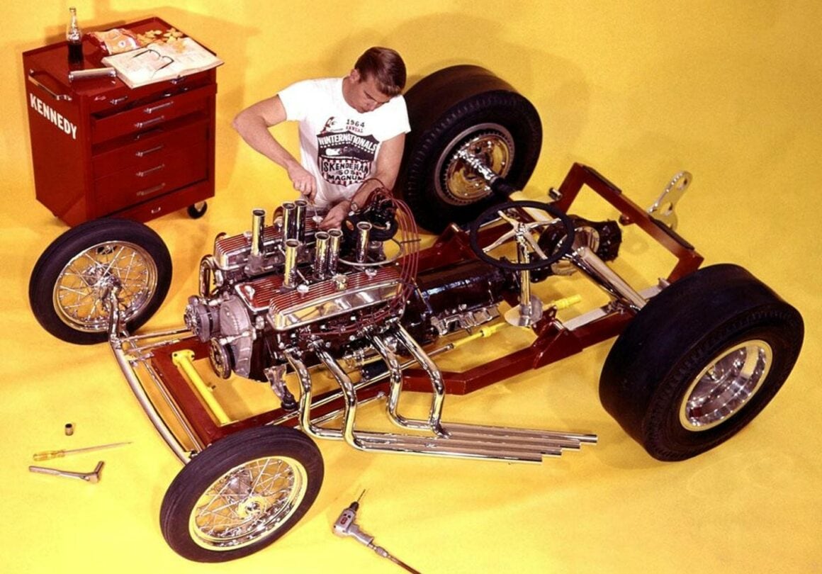 Dans les années 1960, les salons de l’automobile étaient des temples du consumérisme, ce qui révélait particulièrement un gros problème aux États-Unis : Toutes sortes d’intérêts corporatifs s’y impliquaient, y compris des sociétés de jouets et de maquettes miniatures. En nos jours, les enfants ont des ordinateurs pour se divertir, dans les années d’avant (’50,’60,’70) les maquettes plastique à construire étaient une industrie massive et florissante vivant de ce “divertissement” poussant la jeunesse lobotomisée à collectionner des inutilités contribuant à faire fonctionner le business. Leurs patrons ont glosé sur le fait qu’après avoir collectionné les maquettes des bombardiers américains B-17 et B-29 suivis de tous les avions, tanks, camions, bateaux, sous-marins, les enfants adoraient les Hot-Rods et Kustoms exposés dans les salons… Ils ont commencé à construire des kits à monter et coller de Hot-Rods et Kustoms ayant remporté des premiers prix dans des expositions.