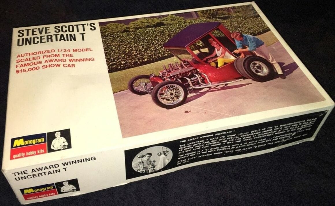 Le jeune Steve Scott en avait eu une illumination, si ce projet pouvait devenir réel, cela lui permettrait d’obtenir la glorification de son œuvre : une couverture et 8 pages dans Hot-Rod Magazine, des premiers prix dans des shows et des maquettes plastiques à des millions d’exemplaires, le tout devant sans nul doute (rêvait-il) lui assurer des profits gigantesques lui assurant une vie de milliardaire ! En bon américain il a donc “piqué/emprunté” le crayonné de son “camarade” et s’est mis à le construire “pour de vrai”… Cinq ans plus tard, l’engin enfin terminé, il a commencé à exposer son “joujou” dans divers show de Kustoms et Hot-Rods dans tout le pays convaincu qu’il allait faire fortune. L’engin surnommé étrangement “Uncertain’T” (une prémonition) devenant une attraction, a été présenté dans plusieurs magazines américains : Hot-Rod, Car Craft, Popular Hot Rodding, et même au bout de l’envers du monde, dans Australian-Hot-Rodding Review. Avec l’appui de ces couvertures médiatiques en 1966, son Hot-Rod “Uncertain’T” a été commercialisé en Kit-plastique à monter/coller échelle 1:24, par Monogram.