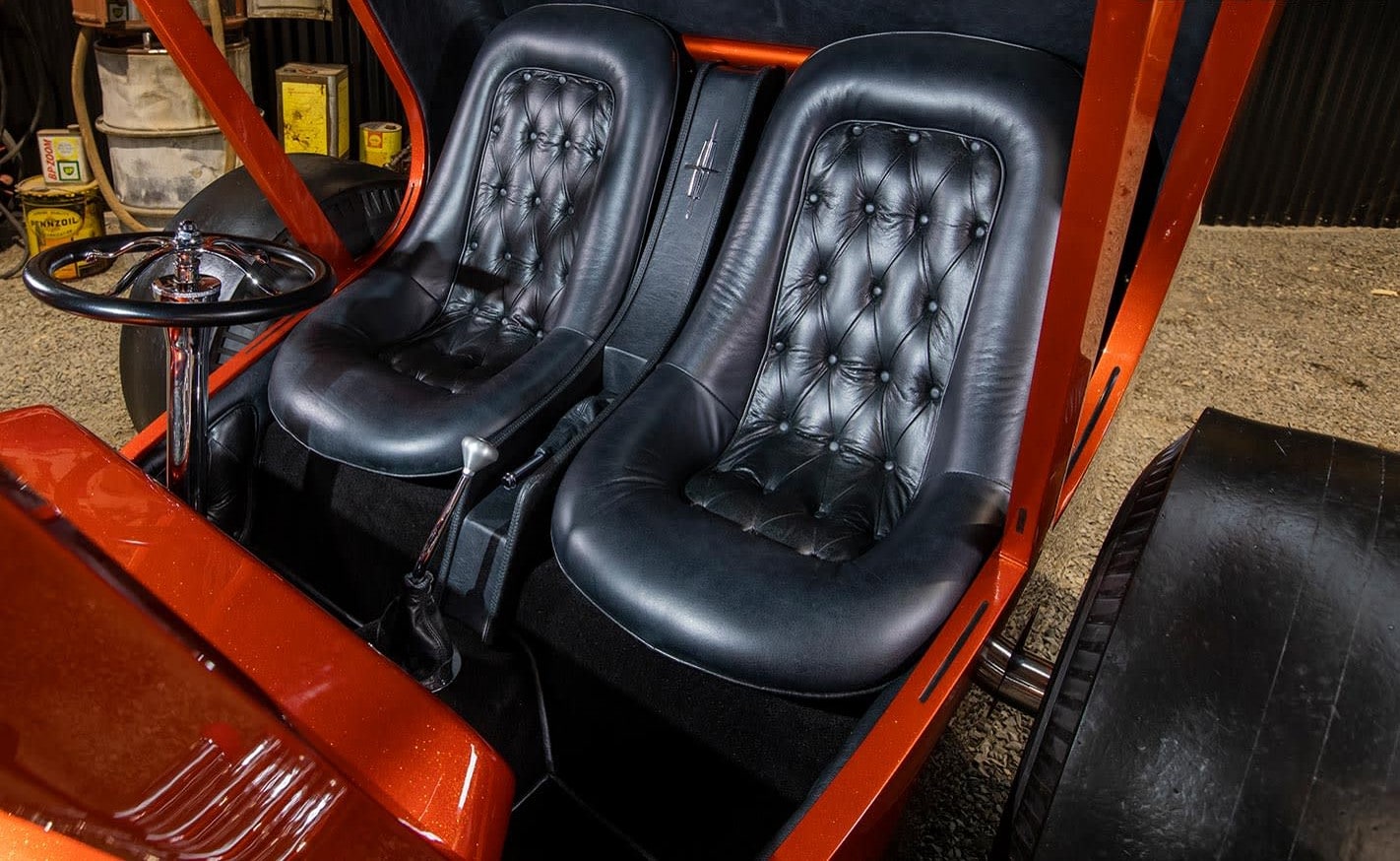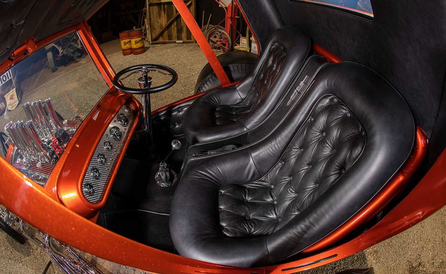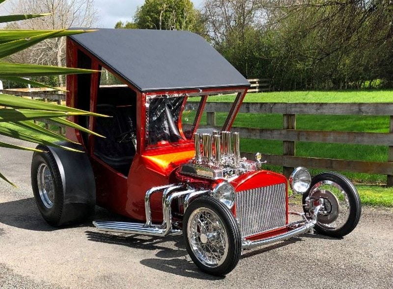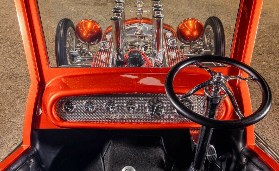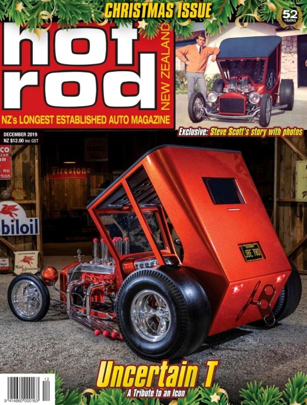 -Mon objectif était de reconstruire l’Uncertain’T comme l’original mais certaines pièces ont dû être reconçues différemment pour qu’il soit en agrément des normes de roulage en Nouvelle-Zélande. La tâche consistait à faire de l’ingénierie inverse d’une voiture pleine grandeur à partir d’un modèle à l’échelle 1:24 et des articles des magazines de l’époque. Après quelques mois j’avais tout l’utile et le nécessaire pour entamer la construction. La première tâche fut de refabriquer la carrosserie bizarrement inclinée vers l’avant du modèle’T ! C’était LE grand élément caractéristique excessivement basique et même tellement simplissime que j’en suis venu à me demander comment et pourquoi ce Hot-Rod avait été plusieurs fois sacré de quantités de coupes, trophées, articles et pots de fleurs ! C’est Clive Plumtree, qui m’a réalisé ce job en utilisant différentes techniques de construction de bateaux. Ma motobineuse modèle’T repose sur un châssis’T chromé avec un réglage qui permet de positionner la carrosserie en mode incliné pour les shows et spectacles et en mode “vertical” qui est le seul légal pour la conduite. Lorsque j’ai adapté le châssis avec son raccourcissement ce fut fait “au sol”, fait “à plat” parce que c’est ce à quoi il ressemblait. Ensuite, j’ai recréé le “coup de pied” de trois degrés au niveau de la cloison pare-feu, positionné la carrosserie et c’était parfait. Simple, facile et rapide. Pour le look du moteur de qui se souviendrait encore de cet “Uncertain’T” avant sa disparition d’il y a 50 ans, j’ai opté pour un V8 basique. Les jantes arrière sont des “ET” en 12×16 pouces, elles ont été fabriquées sur mesure par la firme “Radir” et j’ai demandé d’ajouter deux pouces pour utiliser des slicks de dragsters “en croûte de tarte” adaptés. Cela amenait à un meilleur look que sur cet “Uncertain’T” d’origine. Les compteurs Stewart Warner ont été refabriquées à l’identique de “Uncertain’T”. Ce qui a rendu tout cela plus où moins difficile, c’est que ma construction a été gardée secrète pendant sept ans afin d’assurer un impact maximal au salon SEMA 2019 aux USA. J’avais obtenu un super paquet de dollars pour leur laisser l’exclusivité. Ca à marché, tout le monde du Hot-Rodding a cru que c’était le “Uncertain’T” original restauré par un gars de Nouvelle-Zélande. Personne n’a même remarqué que la conduite étair RHD plutôt que LHD”.