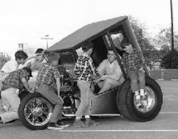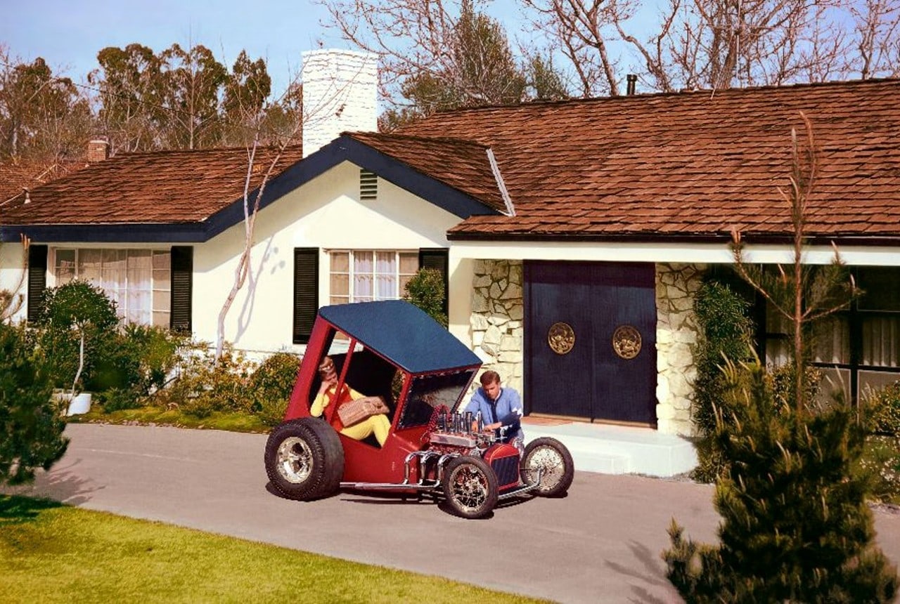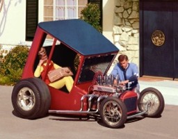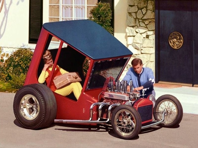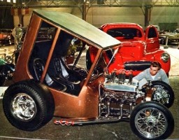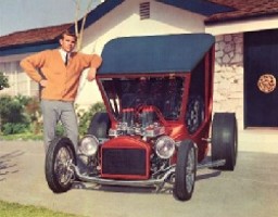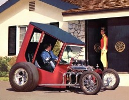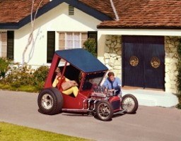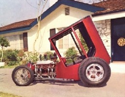 De l’engouement obtenu, l’idée leur est venue de payer la réalisation d’engins de plus en plus dingues et impossibles à utiliser. La presse “spécialisée” en loisirs, section automobiles, étendue aux Hot-Rods et Kustoms s’est compromise avec cette idée de créer des bizarreries loufoques classifiées Hot-Rods. Le business y gagnait gros, dans le but d’avoir des pages et une couverture dans les magazines et reprises en maquette à monter/coller… Tous des opportunistes qui glandaient à personnaliser des autos de stars d’Hollywood sont devenus des constructeurs d’escroqueries. C’était à qui imaginerait le Hot-Rod le plus dingue. Même les grands constructeurs s’y sont mis. Tout cela formait une masse de sujets d’articles-presse, d’engins d’exposition et de maquettes à monter-Coller. Avoir sa voiture sur la couverture d’un magazine était une chose, mais avoir un modèle réduit, une maquette à monter/coller qui serait vendue à des centaines de milliers d’enfants, était d’un niveau encore supérieur…