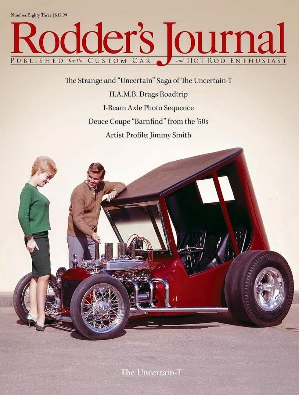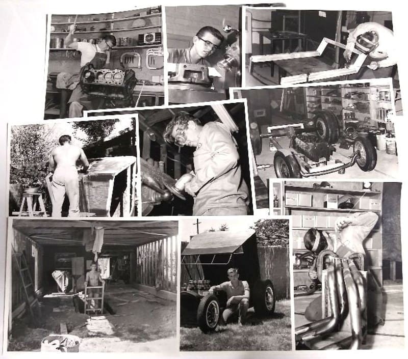 -Vers le 15 mars 1960, quand j’avais 17 ans, un camarade de classe dans mon cours de physique avancée à dessiné un Hot-Rod sauvage avec une cabine/carrosserie inclinée vers l’avant basée sur celle d’un modèle’T. Quand il l’a montré à quelques-uns, l’un d’entre-eux a dit quelque chose comme: “Wow! Quel Hot-Rod sauvage ! C’est dommage qu’on ne peut pas construire quelque chose comme ça”. J’ai su immédiatement que je devais le construire. Après tout j’étais étudiant en physique avancée ! Je suis rentré directement à la maison familiale après l’école avec ma vision du Hot-Rod que le dessin m’avait inspiré et j’ai commencé à mesurer et dessiner ce Rod à l’échelle sur une cloison du petit garage étroit mais détaché, de notre maison située à Reseda en Californie. Je n’ai pas essayé de rendre mon projet exactement comme le dessin parce que certaines éléments étaient trop caricaturaux, mais l’inspiration était là et j’ai visualisé à quoi cela devrait ressembler à ce moment-là. Chaque jour ma mère me disait que je ferais mieux de m’impliquer dans mes études. Je savais que je pouvais le construire ! J’étais tellement excité et aussi effrayé en même temps parce que je savais d’avance qu’il faudrait que j’invente et que je crée quantités d’éléments inexistants pour y arriver ! Malgré tout, j’étais déterminé… Non… Je me sentais “destinée” à construire ma vision ! Beaucoup plus qu’on pourrait l’imaginer est allé dans la conception de mon “The Uncertain-T”. La plupart des gens ne le réalisent pas. Je ne voulais absolument pas simplement assembler des pièces comme actuellement ‘copié-collé’ sur un ordinateur qui dans les années ’60 n’existait pas. C’est une point qui me dérangeait dans la plupart des Hot-Rods. Même s’ils avaient l’air si beaux, ils avaient tous des points de détail qui ne me semblaient tout simplement pas adéquats. Parfois les éléments ne semblaient tout simplement pas s’emboîter. J’ai donc passé beaucoup de temps à mesurer des pièces réelles et à les dessiner à la taille exacte sur les cloisons du petit garage familial. L’une de mes principales priorités lors de la conception et de la construction de l’Uncertain’T était de garder son look tout aussi propre et minimal que possible. Je devais avoir toutes les pièces avant de pouvoir commencer à construire mon Hot-Rod. Ce devait être une œuvre d’art, une sculpture ! Tout devait “travailler ensemble”… Tout devait être “équilibré” en taille, forme, position, couleur, etc. J’avais besoin avant tout de fabriquer mon châssis afin de décider de toutes les mesures et angles de la carrosserie… Je n’aimais devoir utiliser des éléments de direction encombrants et une colonne de direction épaisse… même chromé et brillant… Ils m’ont toujours semblés “faux”. Même chromés, je ne voulais pas d’une barre de direction longue et épaisse, j’allais devoir inventer et fabriquer des éléments simples et propres. Étant un vrai Hot-Rodder de la vallée de San Fernando à cette époque, je n’étais pas étranger à tous les nombreux “chantiers de ferrailles” empilés avec des carcasses de toutes les marques et années imaginables de voiture. Cela m’a pris un certain temps et beaucoup, beaucoup d’heures pour regarder dans et sous chaque type de voiture dans les décharges… Jusqu’au jour où j’ai découvert la direction à pignon et crémaillère adéquate ! Je n’avais pas du tout regardé les voitures étrangères, parce que bien sûr à cette époque les Hot-Rods étaient principalement des Ford et parce que les Hot-Rodders étaient des vrais patriotes Américains avec le drapeau qu’on hisse chaque matin dans le jardin en fredonnant l’hymne de notre nation. J’étais très excité quand j’ai recréé mon premier mécanisme de direction à pignon et crémaillère ! Il était simple et direct. Malgré tout, ce n’était que le début. Je voulais que mon Uncertain’T soit motorisé d’un V8 Buick afin de se distinguer des Ford’s. Pour de nombreuses raisons de conception, je voulais absolument que le moteur soit positionné aussi bas que possible, ce qui signifiait trouver une transmission et un pont arrière qui disposaient de l’emplacement d’entrainement en bas au lieu d’être situé au milieu ou en haut. La solution parfaite pour la transmission était une boite “Hydramatic”, une excellente solution car elle éliminait le besoin d’une pédale d’embrayage et de pièces de liaison ! C’était une “évidence” qu’il me fallait utiliser un pont Halibrand Quick Change en magnésium qui l’entrée d’arbre en bas, permettant la ligne d’entraînement la plus basse possible. Tout ce que j’avais à faire était de gagner beaucoup d’argent pour en acheter un ! Le reste à suivi !