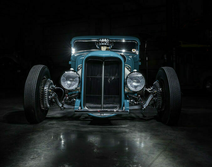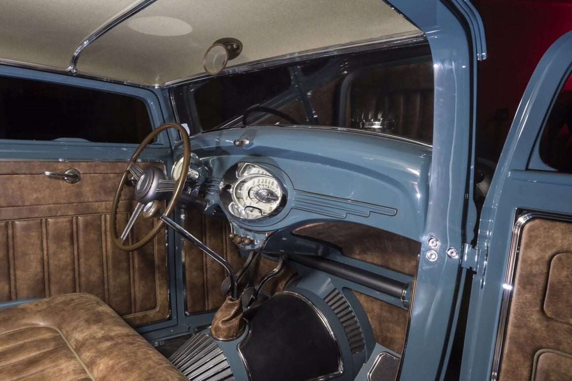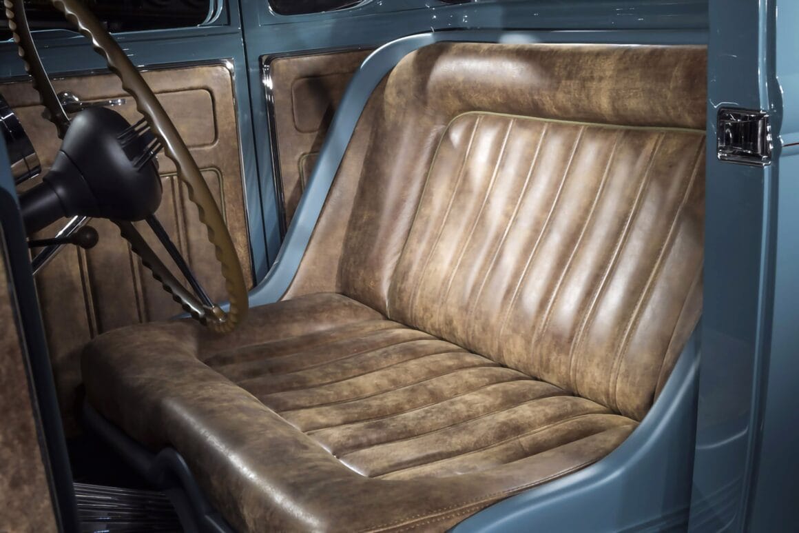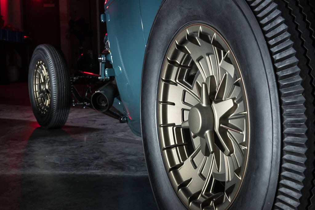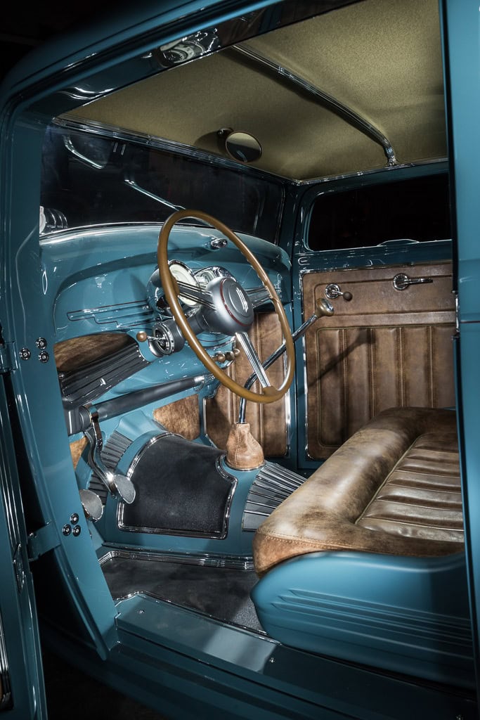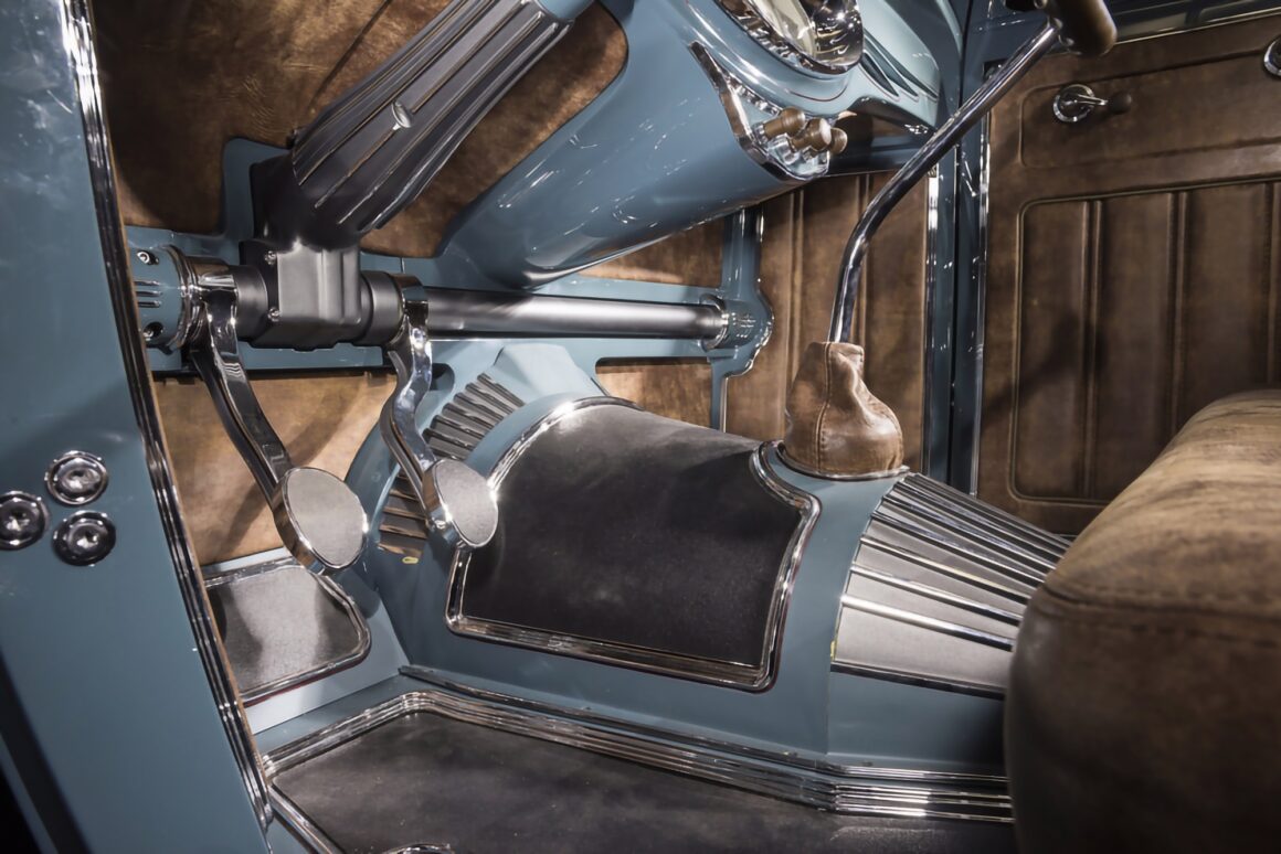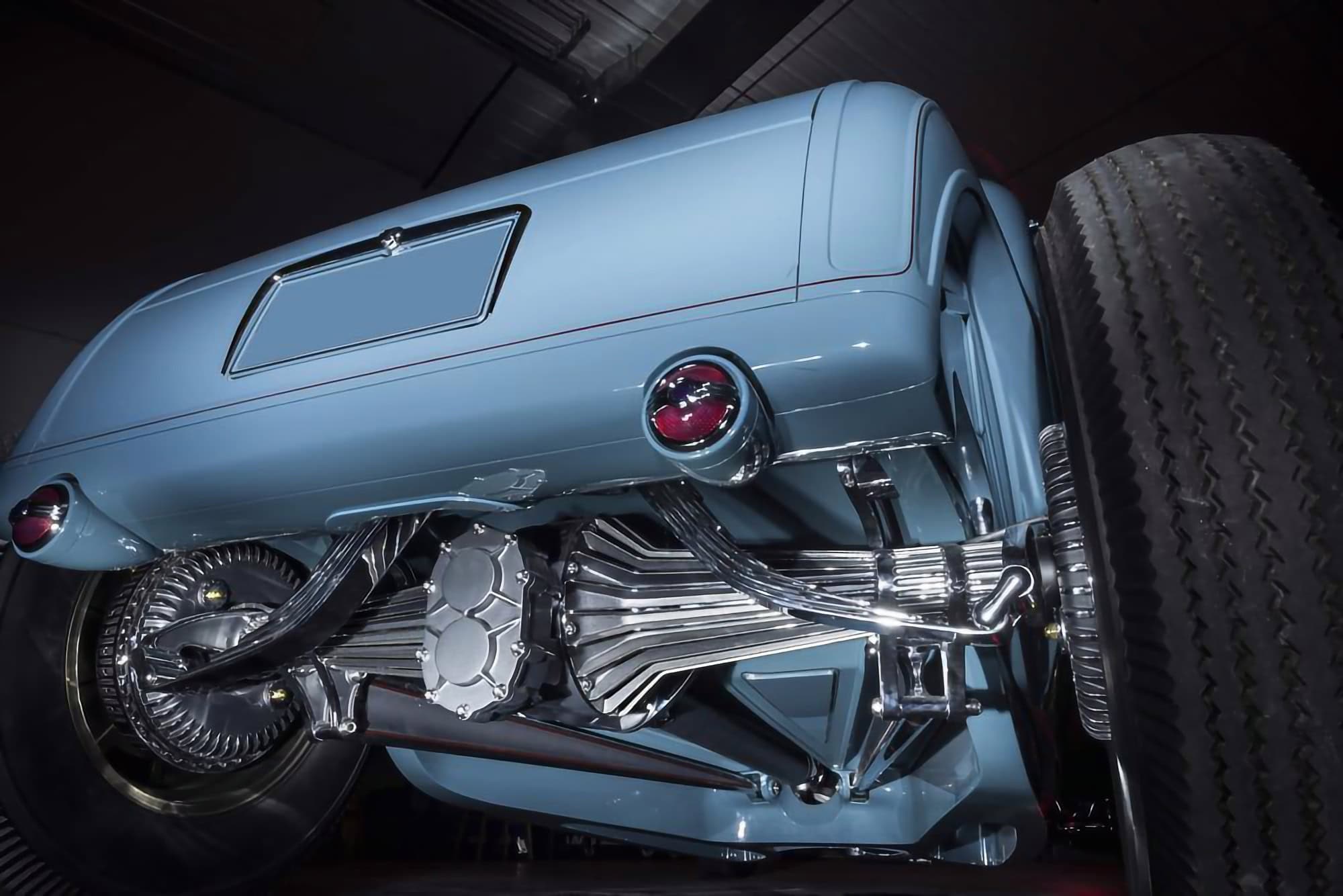 Le moteur Olds V8 284ci est un Flathead tout en aluminium équipé d’un Blower 4-71. La carrosserie a été entièrement remaniée, à un niveau de détail incroyable, pratiquement chaque pièce étant fabriquée à la main, des portes au capot. Un toit à cinq fenêtres de 1932 a été adapté à la voiture et la carrosserie a été inversée pour donner au modèle A de 1930 les proportions d’un modèle de 1932. L’arrière de la voiture a été relevé pour lui donner une position style dessin animé. Chaque panneau de carrosserie de la voiture a été modifié pour créer une forme incroyablement unique, avec une belle finition Seafoam Green appliquée par les mains du maître peintre Charley Hutton dans son studio. Le train de roulement présente une quantité aveuglante de composants chromés et présente une quincaillerie d’inspiration art-déco.