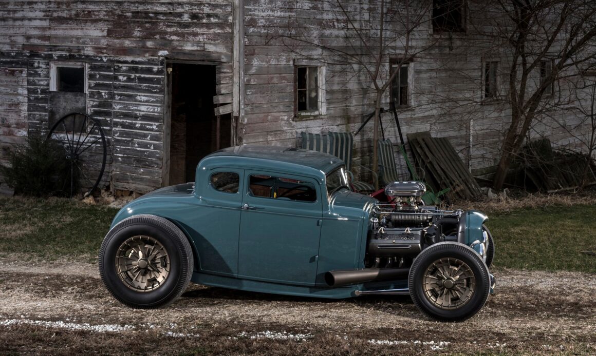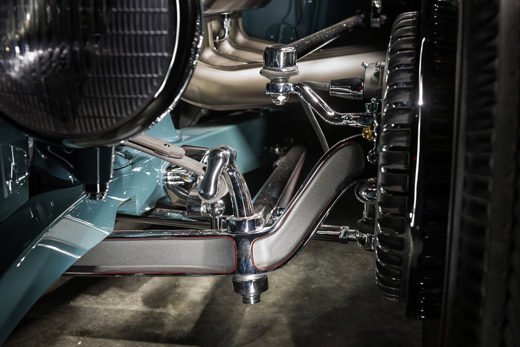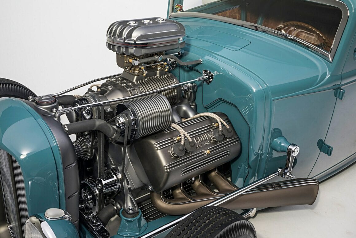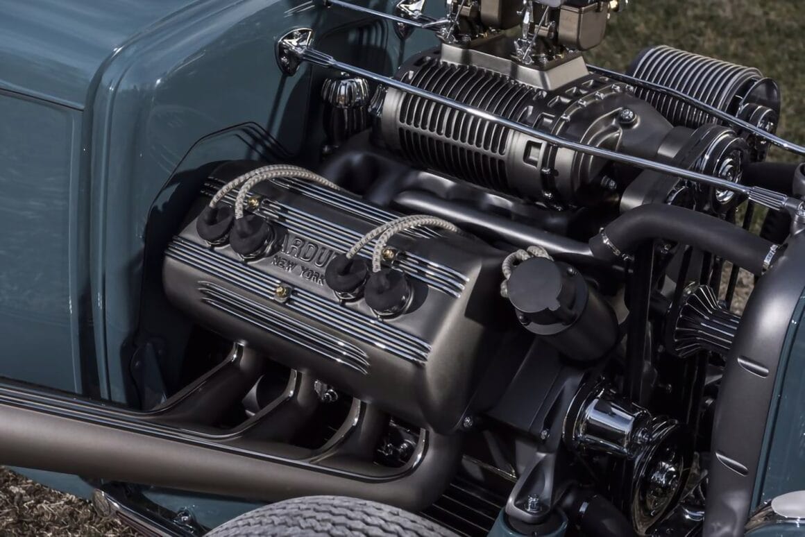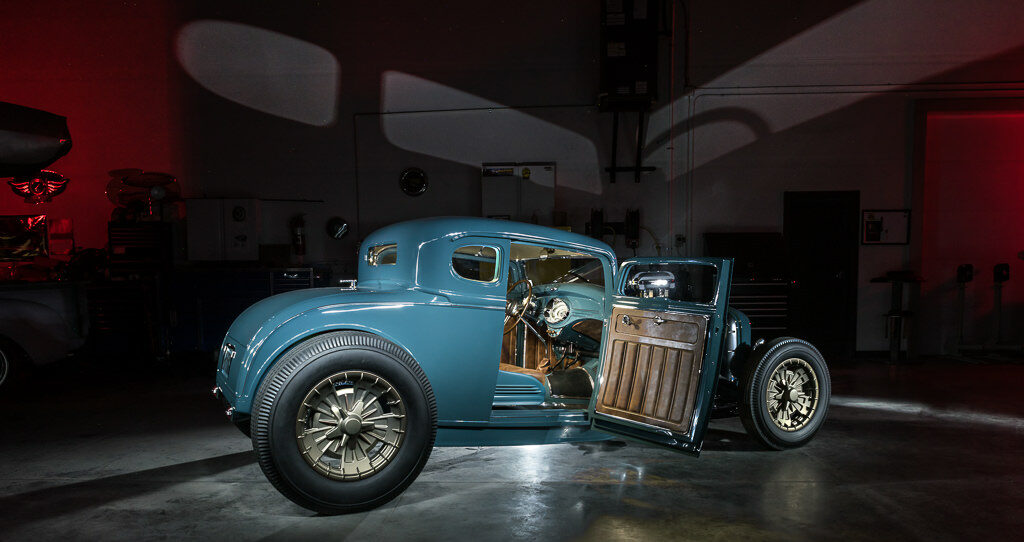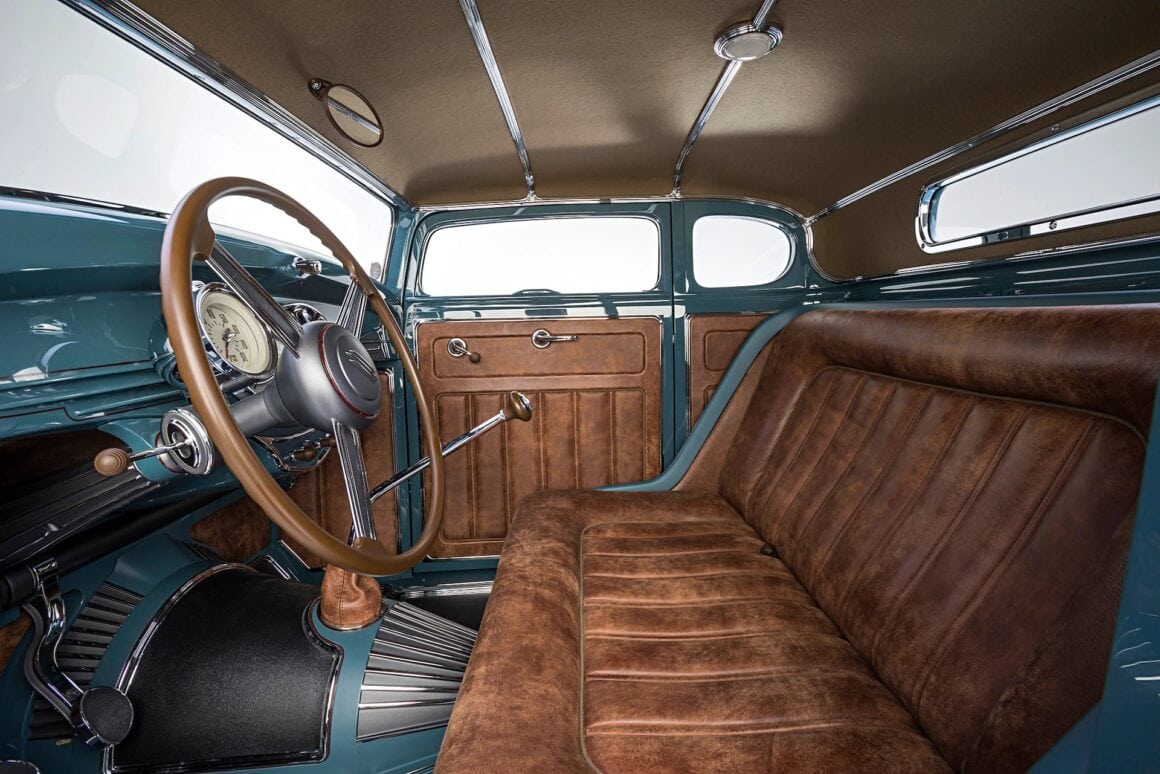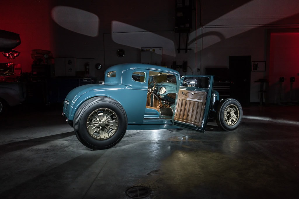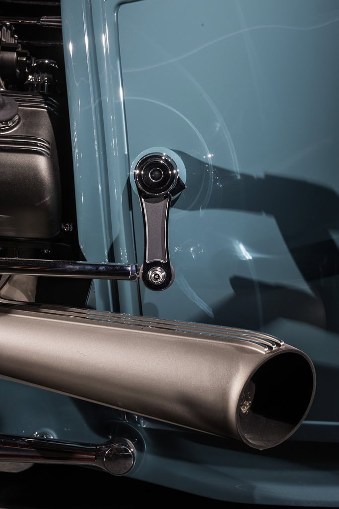 Le moteur Olds V8 284ci est un Flathead tout en aluminium équipé d’un Blower 4-71. La carrosserie a été entièrement remaniée, à un niveau de détail incroyable, pratiquement chaque pièce étant fabriquée à la main, des portes au capot. Un toit à cinq fenêtres de 1932 a été adapté à la voiture et la carrosserie a été inversée pour donner au modèle A de 1930 les proportions d’un modèle de 1932. L’arrière de la voiture a été relevé pour lui donner une position style dessin animé. Chaque panneau de carrosserie de la voiture a été modifié pour créer une forme incroyablement unique, avec une belle finition Seafoam Green appliquée par les mains du maître peintre Charley Hutton dans son studio. Le train de roulement présente une quantité aveuglante de composants chromés et présente une quincaillerie d’inspiration art-déco.