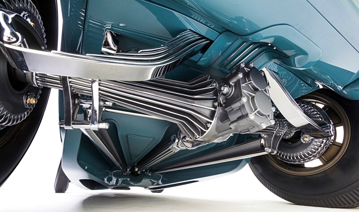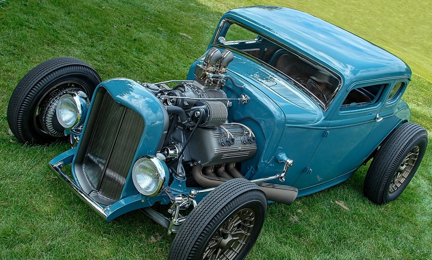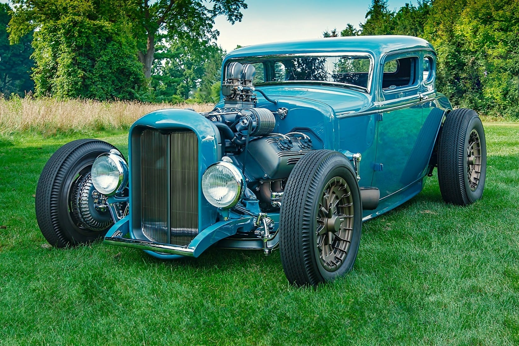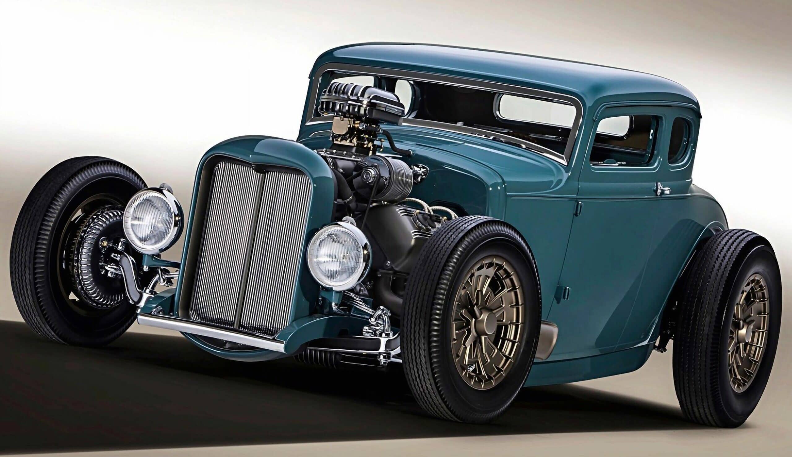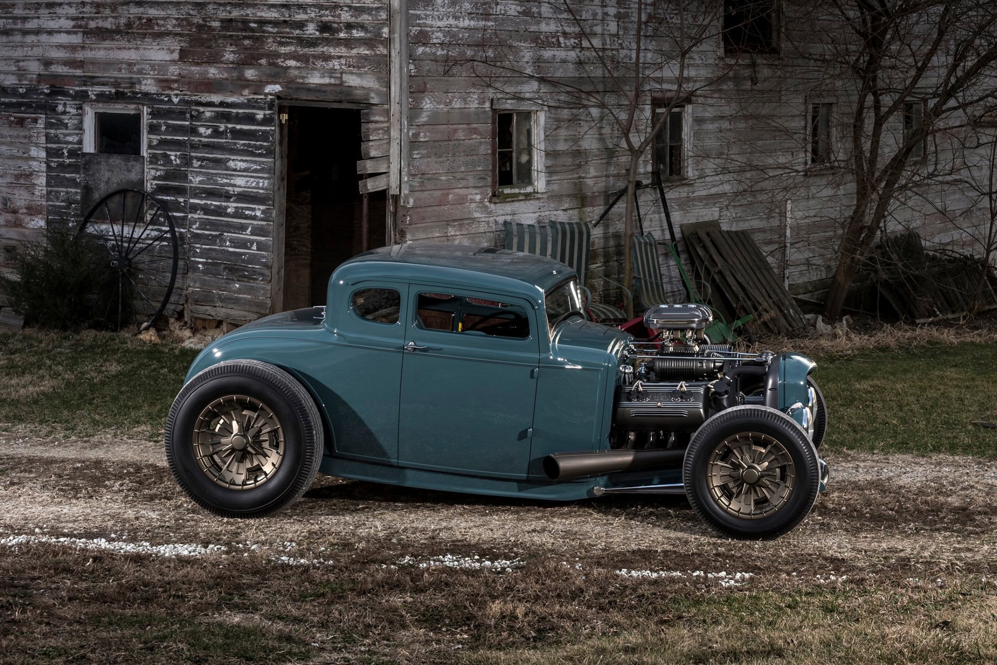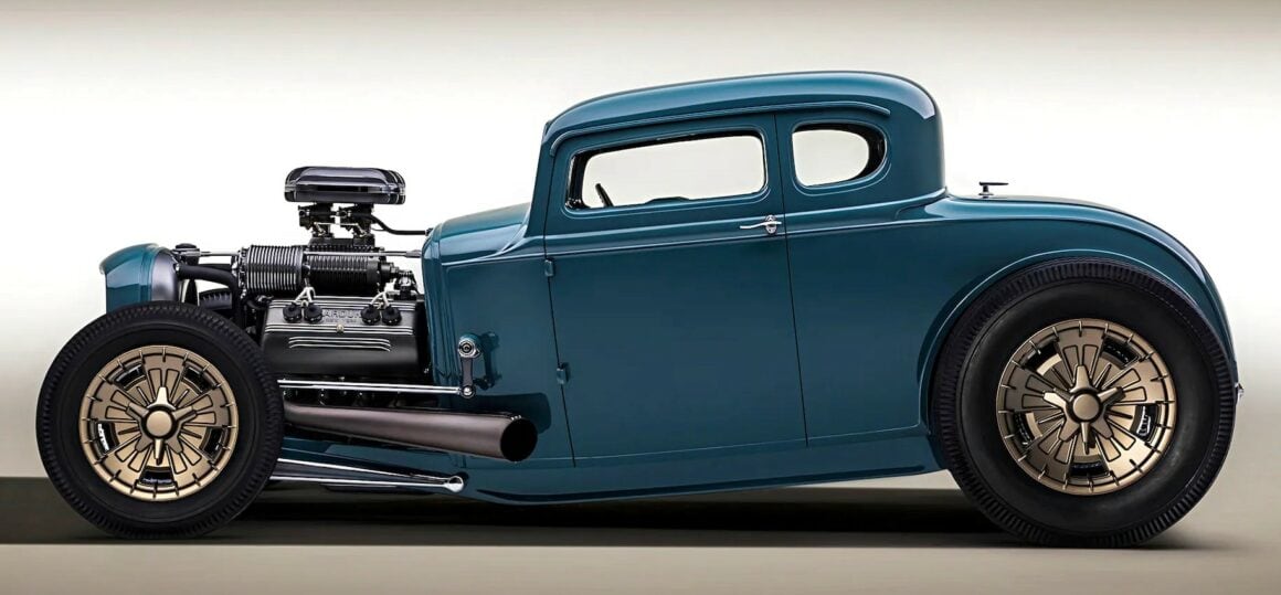 Le moteur Olds V8 284ci est un Flathead tout en aluminium équipé d’un Blower 4-71. La carrosserie a été entièrement remaniée, à un niveau de détail incroyable, pratiquement chaque pièce étant fabriquée à la main, des portes au capot. Un toit à cinq fenêtres de 1932 a été adapté à la voiture et la carrosserie a été inversée pour donner au modèle A de 1930 les proportions d’un modèle de 1932. L’arrière de la voiture a été relevé pour lui donner une position style dessin animé. Chaque panneau de carrosserie de la voiture a été modifié pour créer une forme incroyablement unique, avec une belle finition Seafoam Green appliquée par les mains du maître peintre Charley Hutton dans son studio. Le train de roulement présente une quantité aveuglante de composants chromés et présente une quincaillerie d’inspiration art-déco.