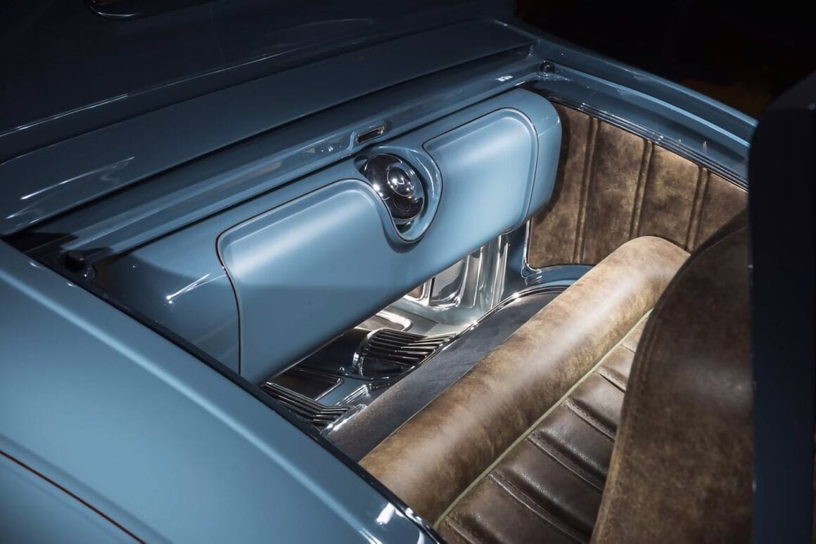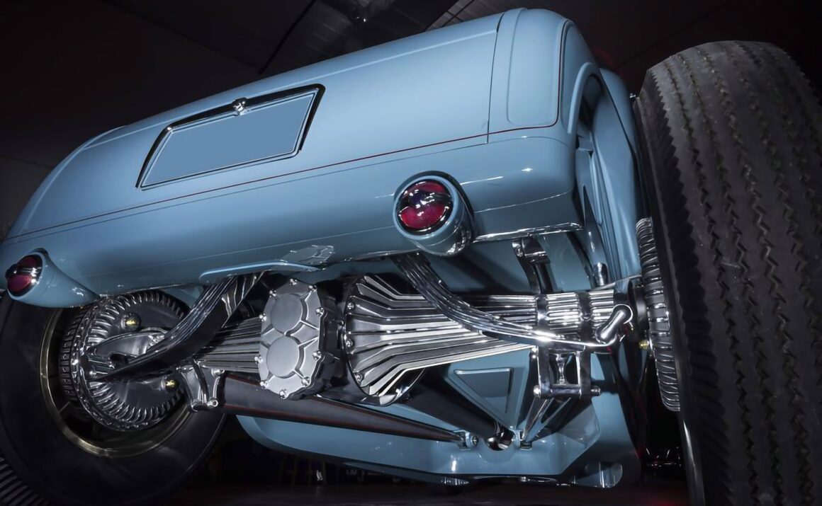 Un superbe intérieur sur mesure conçu par Tracy Weaver de Recovery Room Interiors est fini dans le cuir le plus fin, avec des compteurs d’époque. Le thème des ailerons chromés se retrouve dans tout l’intérieur. Pour lui donner cette présence parfaite de hot rod Salt Flats, la voiture roule sur de gros et hauts pneus Firestone Coker pour évoquer la voiture qu’un lycéen des années 50 aurait possédé si les parents avaient trop d’argent ! Wayne Carini a réussi à l’acheter 100.000$ avant la vente aux enchères Barrett-Jackson Scottsdale en 2020, et c’est ainsi que ce Hot Rod a été faussement attribué à Wayne Carini… Il a atteint la somme impressionnante de 302.500 $ lors de la vente… et malheureusement Wayne Carini n’a pas été correct de raconter mensongèrement que c’était lui et son atelier qui avaient réalisé ce Hot Rod qui va vraiment au-delà de toute construction de Hot Rod’s traditionnels.