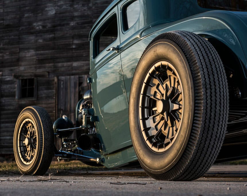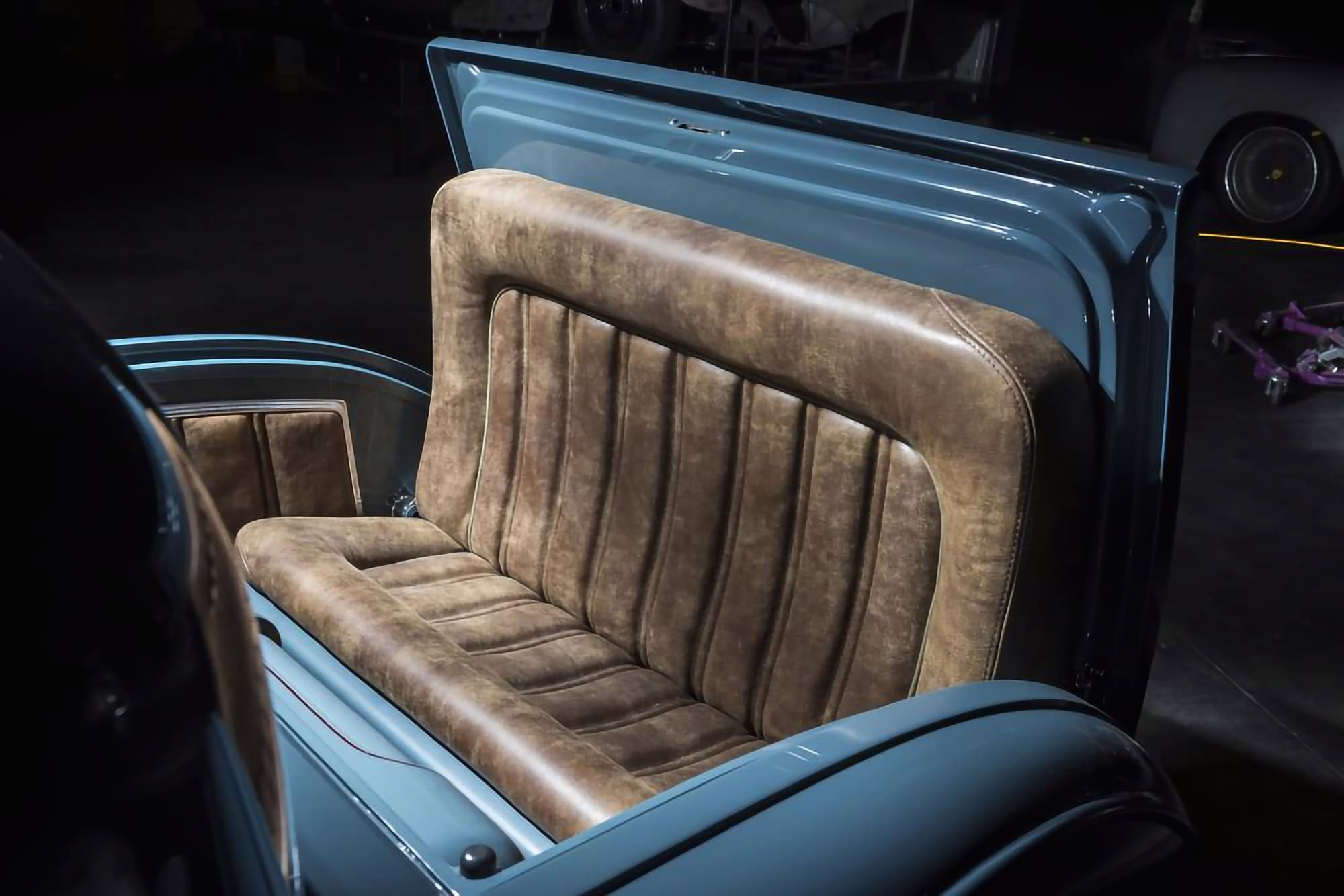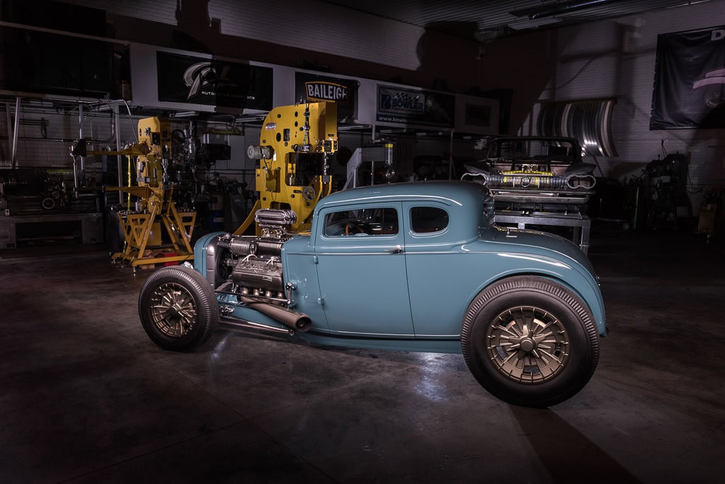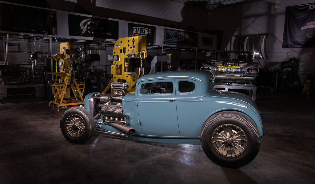 Tout a été conçu sur mesure et fabriqué à partir de zéro par TJ Zessin chez Atomic Machining. Quant à l’extérieur, avant de passer sous le pistolet au studio de couleur de Charley Hutton à Nampa, dans l’Idaho, la carrosserie de la Ford 1930 d’origine a été complètement transformée par CAL Auto (Leach avec ses collègues d’atelier Erik Hanson et Luke Ward). La quantité de travail effectué, de l’épissure de la peau de toit Deuce de 6 pouces avec rasage des sourcils à l’arrière à section inversée, aux portes affleurantes, etc., on peut dire que la carrosserie a été construite à partir de zéro ! Et bien sûr, il y a aussi plus de mécanique à l’extérieur, comme les phares (par Atomic), les feux arrière (par Bowler) et l’insert de calandre (par CAL Auto) portant un placage avancé brillant qui compense correctement le revêtement en poudre bronze satiné gracieuseté de Trail Coatings.