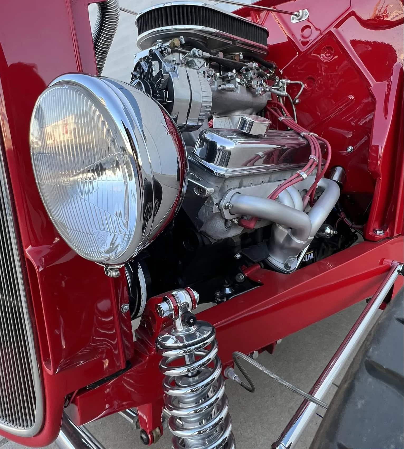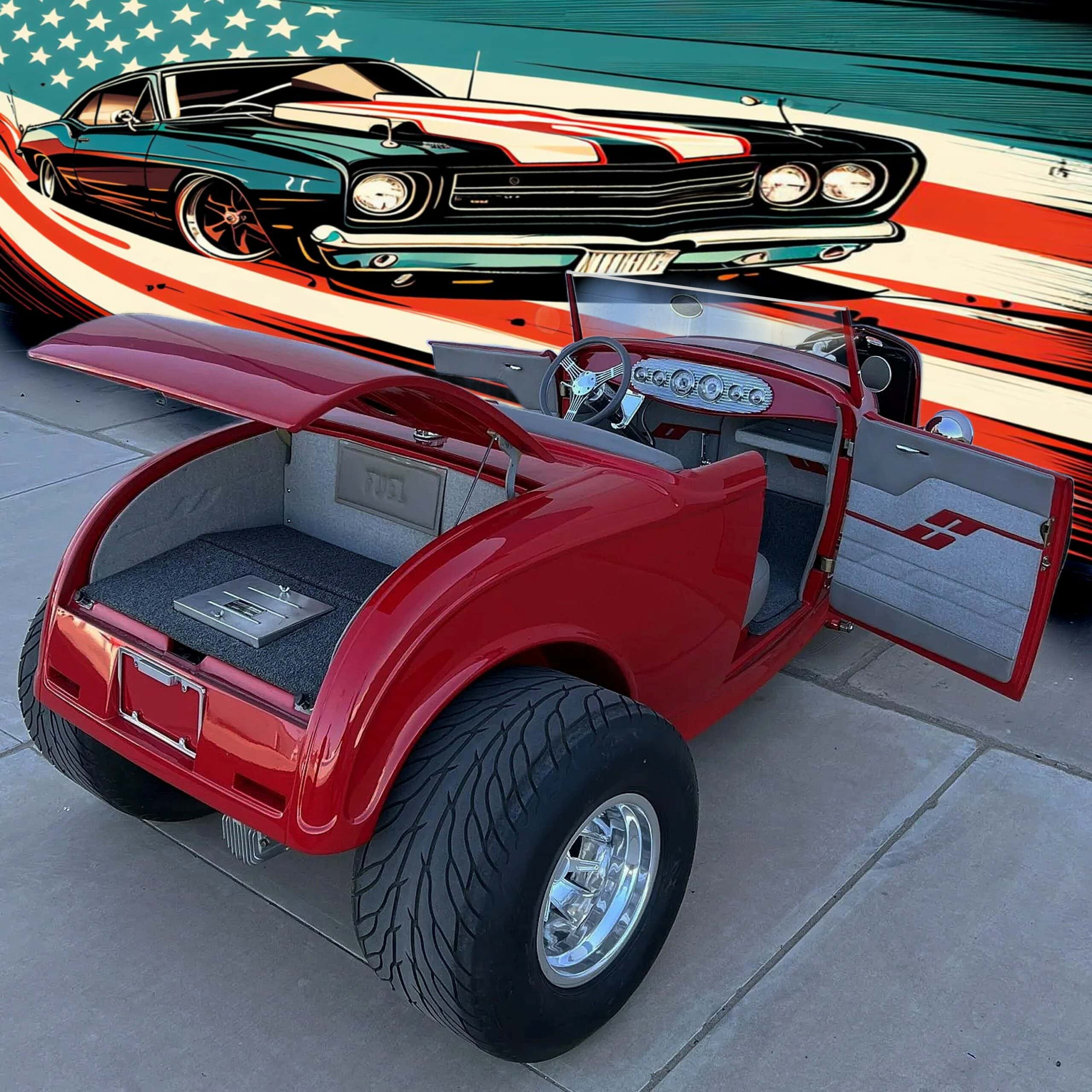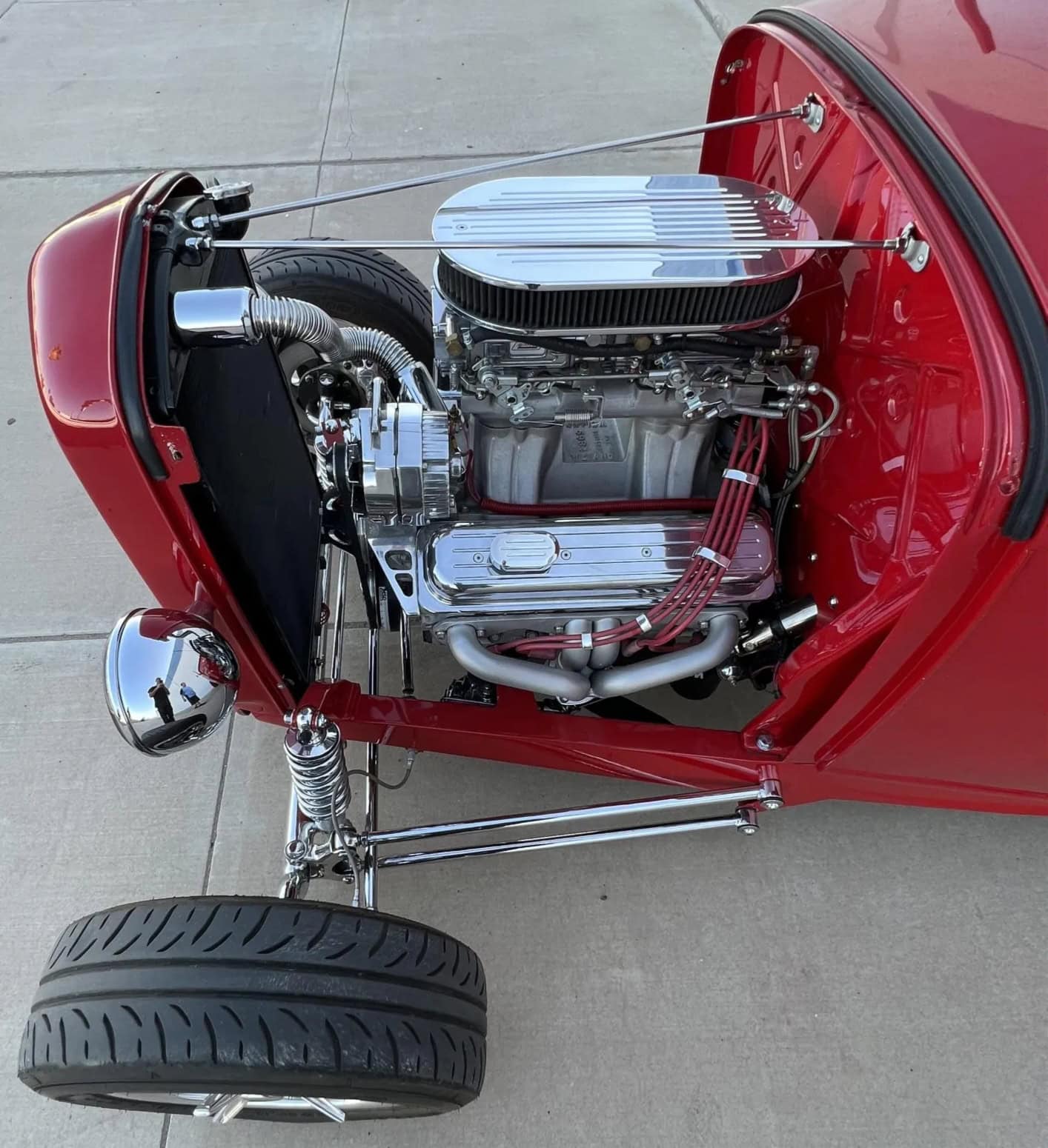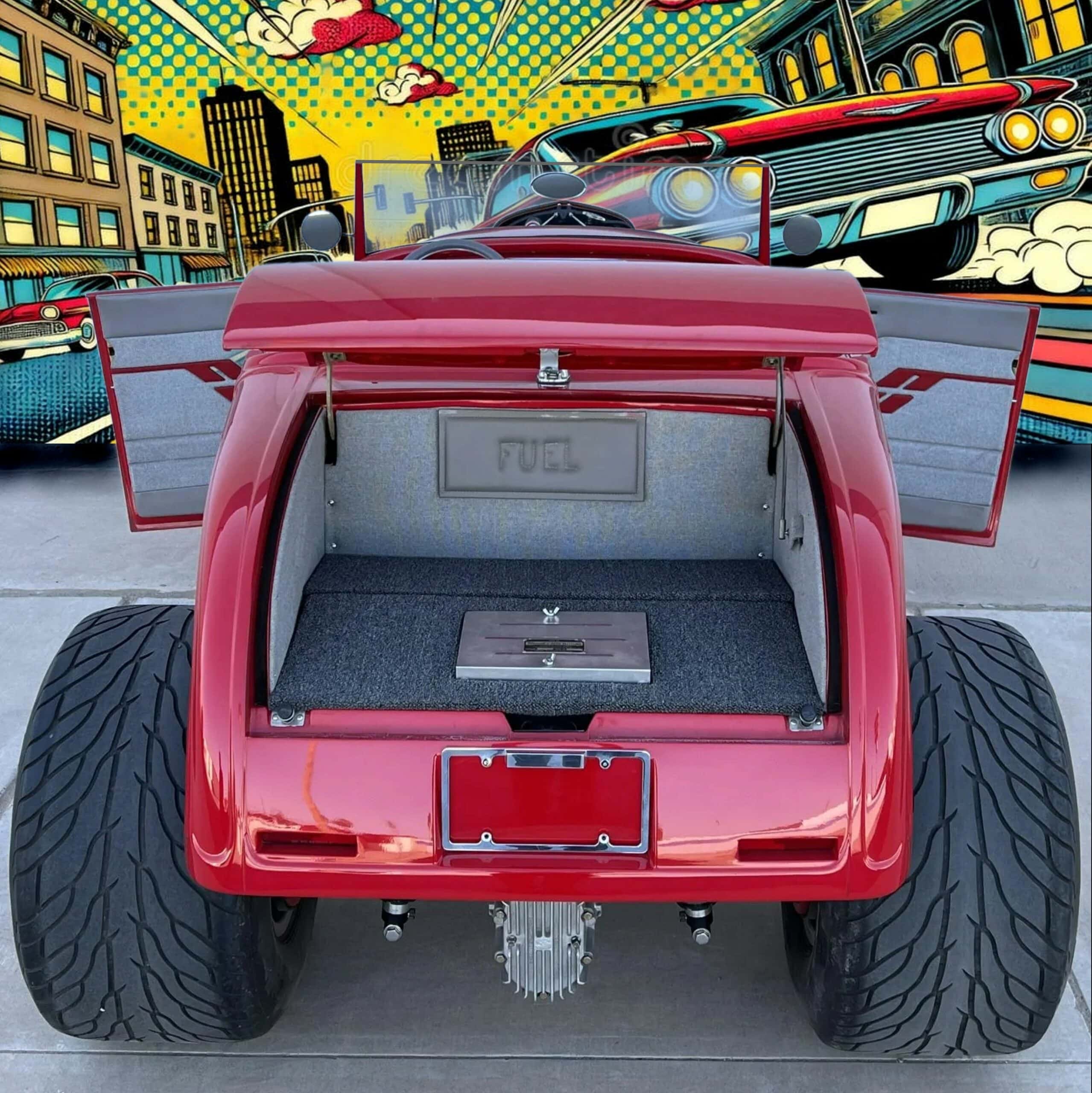 Ce Hot Rod HiBoy est motorisé d’un V8 General Motors ZZ4 de 5L7 (350ci) couplé à une transmission automatique TH350 à trois rapports. La bête arbore une robe rouge sang avec un intérieur gris. Parmi ses équipements, on s’extasie des jantes Halibrand aluminium en 14po AV et 16po AR, chaussées de pneus Dunlop “Direzza” AV et ” Mickey Thompson Sportsman S/R” 31×16po AR. Les freins sont à disques AV, et tambours AR. L’essieu avant a été surbaissé, et l’ensemble AR consiste en une suspension à quatre bras avec combinés filetés réglables. Pour la carrosserie, les poignées de porte sont lissées, les charnières sont invisibles et les rétroviseurs extérieurs sont doubles… D’autres “détails” extérieurs, sont à noter, tels les phares chromés, les clignotants intégrés à la calandre, les poignées “lissées” des portes, les charnières invisibles et les feux arrière rectangulaires encastrés et le tableau de bord en aluminium…
