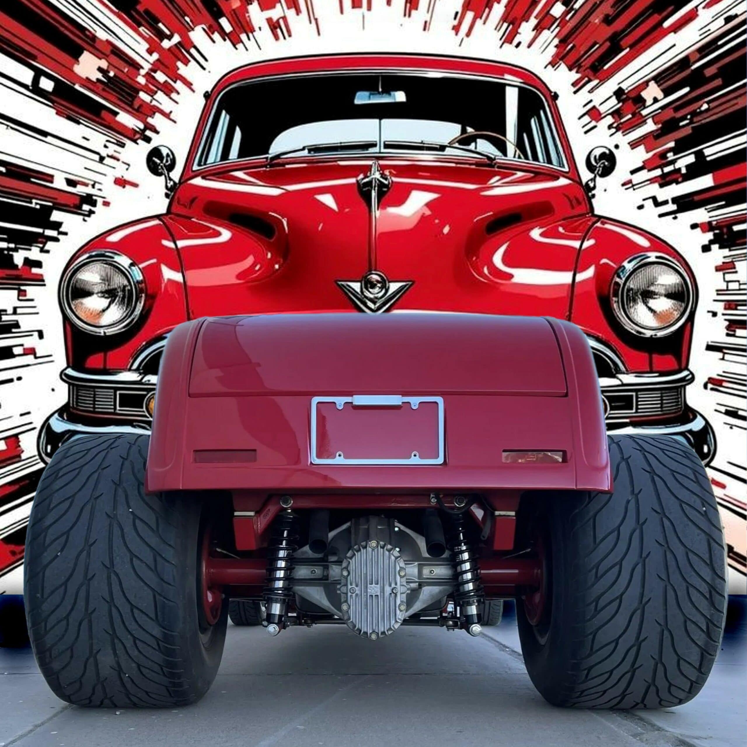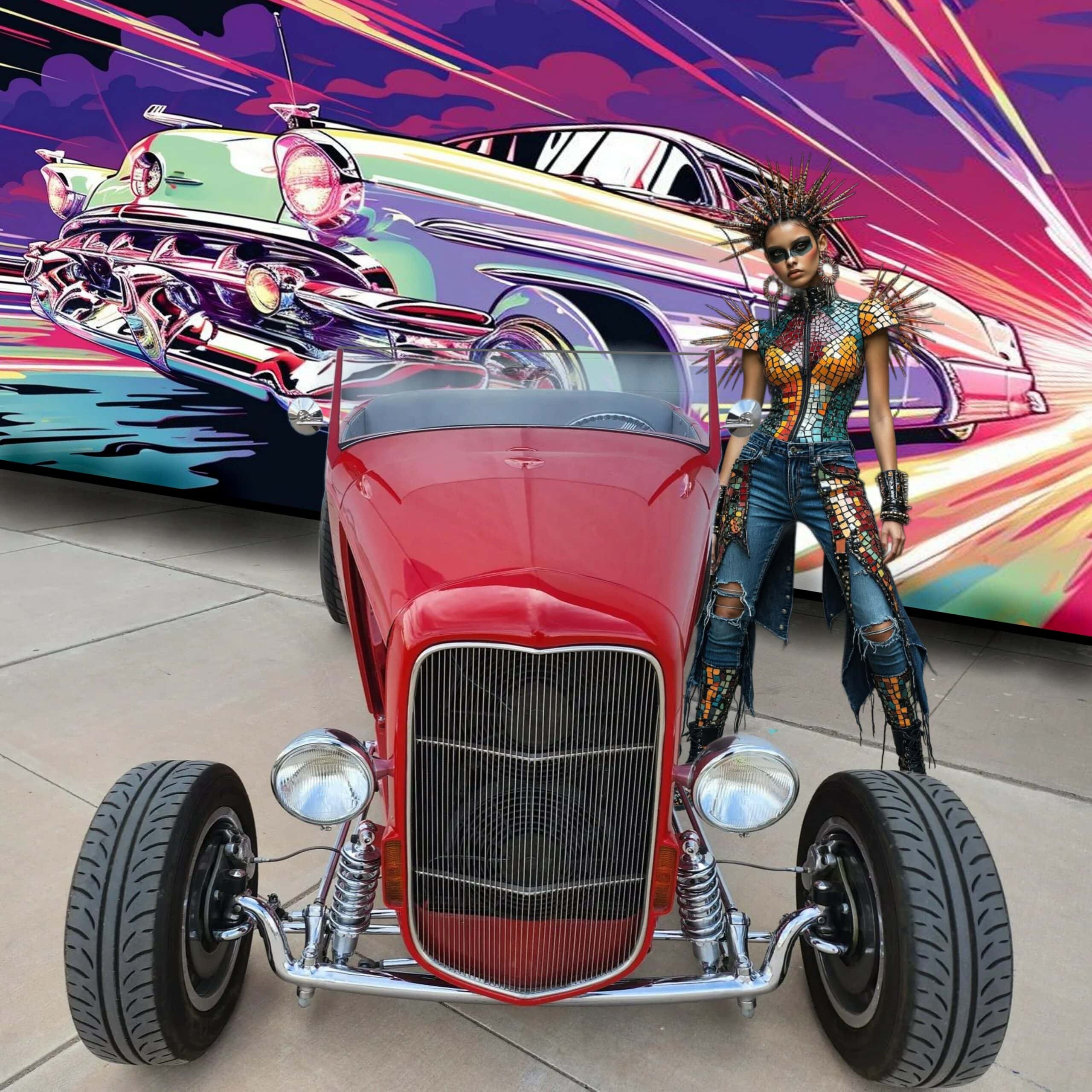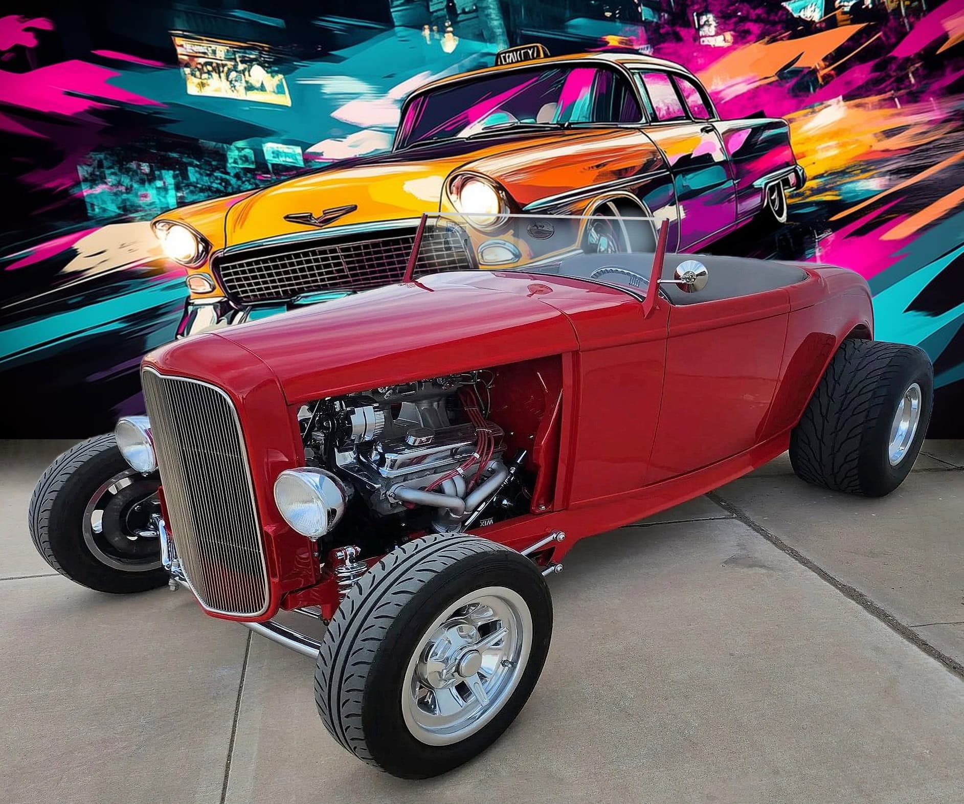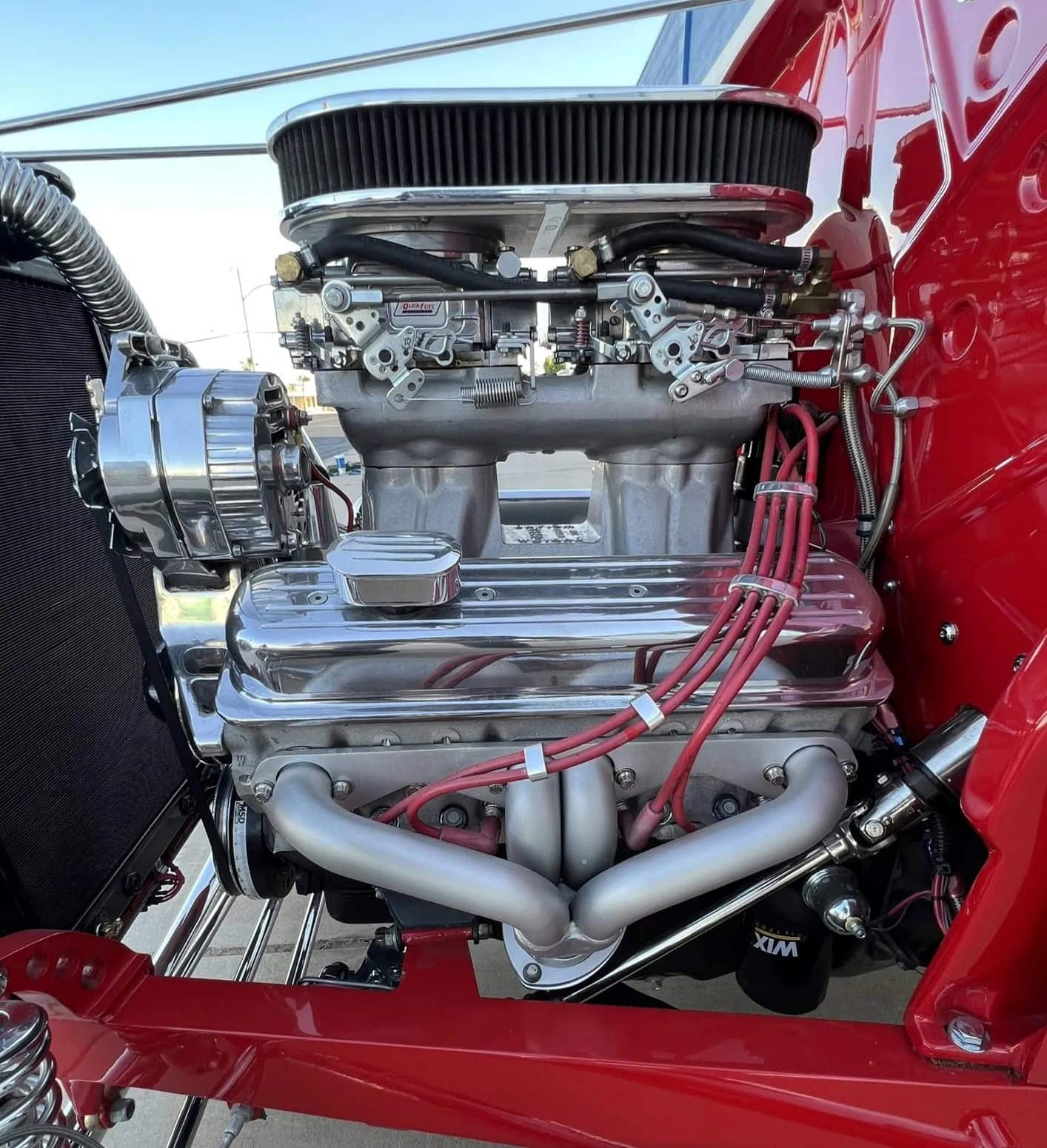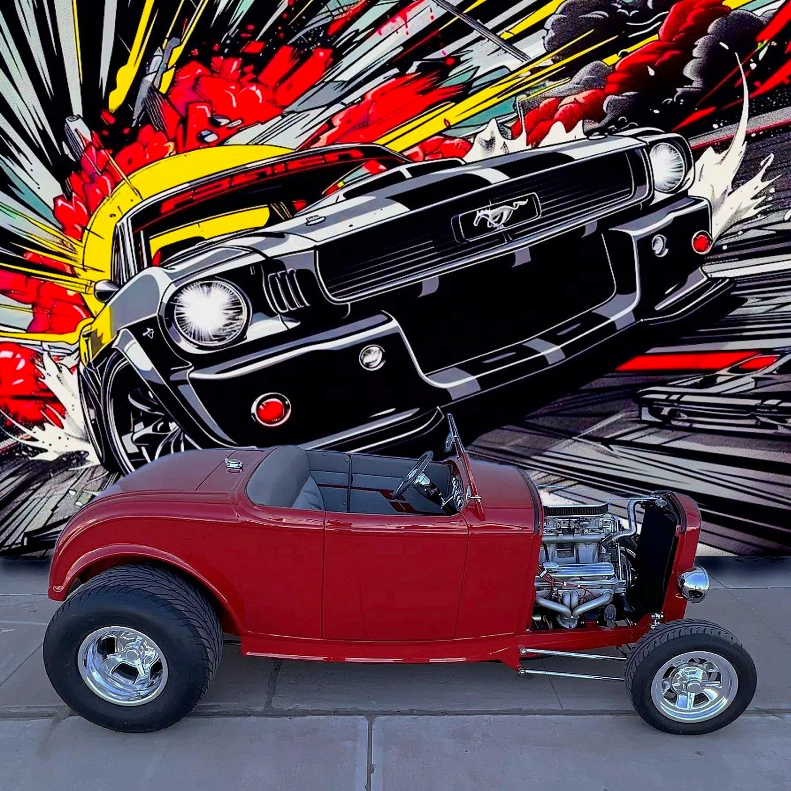 Ce Hot Rod HiBoy est motorisé d’un V8 General Motors ZZ4 de 5L7 (350ci) couplé à une transmission automatique TH350 à trois rapports. La bête arbore une robe rouge sang avec un intérieur gris. Parmi ses équipements, on s’extasie des jantes Halibrand aluminium en 14po AV et 16po AR, chaussées de pneus Dunlop “Direzza” AV et ” Mickey Thompson Sportsman S/R” 31×16po AR. Les freins sont à disques AV, et tambours AR. L’essieu avant a été surbaissé, et l’ensemble AR consiste en une suspension à quatre bras avec combinés filetés réglables. Pour la carrosserie, les poignées de porte sont lissées, les charnières sont invisibles et les rétroviseurs extérieurs sont doubles… D’autres “détails” extérieurs, sont à noter, tels les phares chromés, les clignotants intégrés à la calandre, les poignées “lissées” des portes, les charnières invisibles et les feux arrière rectangulaires encastrés et le tableau de bord en aluminium…