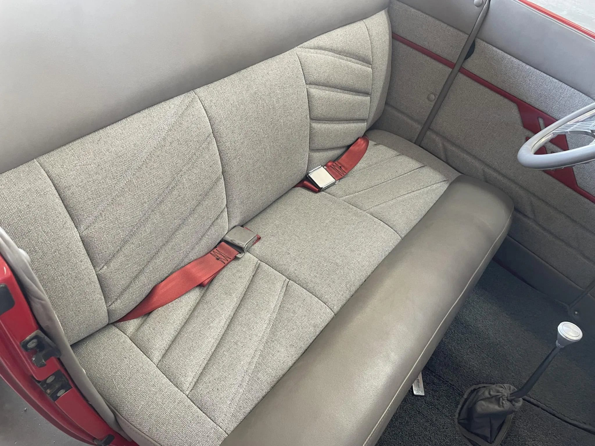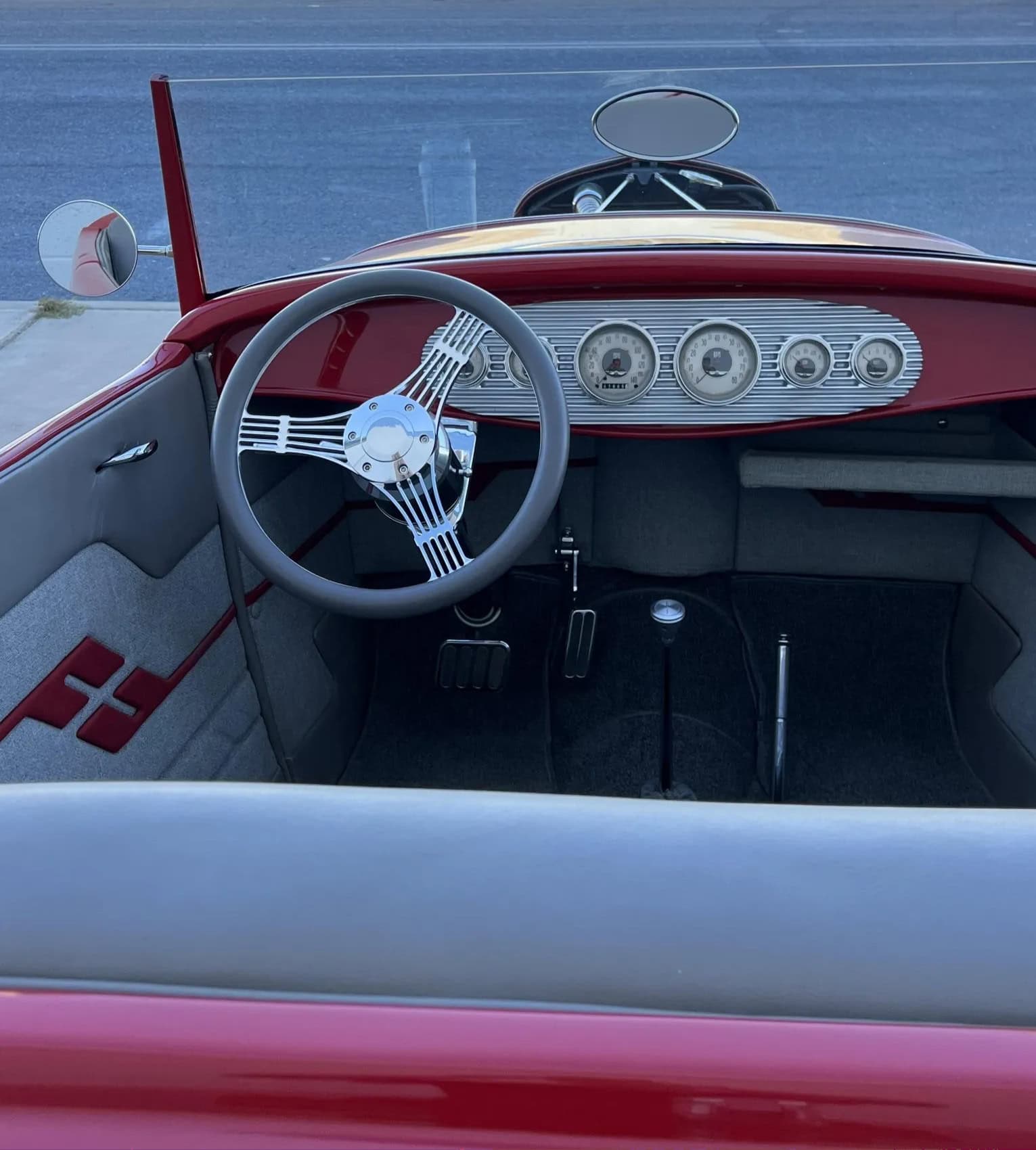 L’habitacle est doté d’une banquette fixe revêtue de vinyle gris avec des empiècements en tweed, des touches bordeaux et des ceintures de sécurité ventrales. On y trouve également un faux levier de vitesses manuelles qui commande en réalité une boite automatique, le pommeau et diverses garnitures du tableau de bord étant en aluminium usiné, de même qu’une plage arrière côté passager. Le contacteur d’allumage est caché sous le siège conducteur. Le volant de type “Banjo” en aluminium est monté sur une colonne de direction “Indidit” inclinable elle aussi en aluminium usiné, le tout faisant le “dos rond” devant le tableau de bord remplis de compteurs “Classic Instruments All American Nickel”… comprenant un compteur de vitesse gradué jusqu’à 140 mph et un compte-tours flanqué d’auxiliaires que je vous laisse tout loisir de détailler en agrandissant les photos en un click… C’est simple à faire…