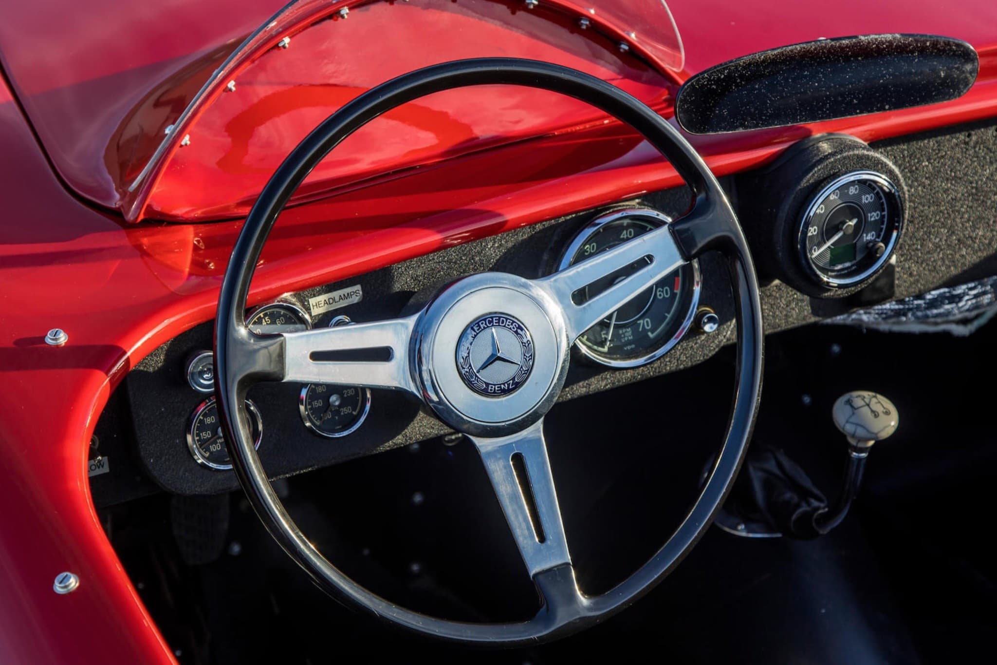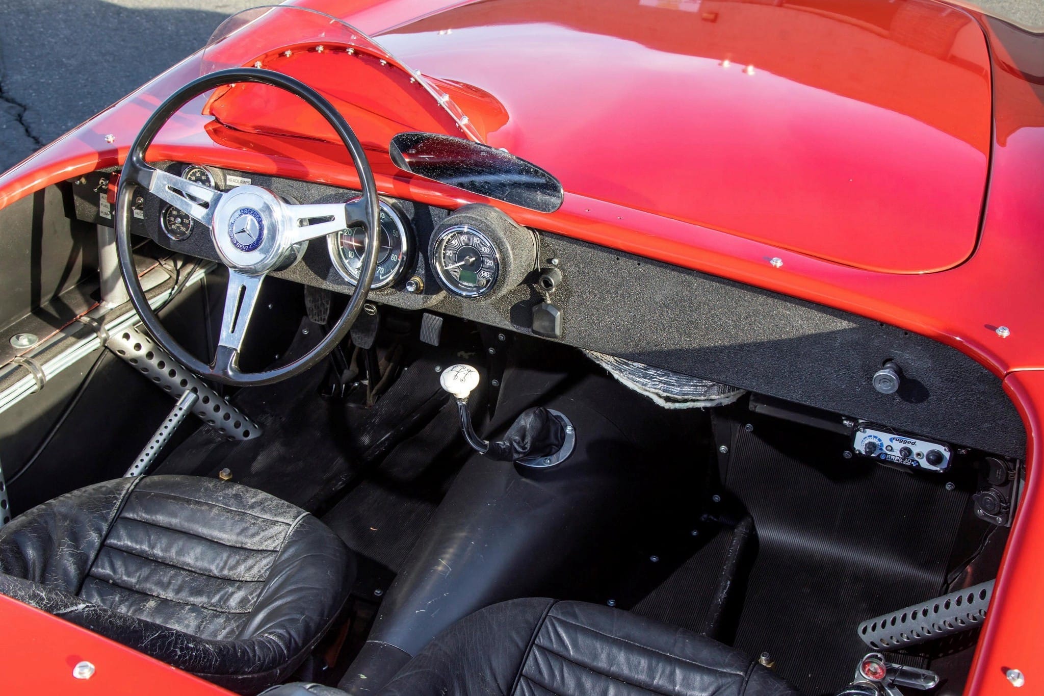 Où l’ont-ils récupéré ? C’est la grande question ! Mais à la fin de l’année 1955 le duo enlève le moteur XK pour le remplacer par un moteur de Mercedes 300 SL…. un 6 cylindres en ligne à injection de 240 chevaux qui avait été préparé en vue des Mille Miglia…. la voiture y gagne un logo Mercedes sur le capot et un autre sur le volant… Mercedes n’y est pour rien, le public croit que les deux compères font partie du “Team-Usine-Mercedes”… mais le châssis ne supporte pas cette puissance… les freins en particulier n’arrivent plus à stopper l’auto… on la retrouve cependant en 1957, gagnante d’une course à La Junta, pilotée par Kircher….