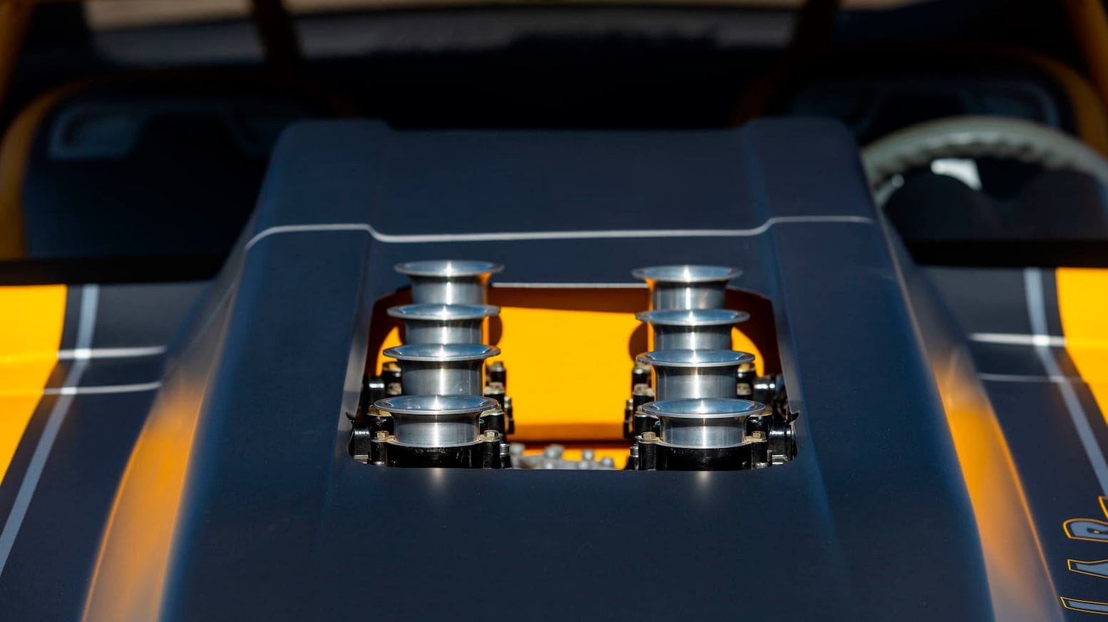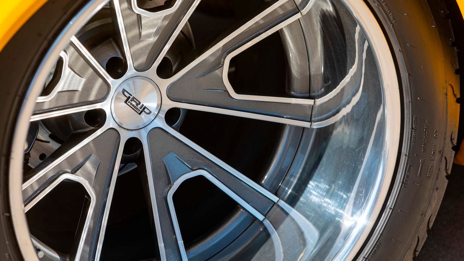 Un renflement massif du capot a été nécessaire pour couvrit le 360 CI Chevrolet small-bloc V-8 équipé de Holley EFI. La face avant entièrement personnalisée comprend des feux de route “Rigid Industries” incorporant 175 LED intégrés dans la calandre. Le châssis est de type Racing entièrement en tubes “Martz”. Les pneus arrière sont des Mickey Thompson montés sur des jantes “Forgeline-Grudge” de 20 pouces. Les freins à disque sont des “Wilwood” de 13 pouces.