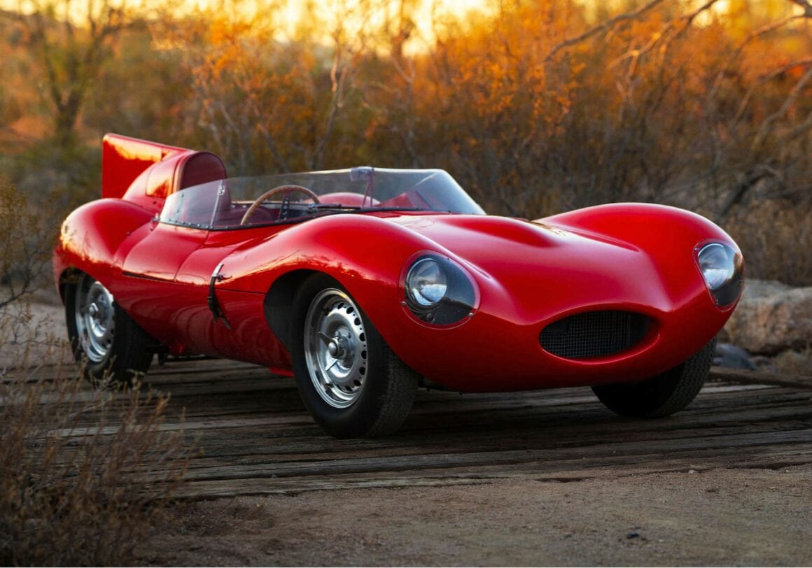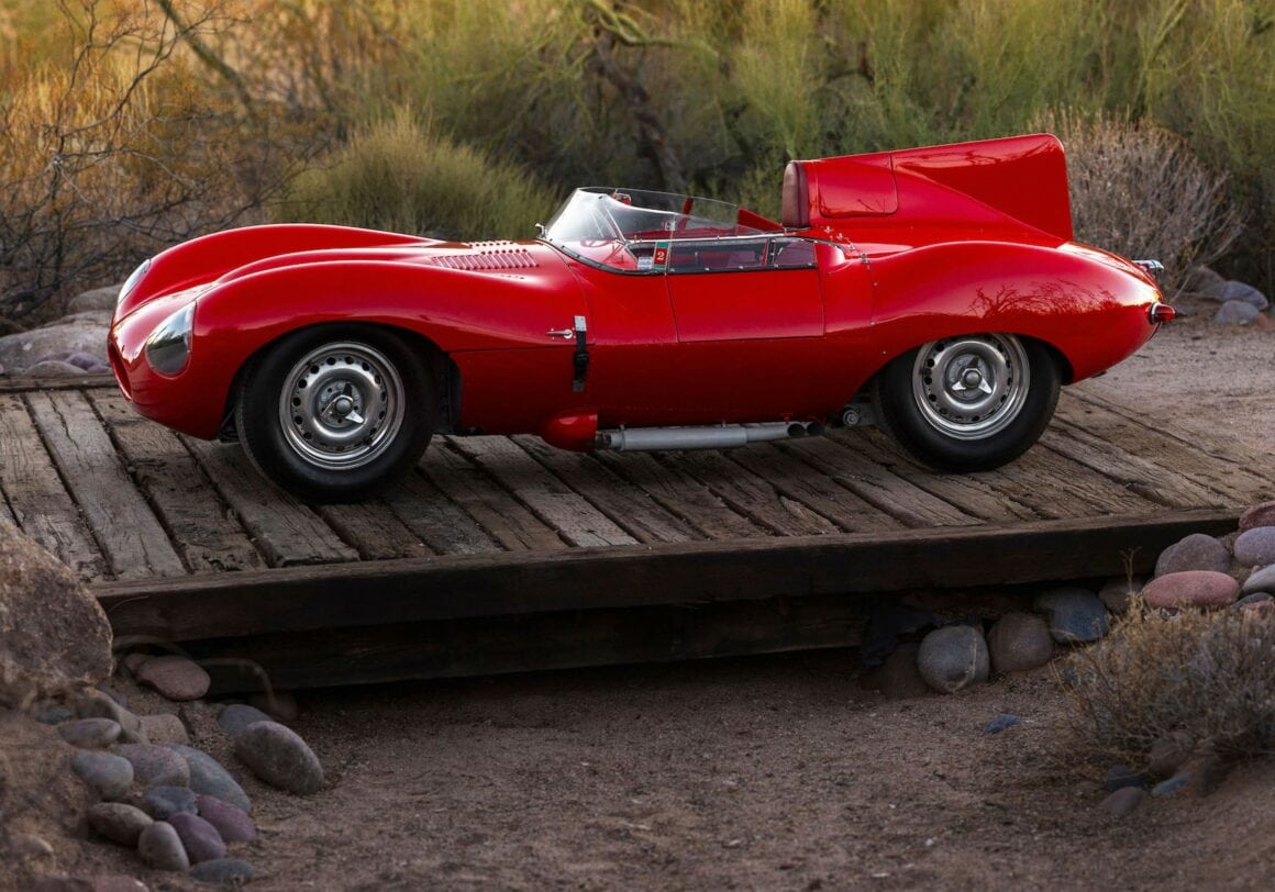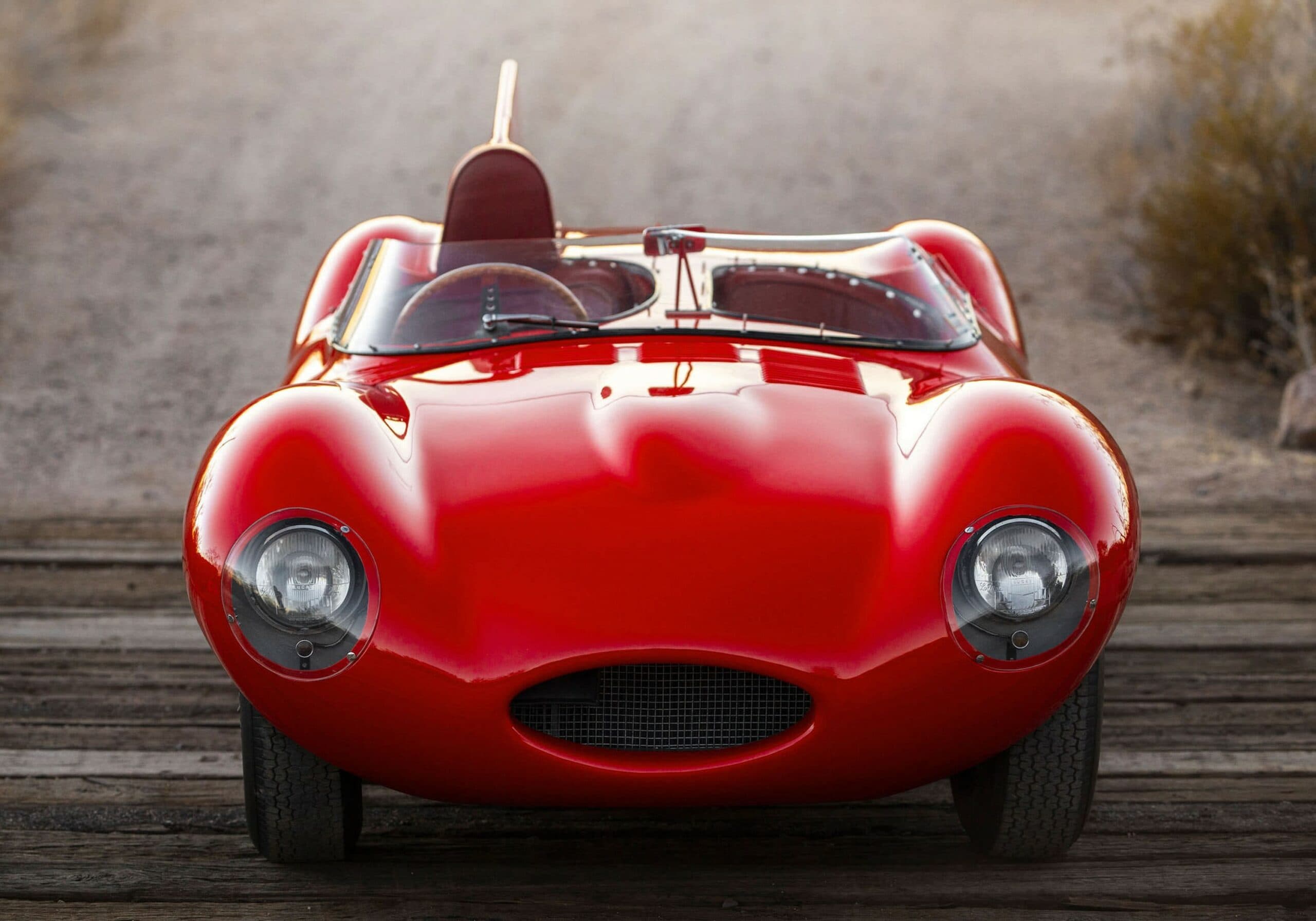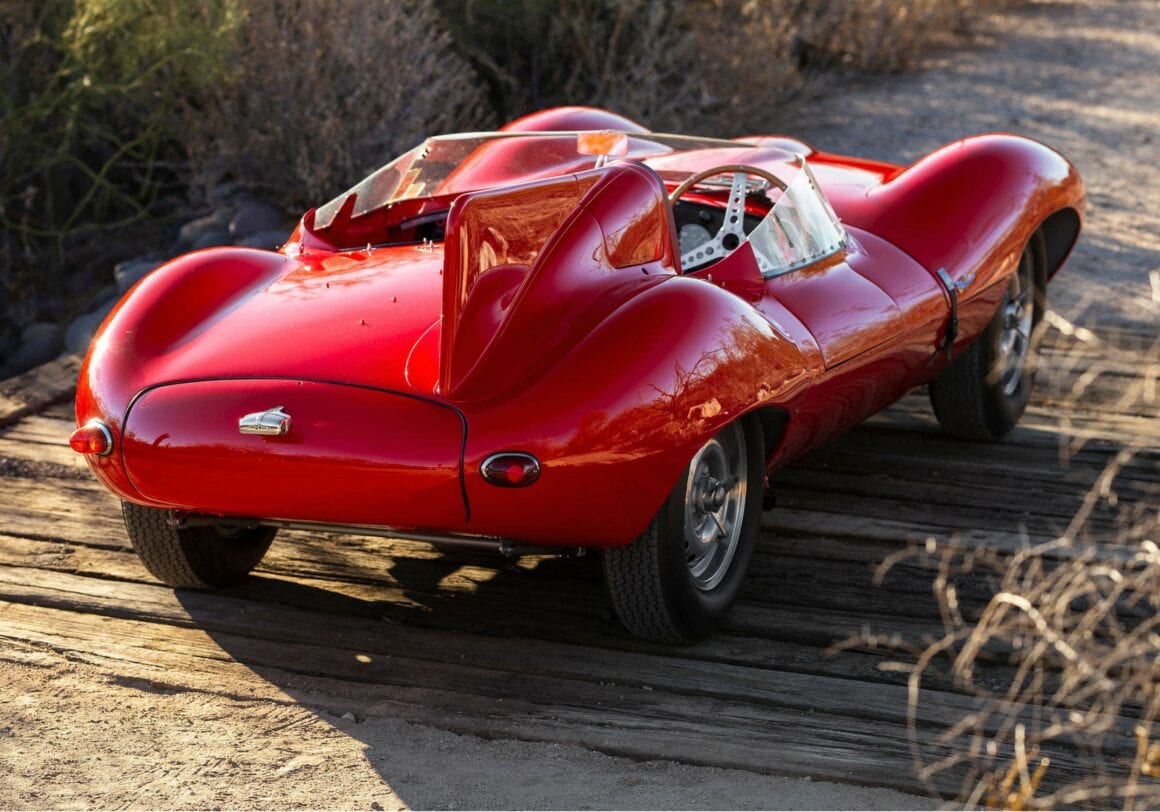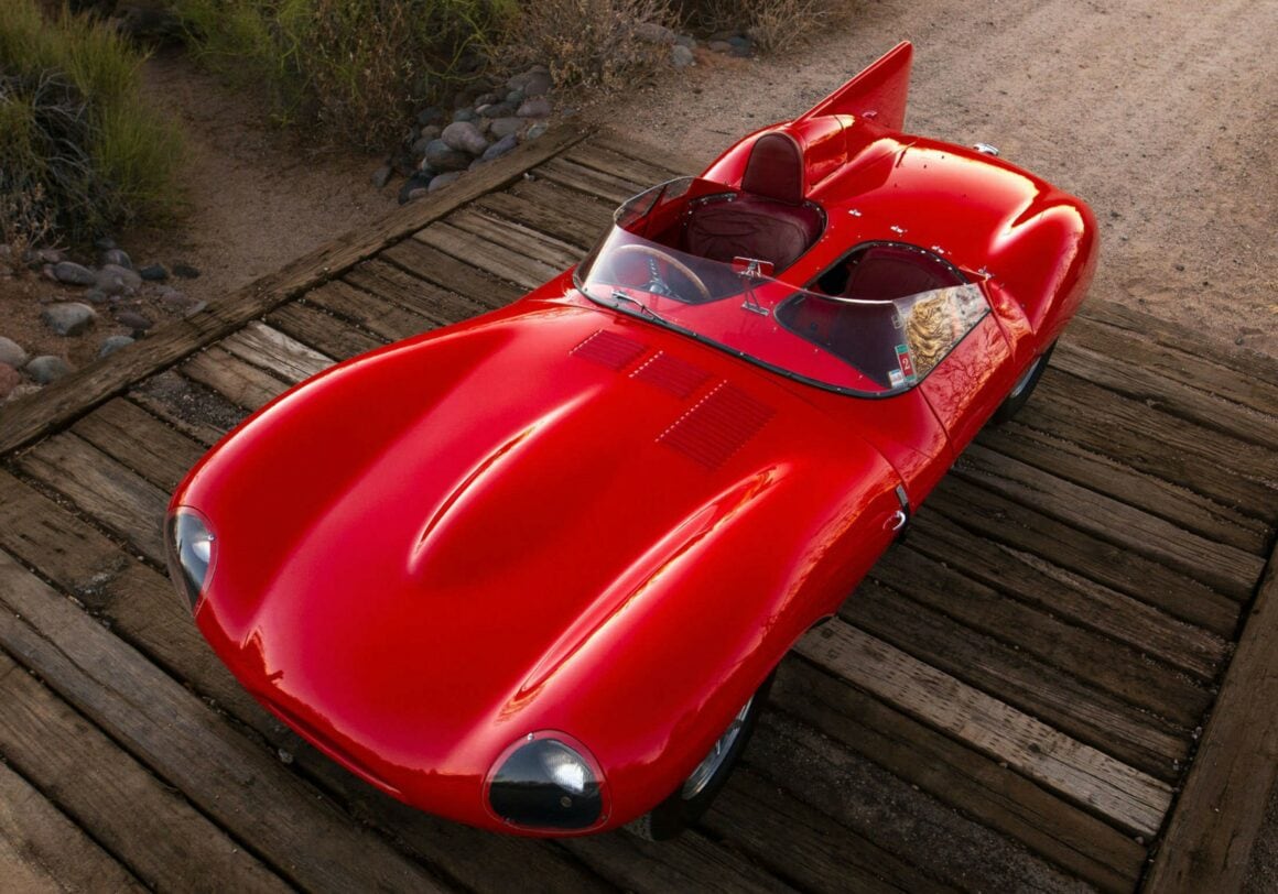 La Jaguar D-Type qui illustre (magistralement) cet article, est remarquable pour un certain nombre de raisons, peut-être la plus notable d’entre-elles est sa couleur, un rouge vif très inhabituel plutôt que le plus commun “British Racing Green” de course britannique. La voiture a été livrée neuve au garage Jaguar-Henlys de Manchester, en Angleterre, en 1955, où elle est restée invendue durant 10 ans, elle a finalement été achetée au rabais par un vendeur d’automobiles d’occasion avant qu’il devienne le milliardaire de la F1, du nom de… Bernie Ecclestone (oui, que Bernie Ecclestone !)… Ecclestone l’a vendue au coureur Peter Blond pour £3,500 qui a remporté quelques victoires à Snetterton, Aintree, Silverstone, Oulton Park, et Goodwood. Blond va ensuite vendre la voiture à Jonathan Sieff en août 1957… Sieff a continué à courir avec la voiture et a obtenu la deuxième place à Full Sutton en Juillet 1958. Après la saison de course 1959, Jonathan Sieff a vendu à la voiture à Monty Mostyn de Speedwell Garage et, après une brève période dans les mains de John Houghton, elle a été acquise par le coureur Jean Bloxham qui a remporté un prix à Goodwood en Mars et en avril 1961 elle a couru à Silverstone en mai, terminant troisième… Une petite pause respiration et je continue…