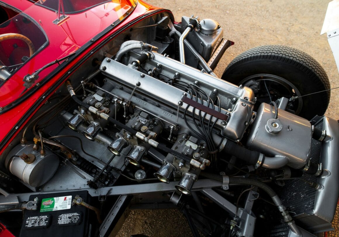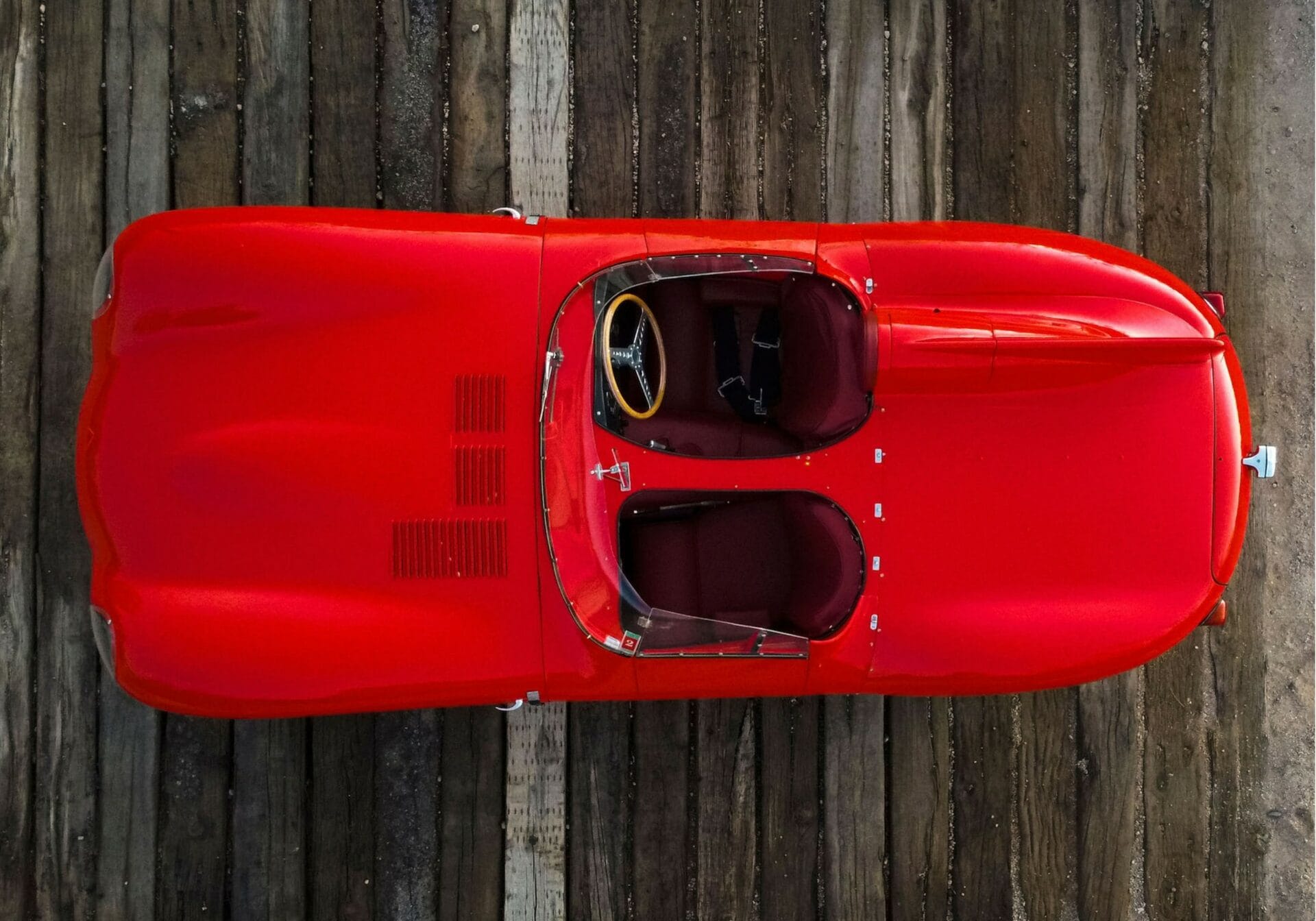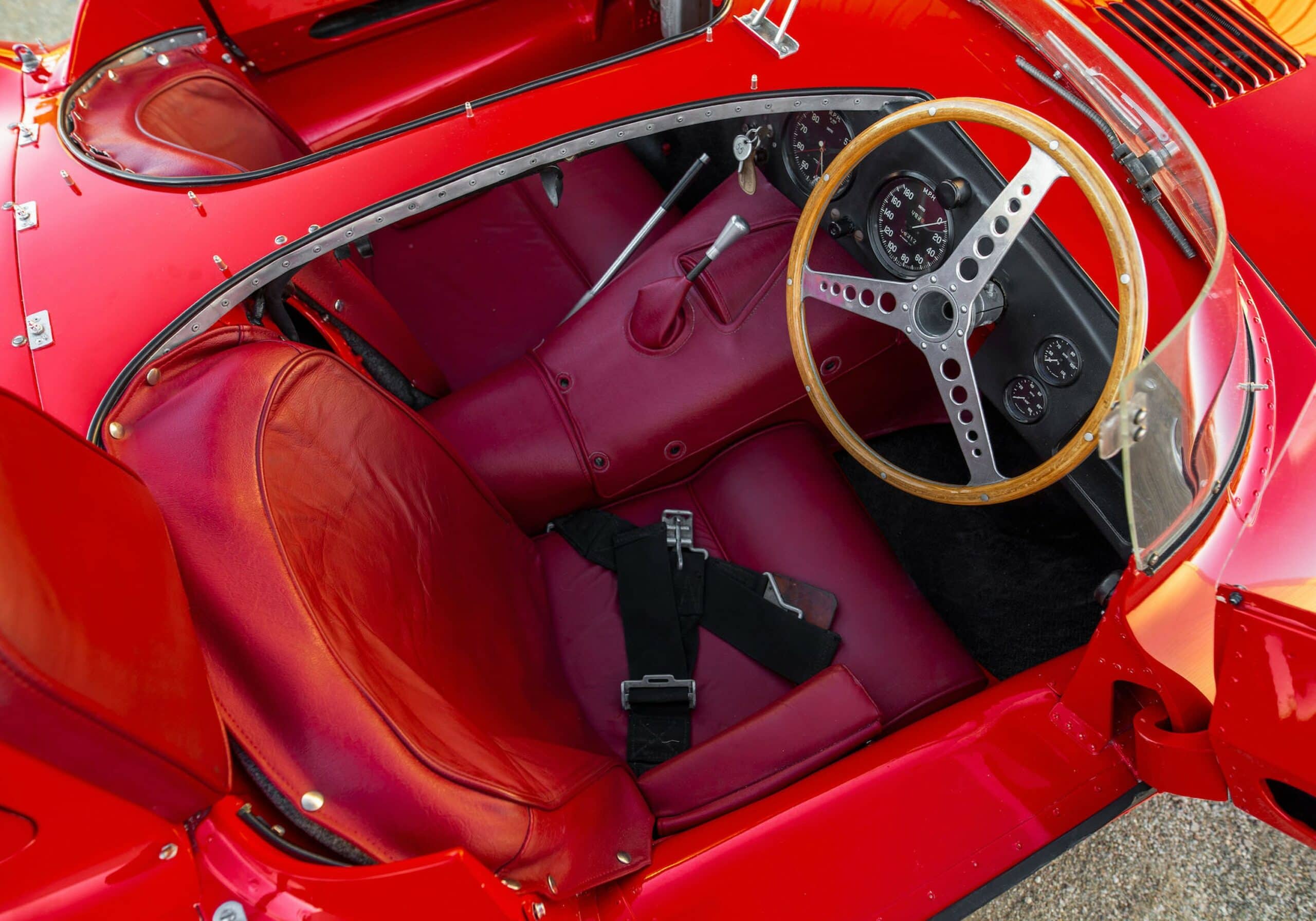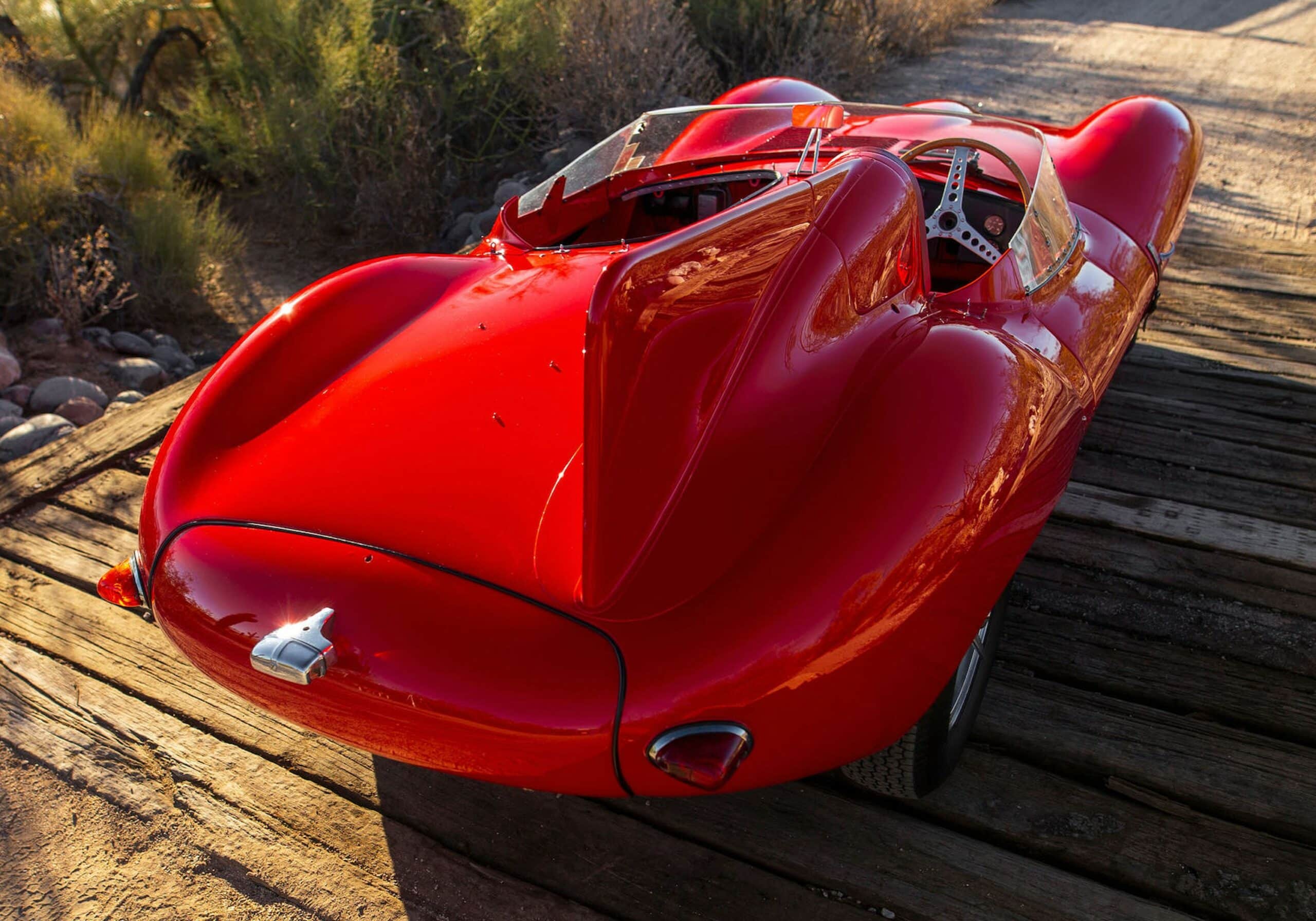 La Jaguar D-Type qui illustre (magistralement) cet article, est remarquable pour un certain nombre de raisons, peut-être la plus notable d’entre-elles est sa couleur, un rouge vif très inhabituel plutôt que le plus commun “British Racing Green” de course britannique. La voiture a été livrée neuve au garage Jaguar-Henlys de Manchester, en Angleterre, en 1955, où elle est restée invendue durant 10 ans, elle a finalement été achetée au rabais par un vendeur d’automobiles d’occasion avant qu’il devienne le milliardaire de la F1, du nom de… Bernie Ecclestone (oui, que Bernie Ecclestone !)… Ecclestone l’a vendue au coureur Peter Blond pour £3,500 qui a remporté quelques victoires à Snetterton, Aintree, Silverstone, Oulton Park, et Goodwood. Blond va ensuite vendre la voiture à Jonathan Sieff en août 1957… Sieff a continué à courir avec la voiture et a obtenu la deuxième place à Full Sutton en Juillet 1958. Après la saison de course 1959, Jonathan Sieff a vendu à la voiture à Monty Mostyn de Speedwell Garage et, après une brève période dans les mains de John Houghton, elle a été acquise par le coureur Jean Bloxham qui a remporté un prix à Goodwood en Mars et en avril 1961 elle a couru à Silverstone en mai, terminant troisième… Une petite pause respiration et je continue…