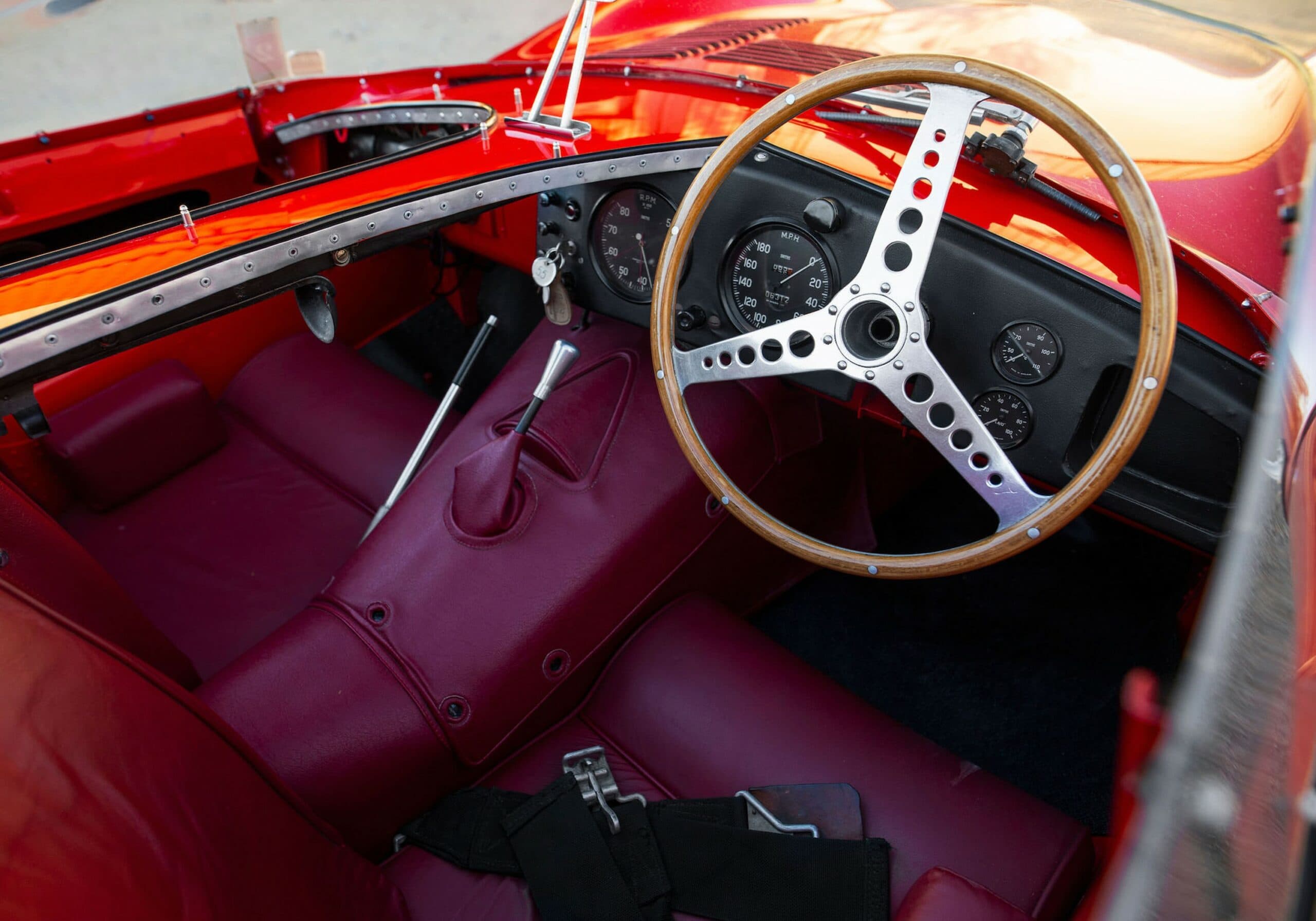 Une fois la clé tournée dans son barillet, les pompes à carburant commencent à chuchoter en amorçant les triples Weber. La sortie d’échappement semble exploser puis émet un rugissement incomparable. Faut laisser la bête se réchauffer en admirant les courbes voluptueuses du capot vues au travers du Perspex qui sert de coupe-vent plutôt que de pare-brise ! L’habitacle semble alors un endroit émouvant qui évoque immédiatement dans ma tête des images du légendaire Mike Hawthorn qui a mené la Jaguar D-Type à la victoire (voyez la vidéo)