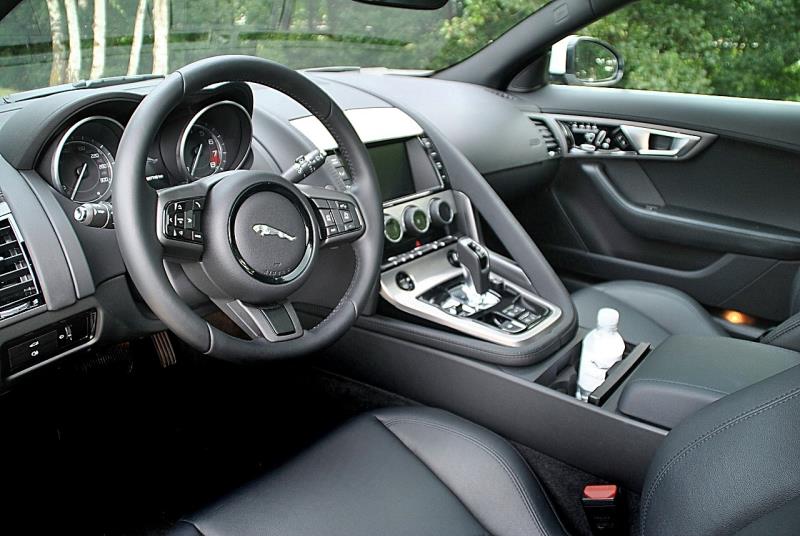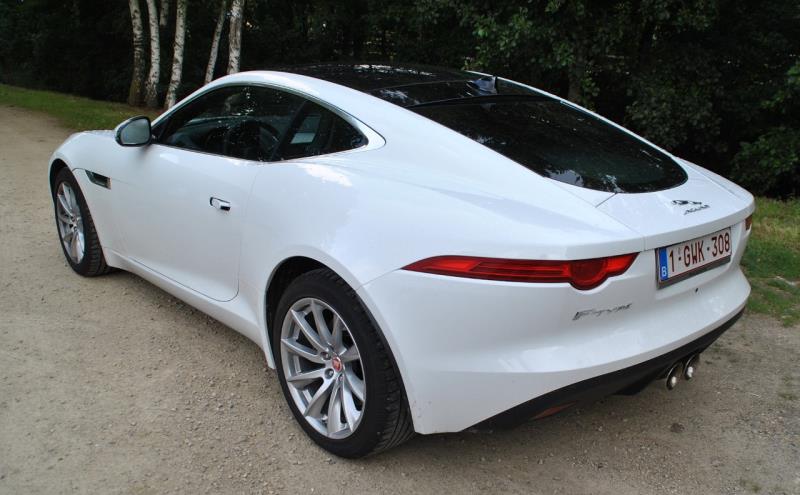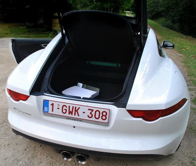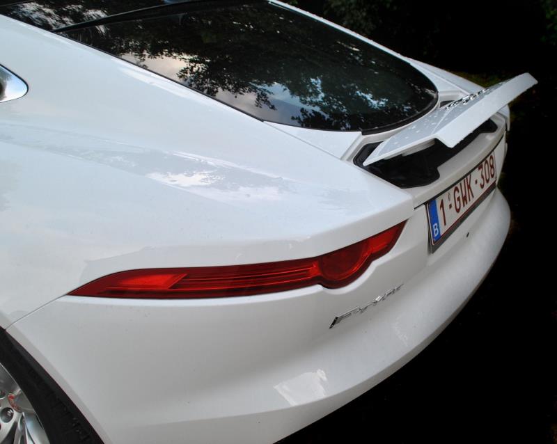 Avec le coupé, plus rien de tout cela, on revient au sublime du genre classique, on se replonge dans les racines de la E type mais on la réinvente, d’où ce design particulièrement bien réussi avec un capot aussi long que la piste d’envol d’un porte avions, des hanches bien musclées, une partie arrière tout à fait dans l’esprit de la grand-mère, avec une double sortie centrale d’échappement ainsi qu’un aileron qui se déploie à partir de 100 km/h, créant 120 kg de portance supplémentaire… et enfin un coffre digne de ce nom (capacité de l’ordre de 400 litres) s’ouvrant via un hayon pouvant être motorisé (une autre option), la porte latérale arrière de la E type, c’est bel et bien du passé…