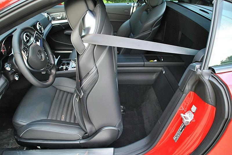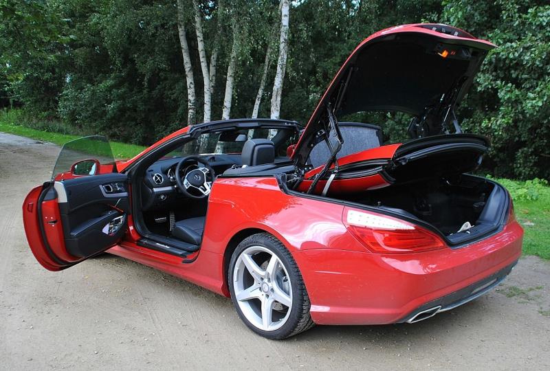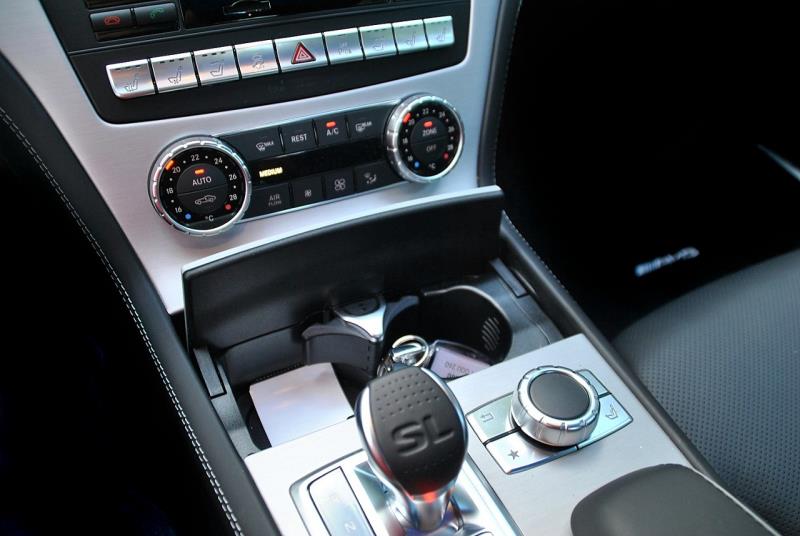 A bord de la SL 400, nettement plus chère, il est vrai, pas de sentiment de claustrophobie grâce notamment au toit amovible transparent (qui peut s’assombrir en fonction de la luminosité, on appelle cela le Magic Sky Control : 3.147 €, ça commence)…, selon que le toit soit fermé ou bien ouvert, la capacité du coffre varie de 365 à 500 litres, mais prière de voyager avec des sacs souples, plus faciles à caser…, en revanche, la caméra de recul n’est facturée que 309 €…, mais les sièges multi-contour (un must) se négocient à 1.185 €… et pour le chauffage de nuque, prière de rajouter 679 € !